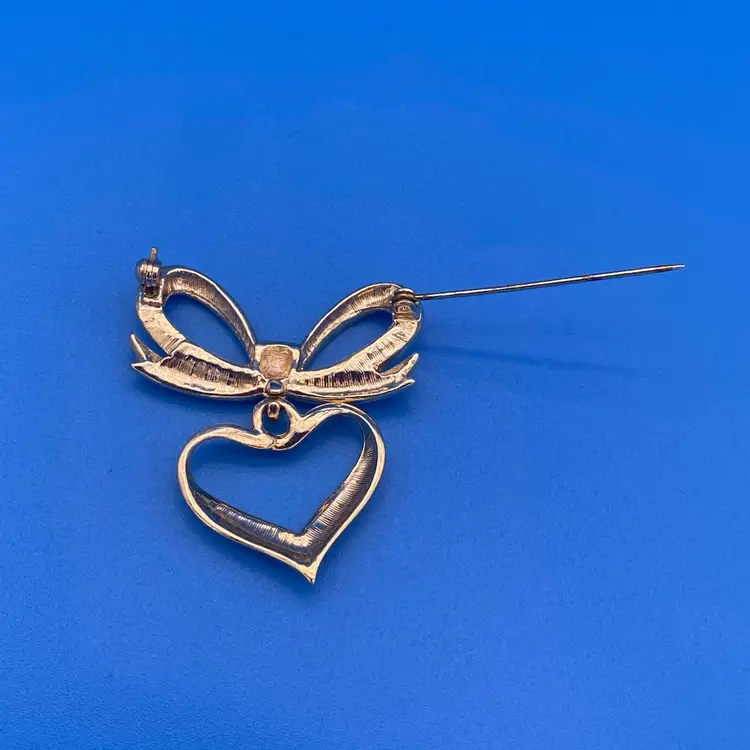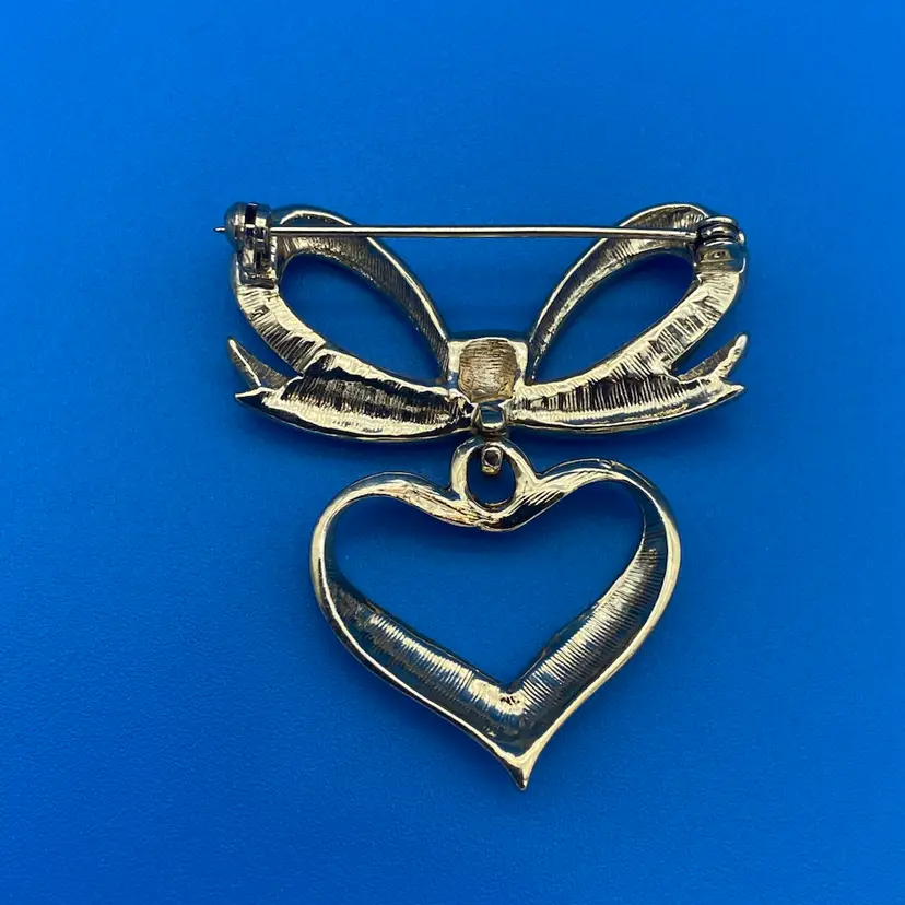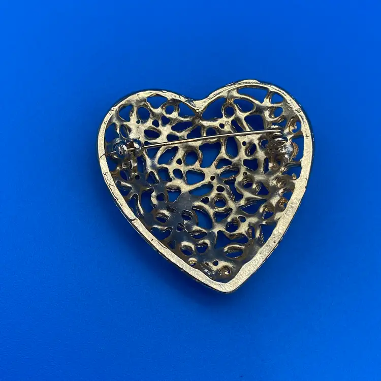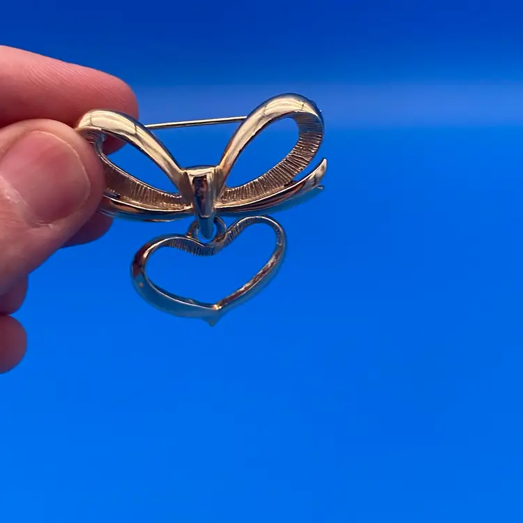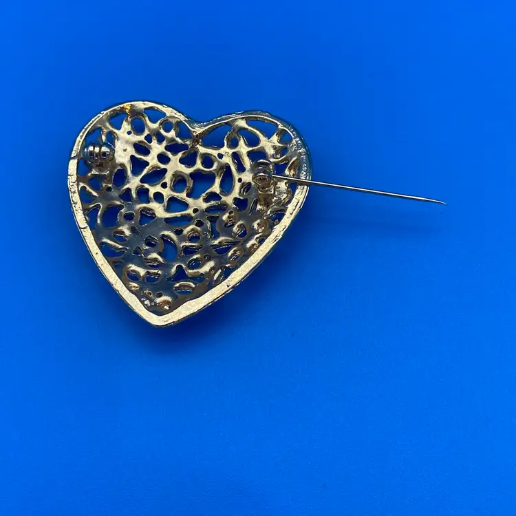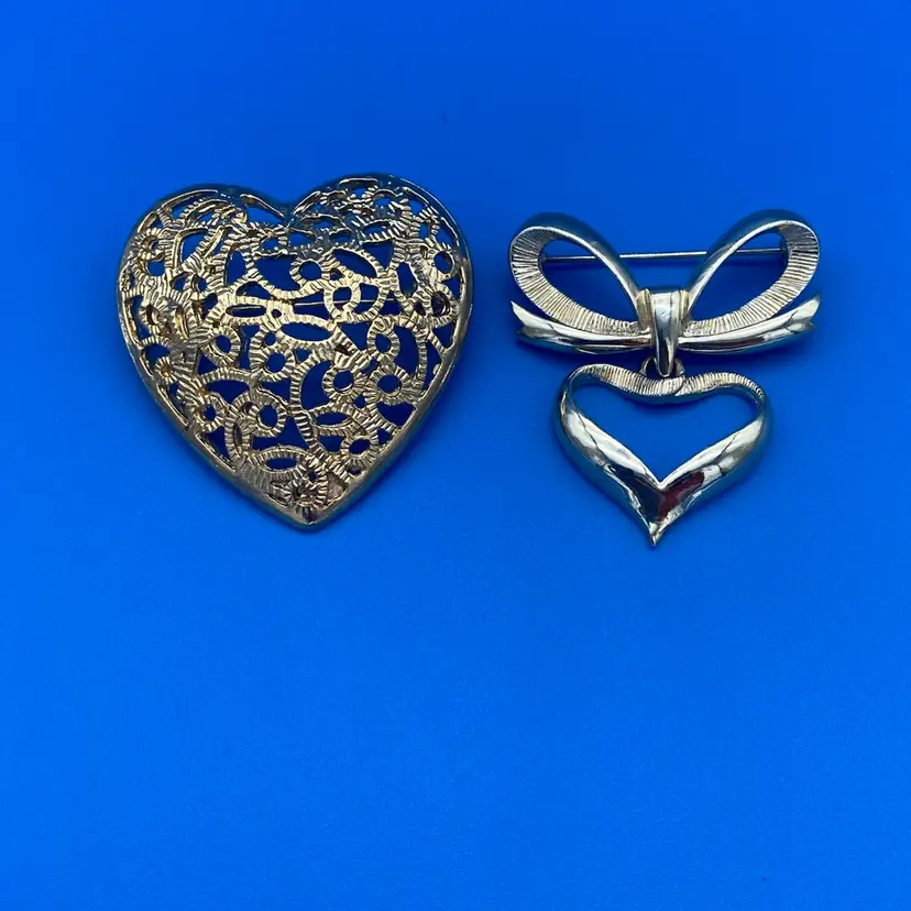 You are purchasing a pair of Gold-Tone Heart Themed Brooches. The Dangled one is around 2 inches tall and 1.5 inches wide. The other is around 2 inches tall and 1.75 inches wide. These Brooches are in excellent condition with no cracks, bends, staining or breaks of the material.