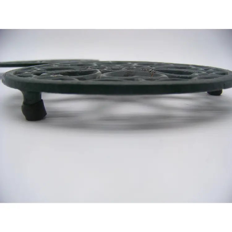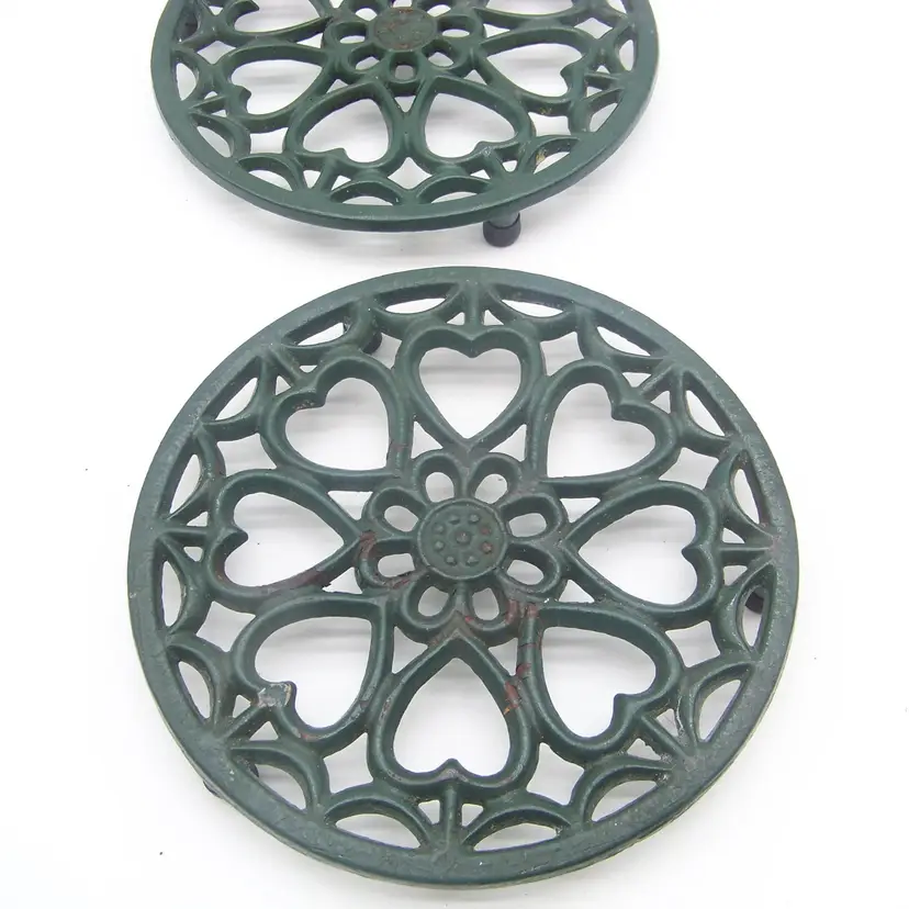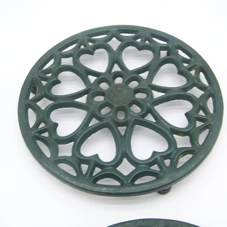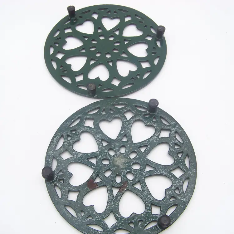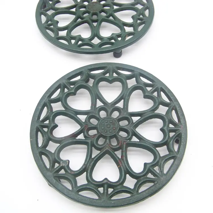 Vintage pair of 2 green cast iron trivets with heart design. They are a dark green and one of them shows some paint chipping on front and back..The other is in very good condition. They are 6" diameter and .75" tall.