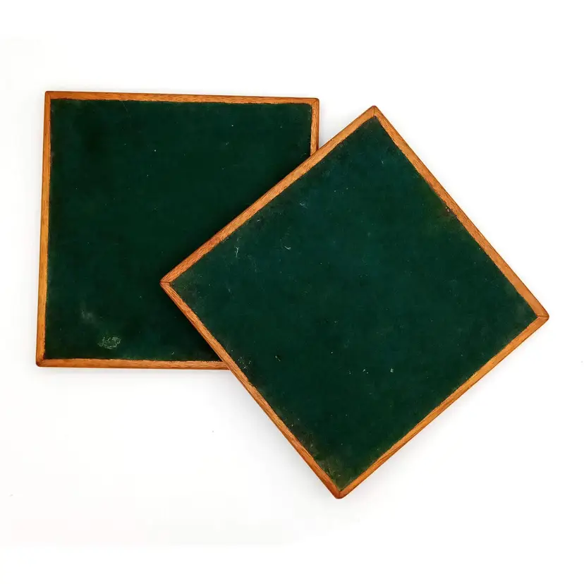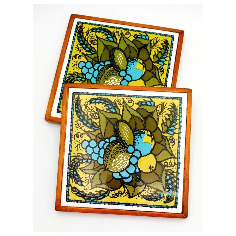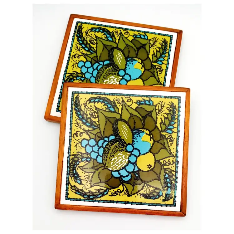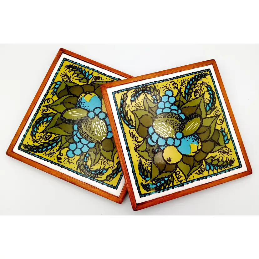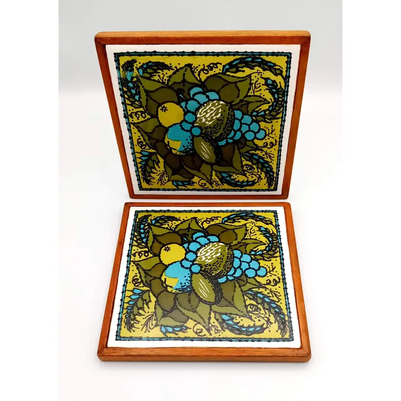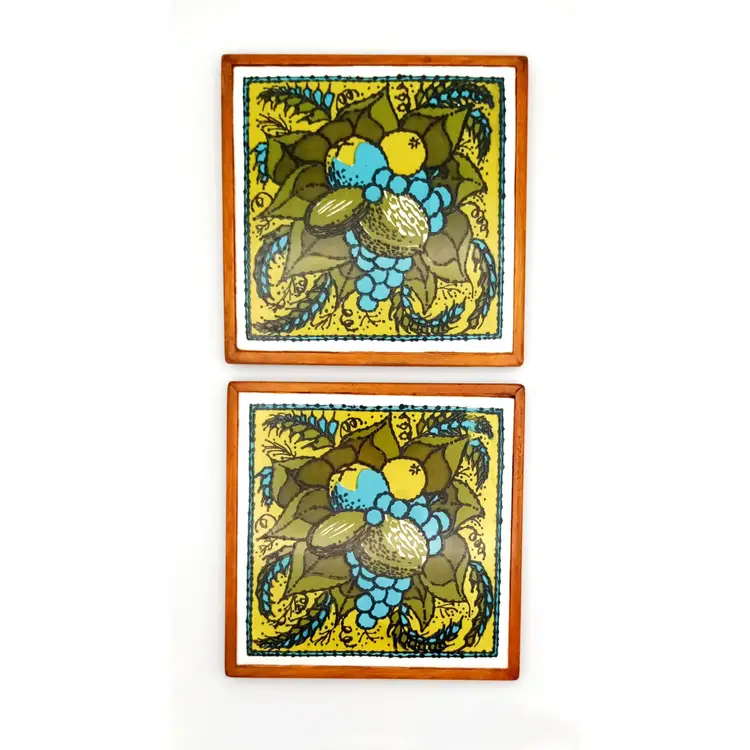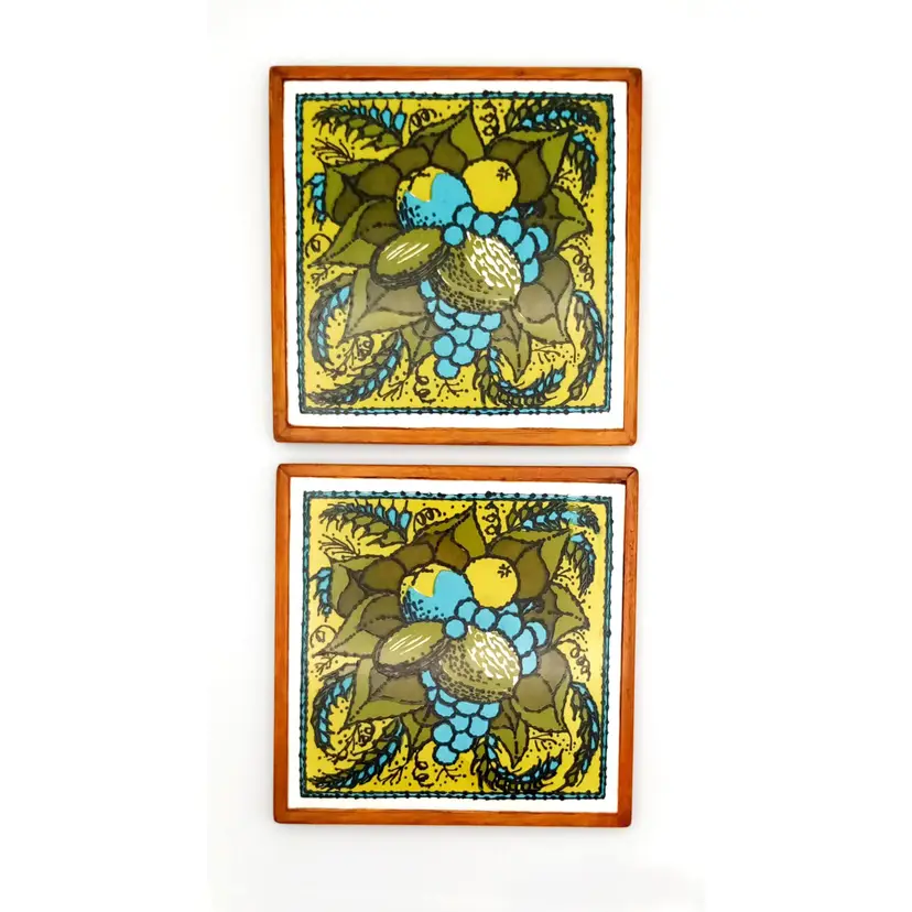 There is no damage to this pair of ceramic tile trivets by Holt-Howard. They have a felt backing and wood frame and are approx 6" x 6". The graphics have a cool 1970s vibe in greens and aqua. And a seemingly Mediterranean food theme, with avocadoes, grains, olives, grapes, etc. Thanks for looking!