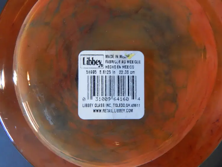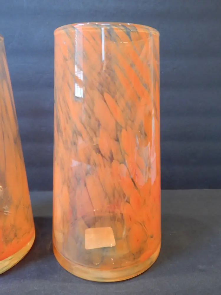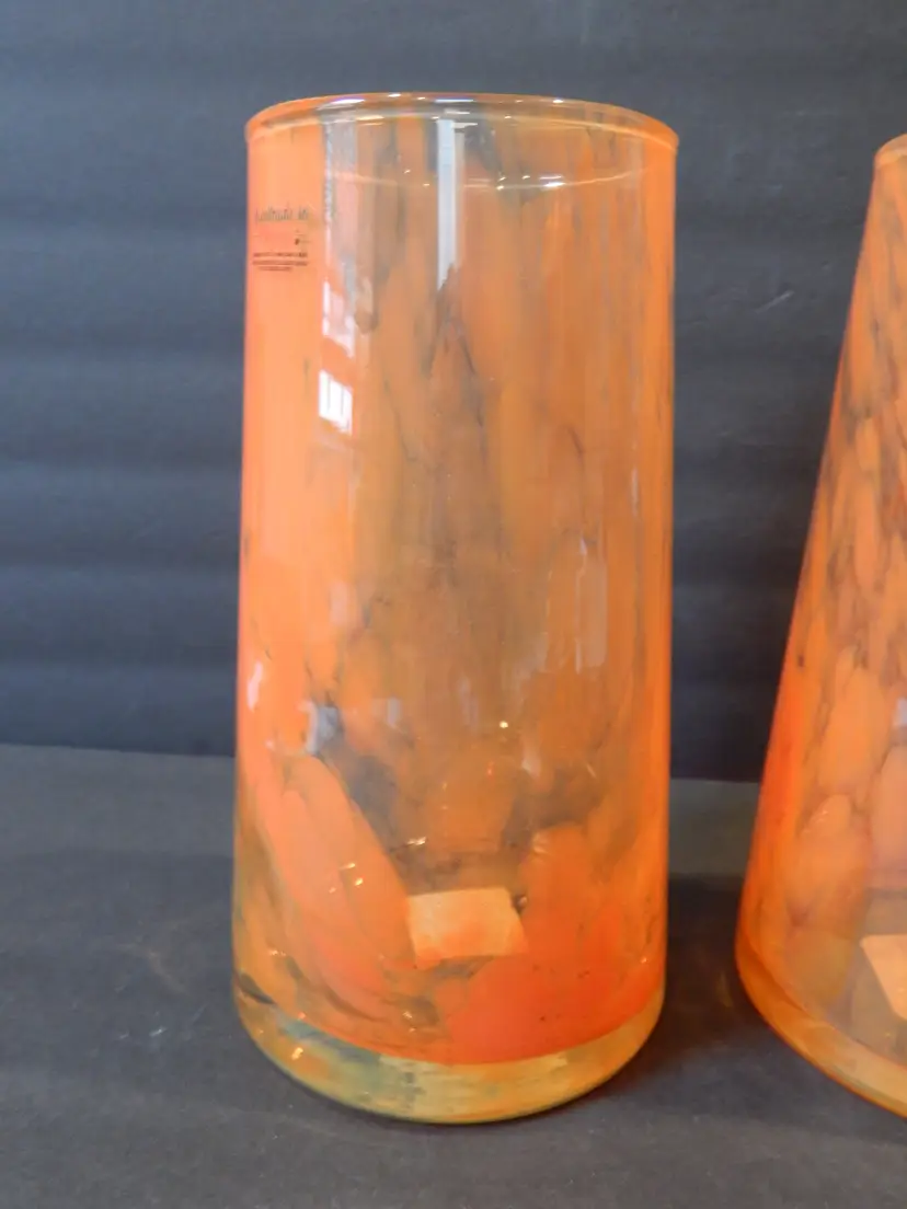 This is a pair of VINTAGE Libbey glass vases with an orange cloud swirl pattern. They were handmade in Mexico in the 1980s and sold in department stores. The vases are each 8.75 inches tall and 3.75 inches in diameter. They slightly taper from the bottom to the top, and there is a difference of 0.25 inches in diameter. They have never been used. They were purchased in the 1980s and then put in storage for almost 35 years. Each vase still has the sales sticker on the bottom. These are beautiful, and will complement any vintage or modern decor. They are in EXCELLENT CONDITION! They were Never Used! The sales stickers are still attached and there are no signs of wear.