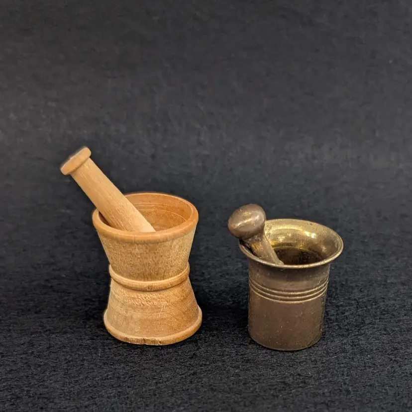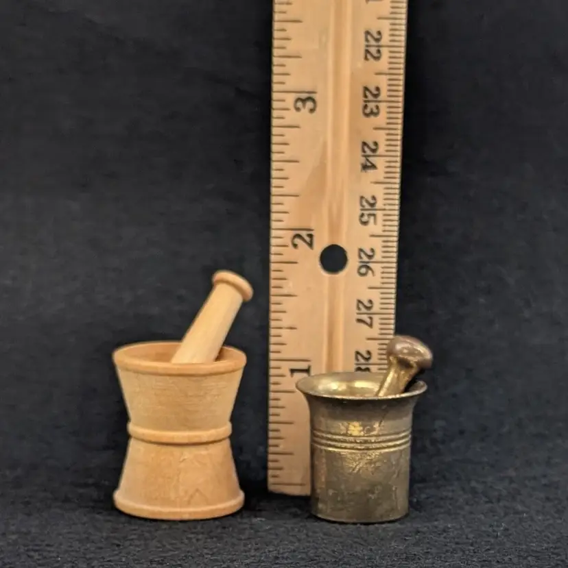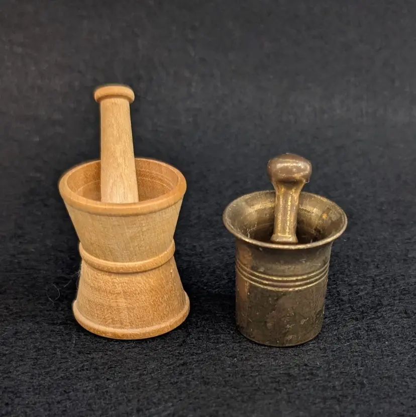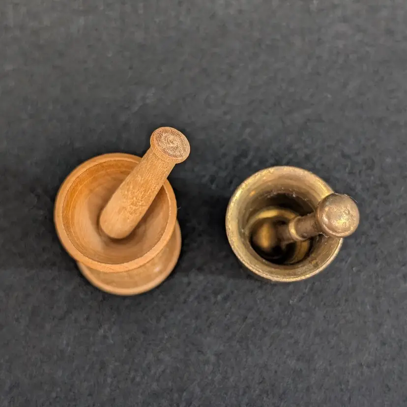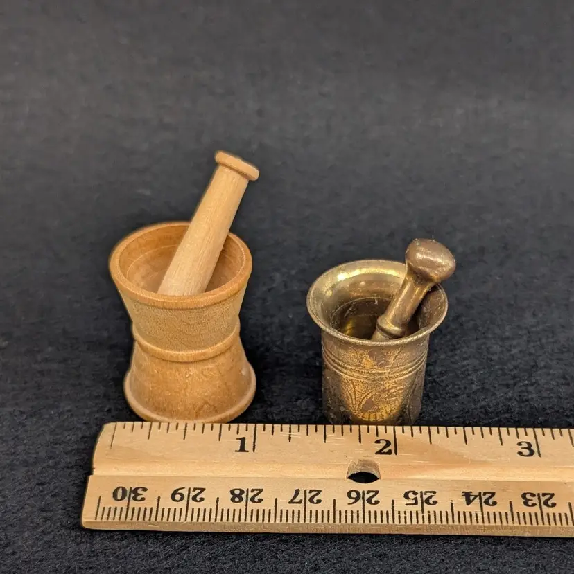 Two, miniature mortar and pestles. The wood is hand turned and unfinished and the other is brass. Perfect for a trinket shelf. In nice, vintage condition with a small dent on the base of the wood and some scratching to the brass (see pictures). Measurements ~ 1 x 7/8-1" plus 1.25" pestles