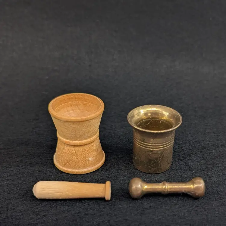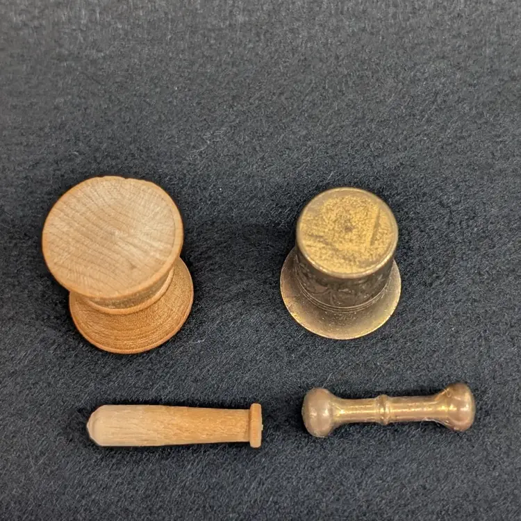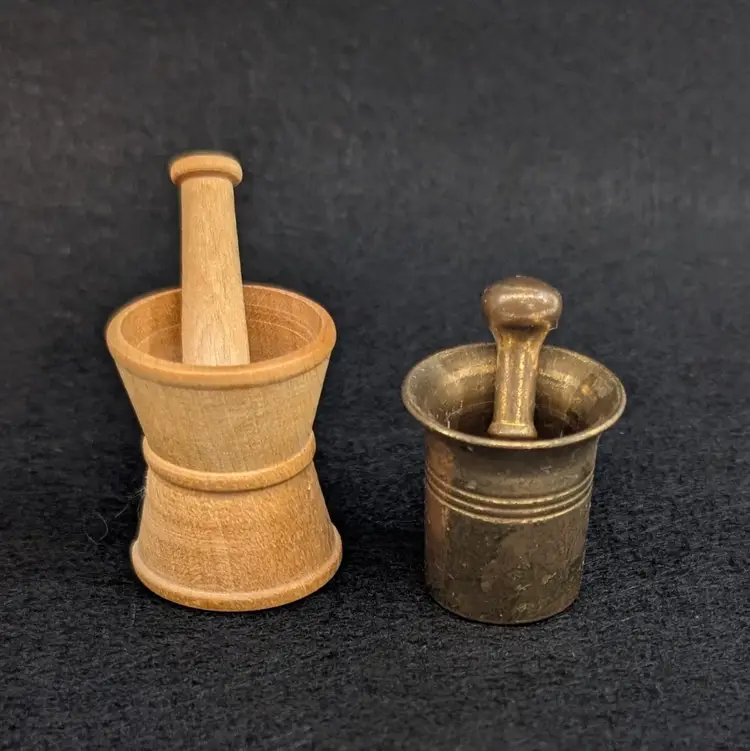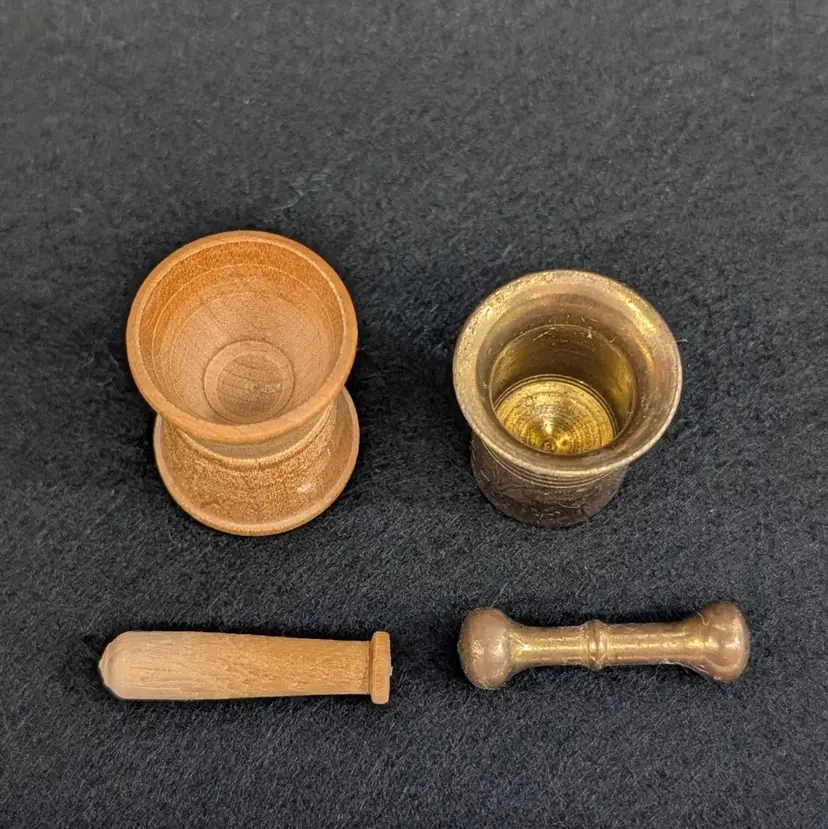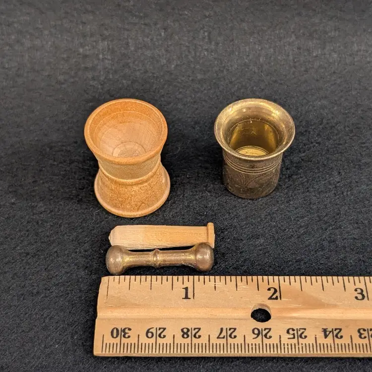 Two, miniature mortar and pestles. The wood is hand turned and unfinished and the other is brass. Perfect for a trinket shelf. In nice, vintage condition with a small dent on the base of the wood and some scratching to the brass (see pictures). Measurements ~ 1 x 7/8-1" plus 1.25" pestles