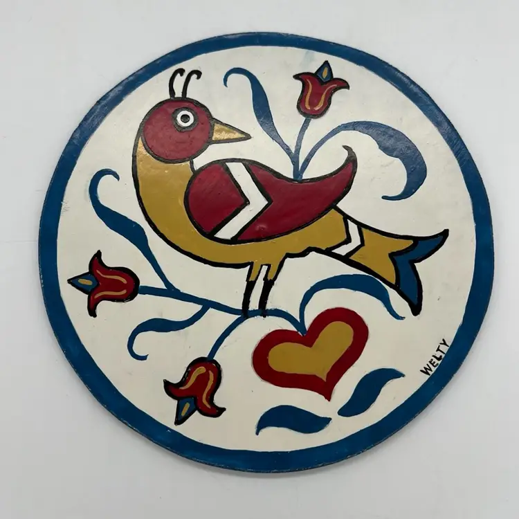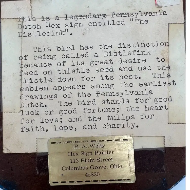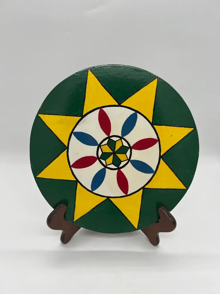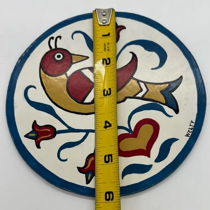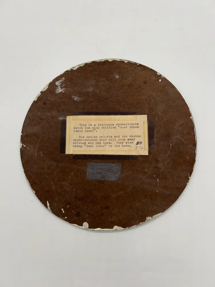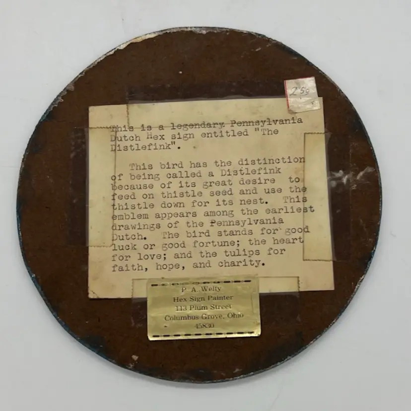 Pretty good condition. There is minimal chipping to the edges as pictured. I love the descriptions taped on the back(done on a typewriter!)! Smaller is about 6” diameter, larger about 9” diameter.