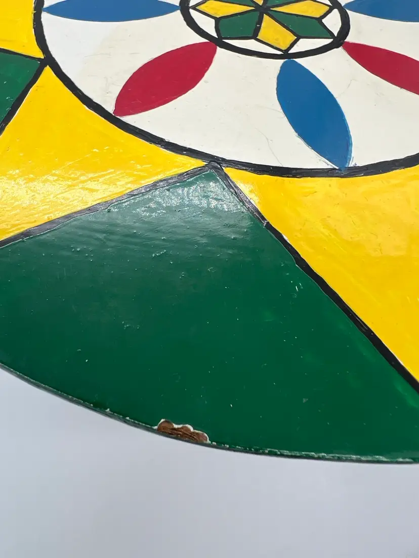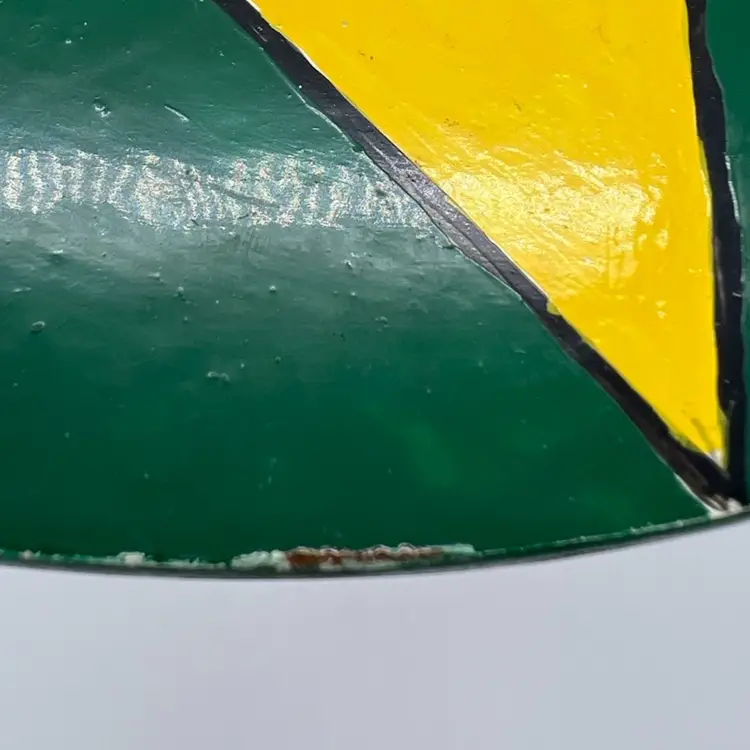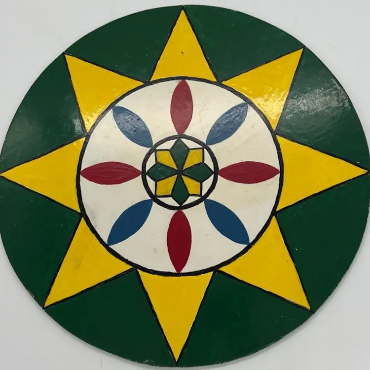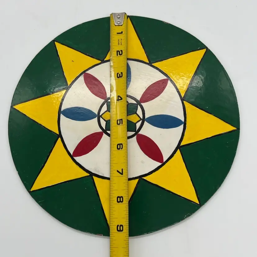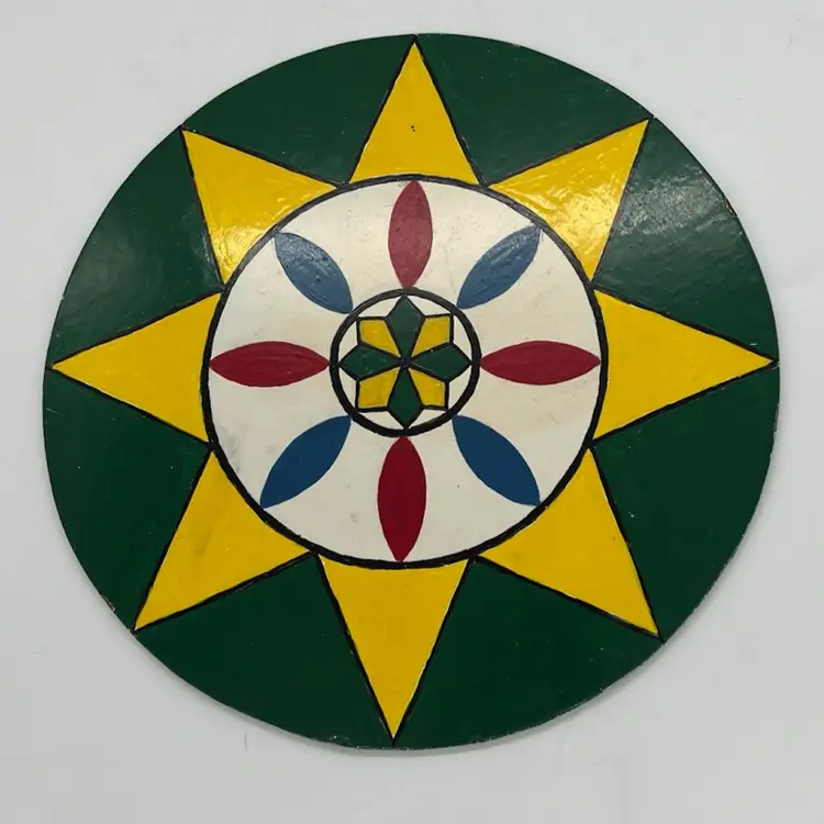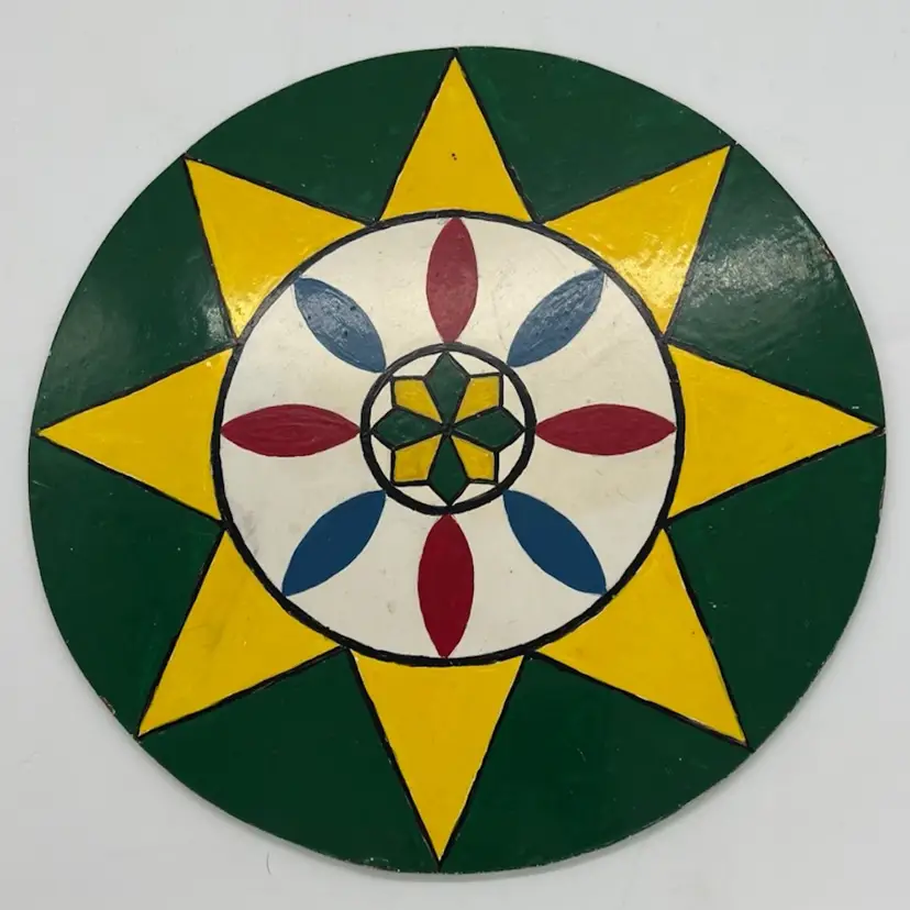 Pretty good condition. There is minimal chipping to the edges as pictured. I love the descriptions taped on the back(done on a typewriter!)! Smaller is about 6” diameter, larger about 9” diameter.