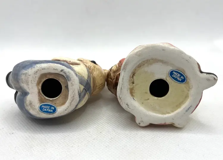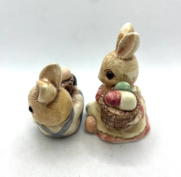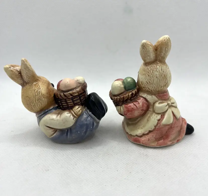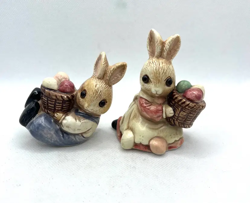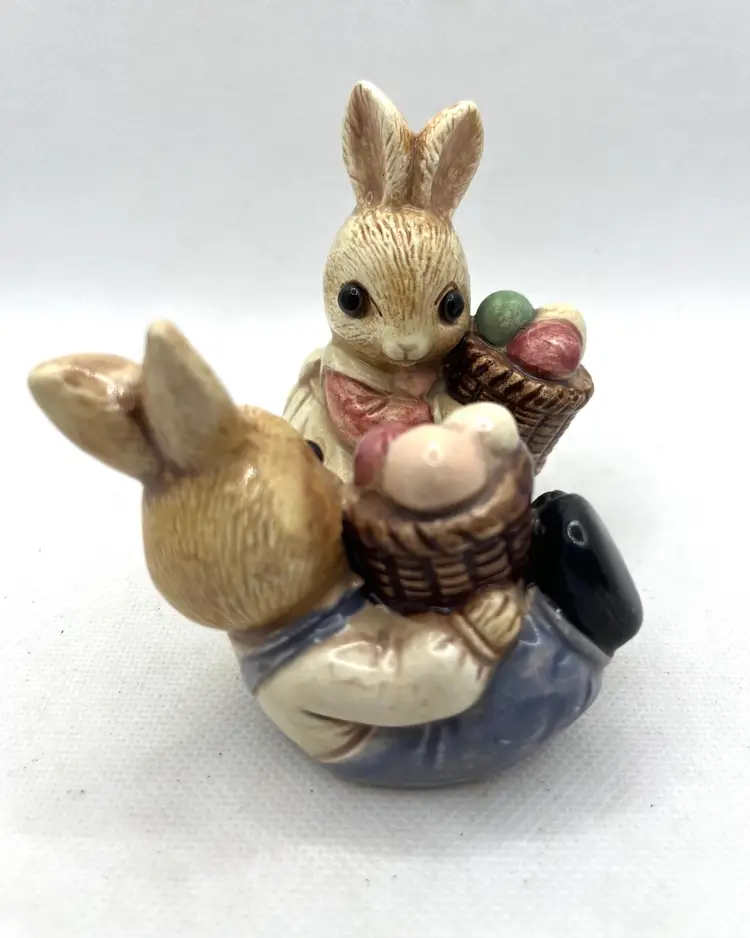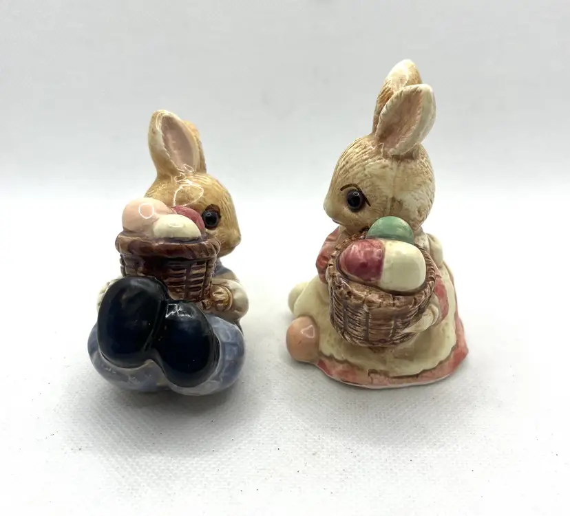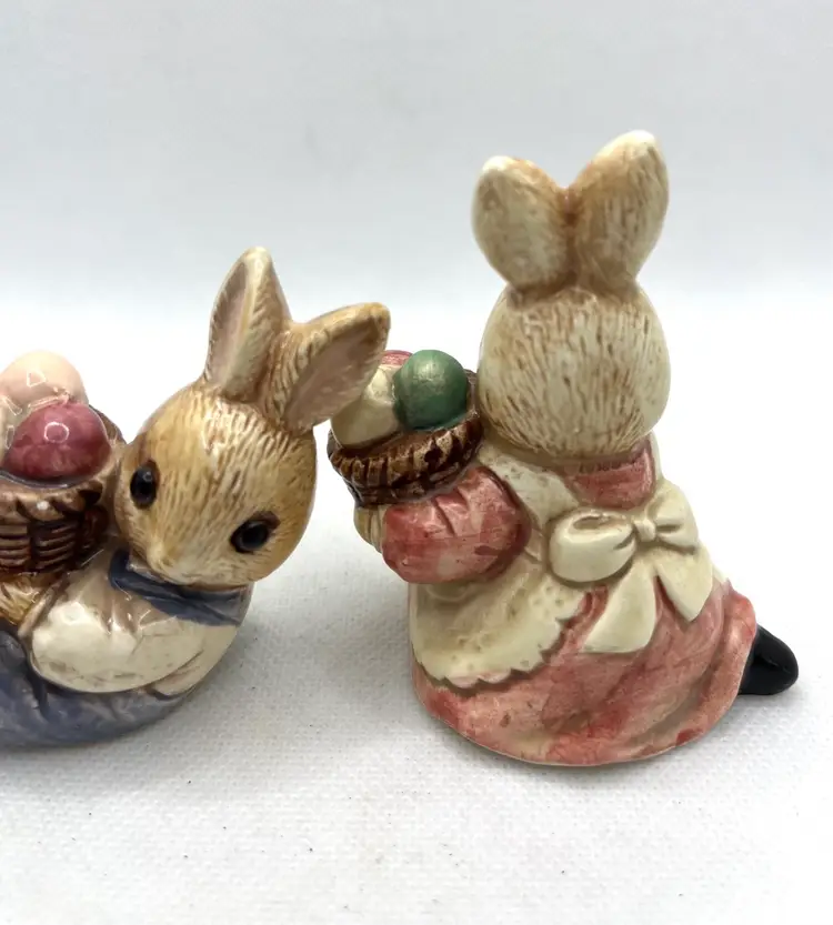 Vintage Pair Rabbit Bunny Ceramic Easter Eggs Basket Mini Figurines Cottage core. Vintage patina and wear. Tiny paint chip on boys basket shown in photos. Approximately 2.5”. So cute!