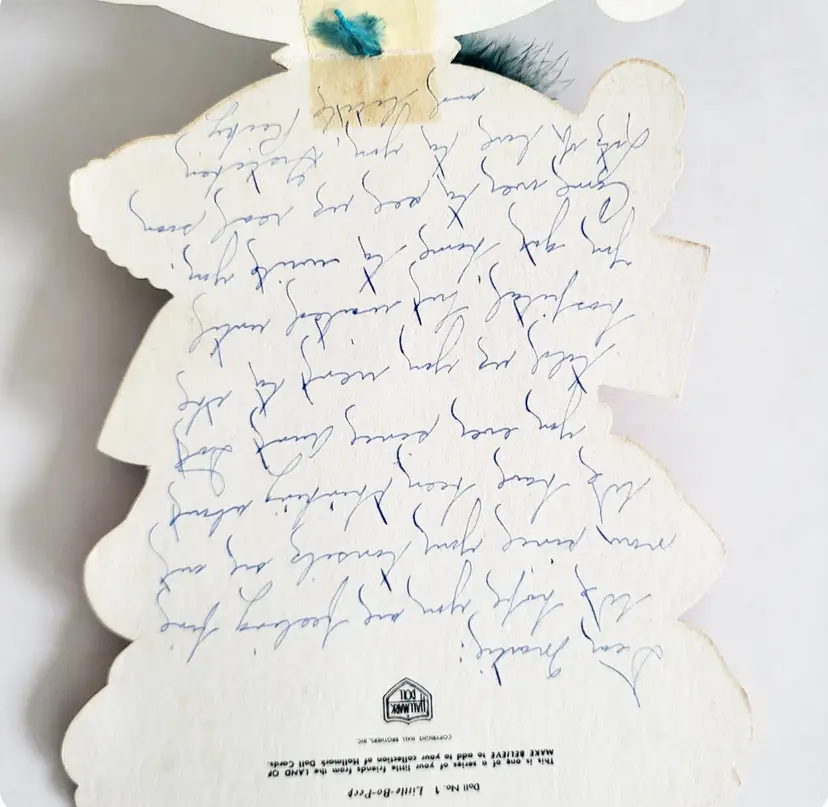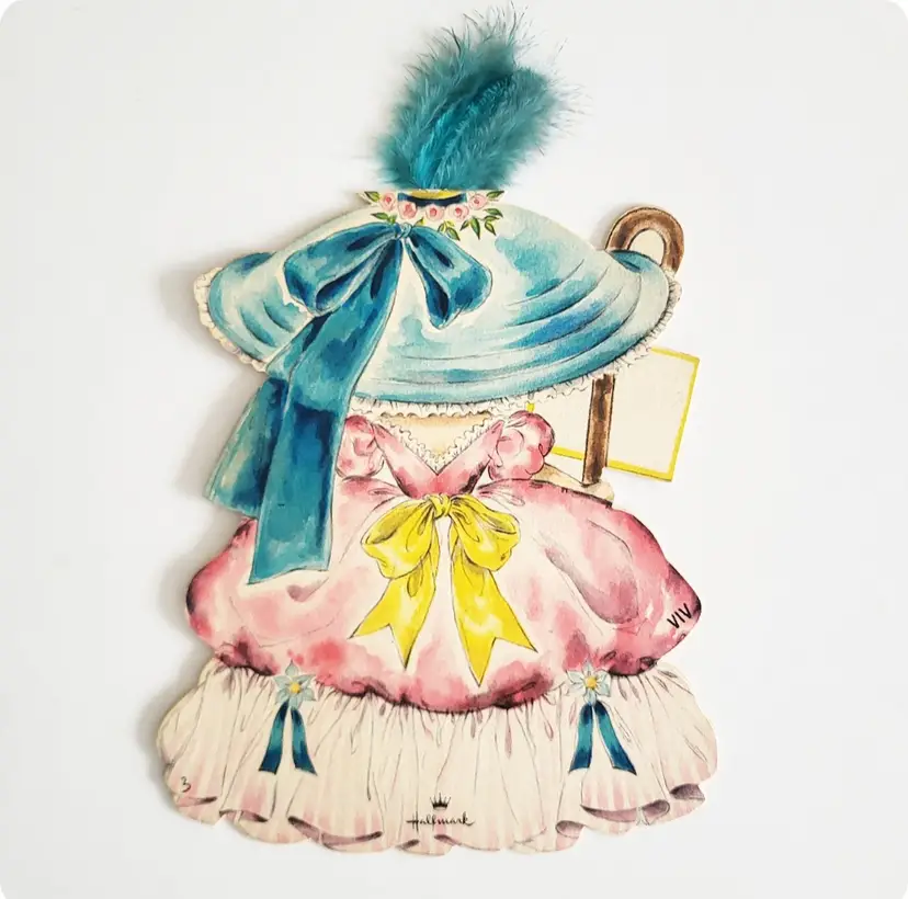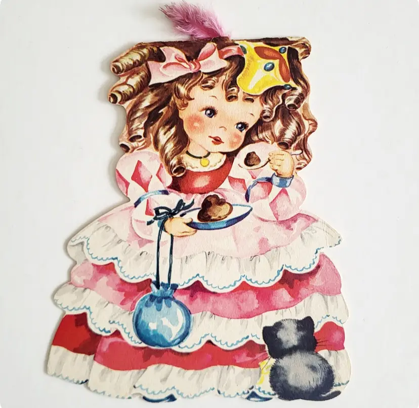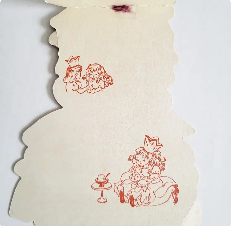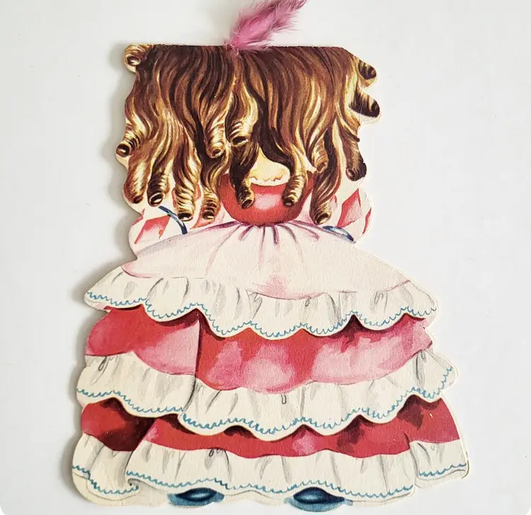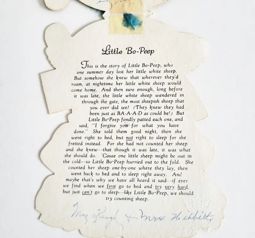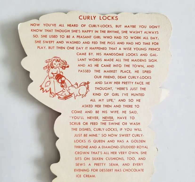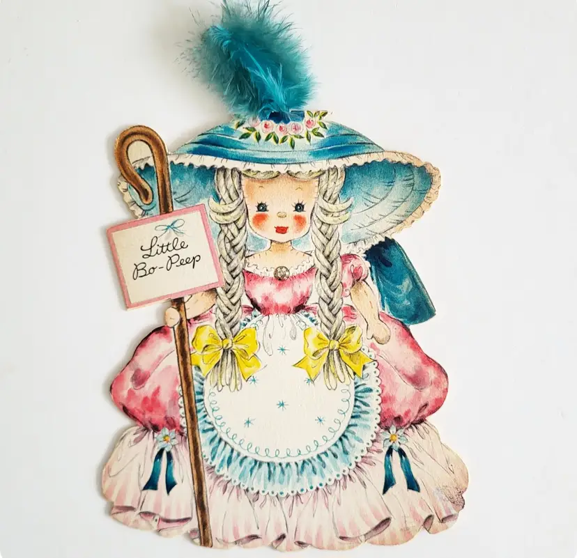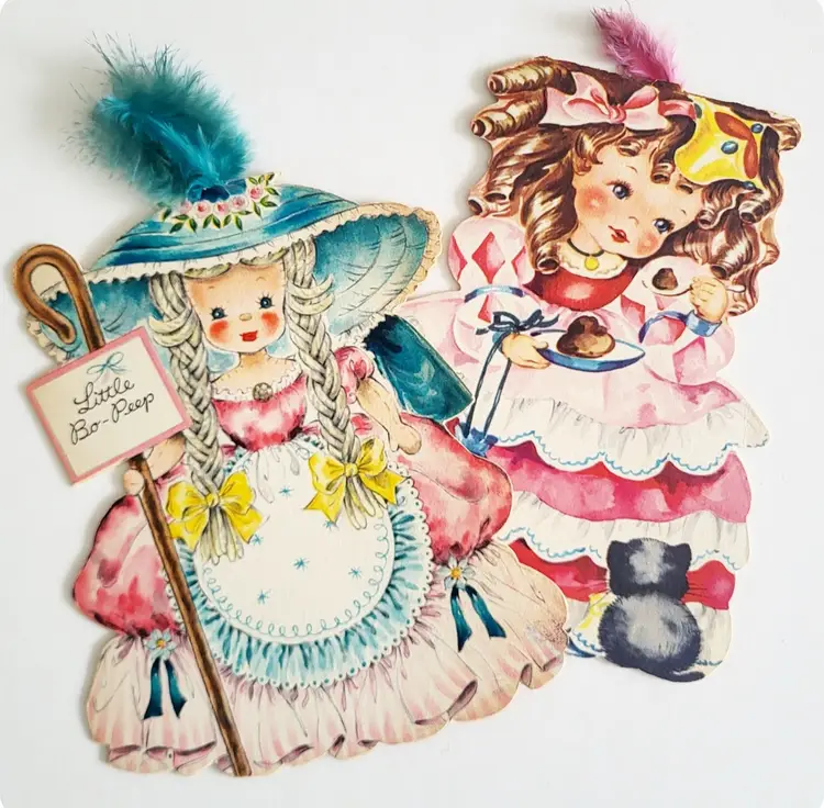 Pair of vintage Storybook greeting cards. Little Bo Peep from the Hallmark Land of Make Believe Storyland Cards, she is number 1 from the series. She has writing inside/used. Measures 5 in x 7 in tall at the feather. Curly Locks is made by American Greetings. Not used. Measures 5 in x 6.25 in tall at the feather. Both has minimal wear, good condition.