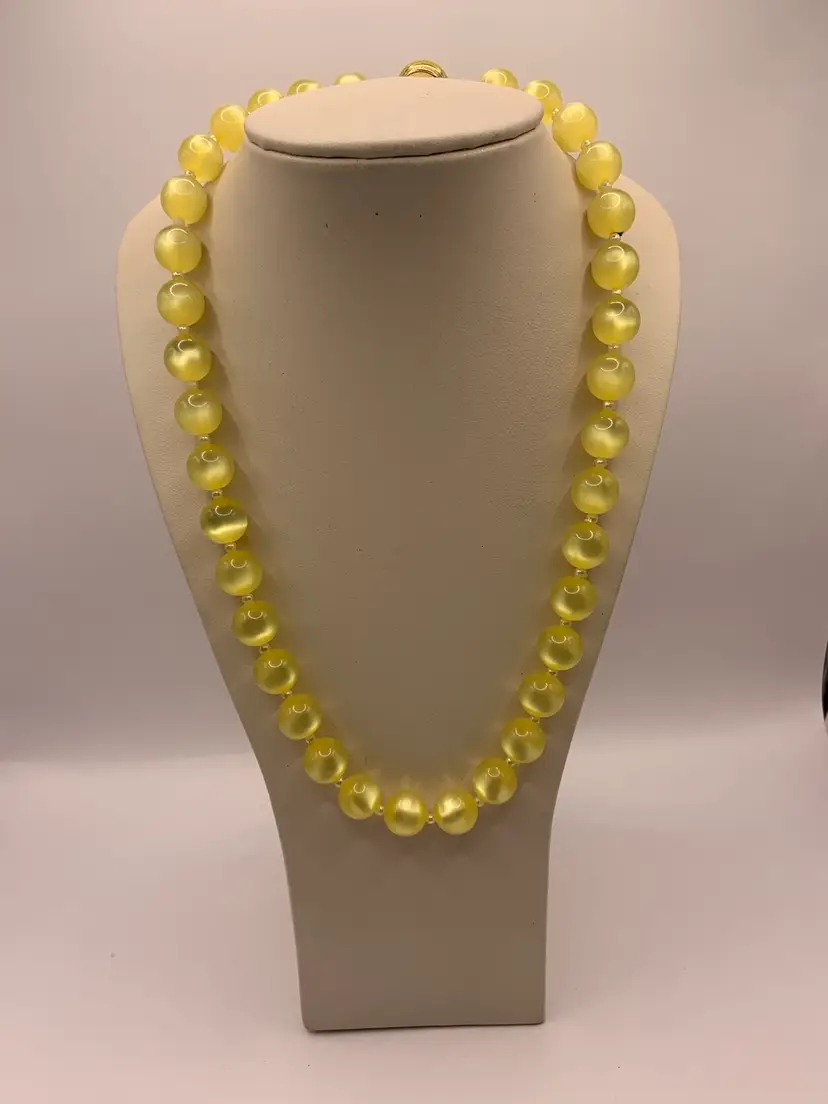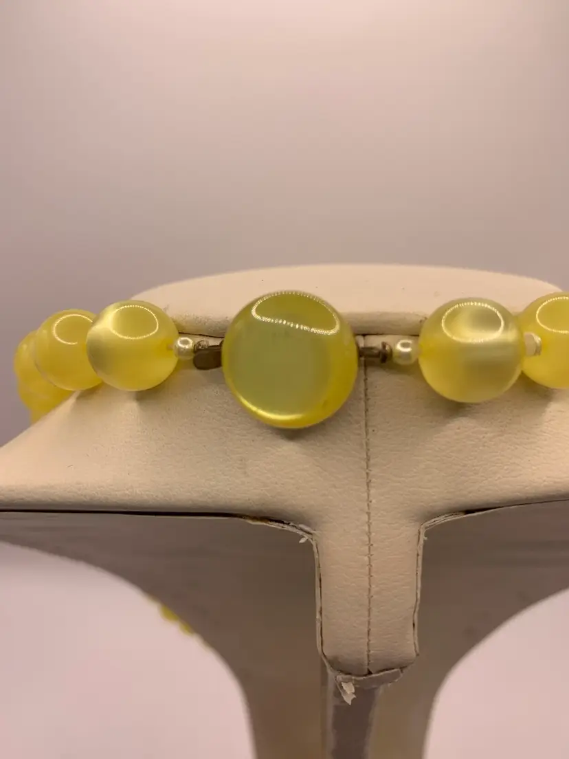 Pretty pale yellow moonglow beads The color and style are perfect for warmer months Pretty vintage clasp Measures 20 in In excellent condition