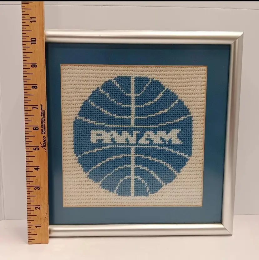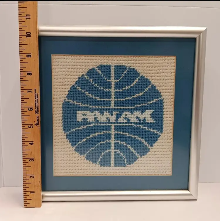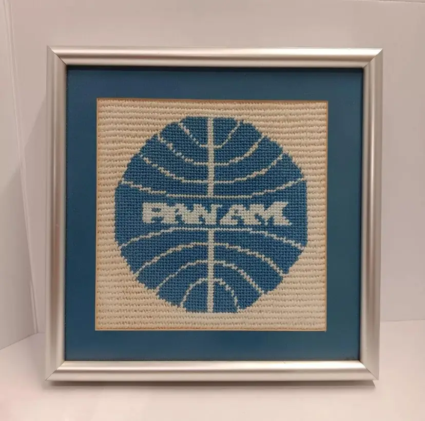 Add a touch of aviation nostalgia to your home or office with this vintage Pan Am Airlines embroidered wall art. The large cross stitch design is expertly crafted and comes beautifully framed in matte finish. The artwork features the iconic Pan Am logo and is a perfect addition for any aviation enthusiast or collector. The piece adds a unique touch of history to any room and is sure to spark conversation.