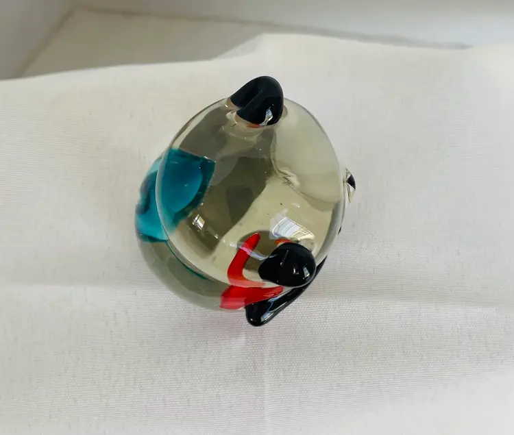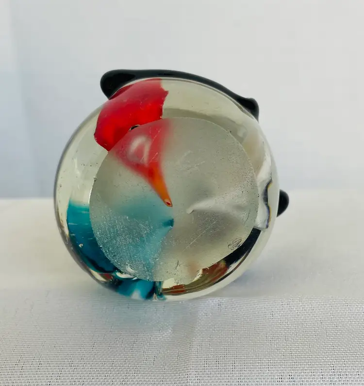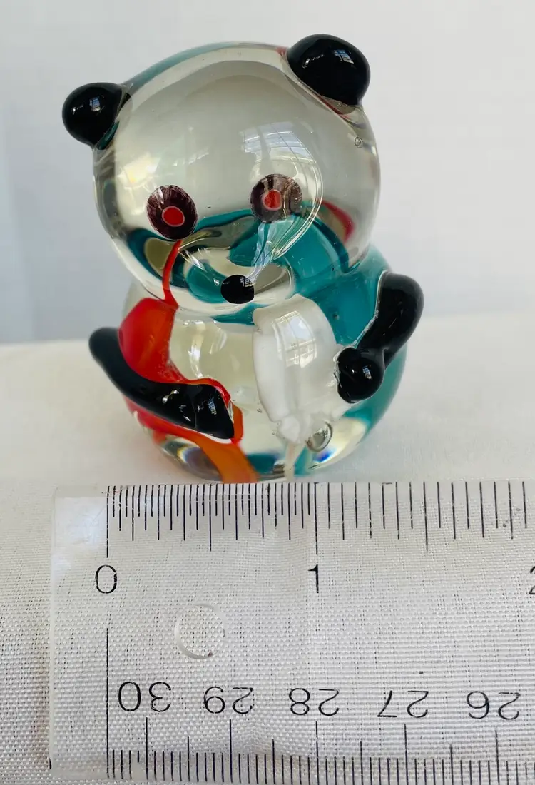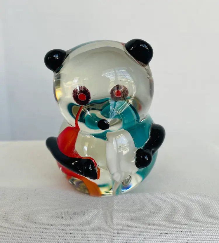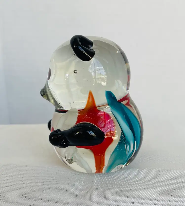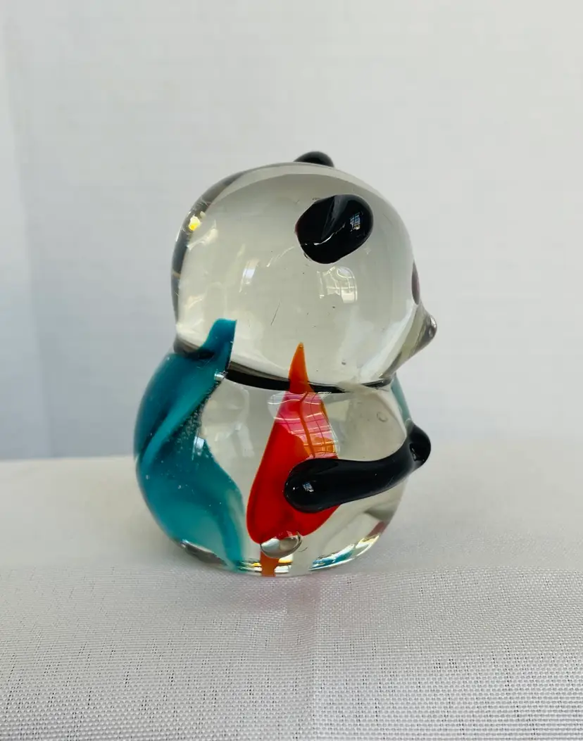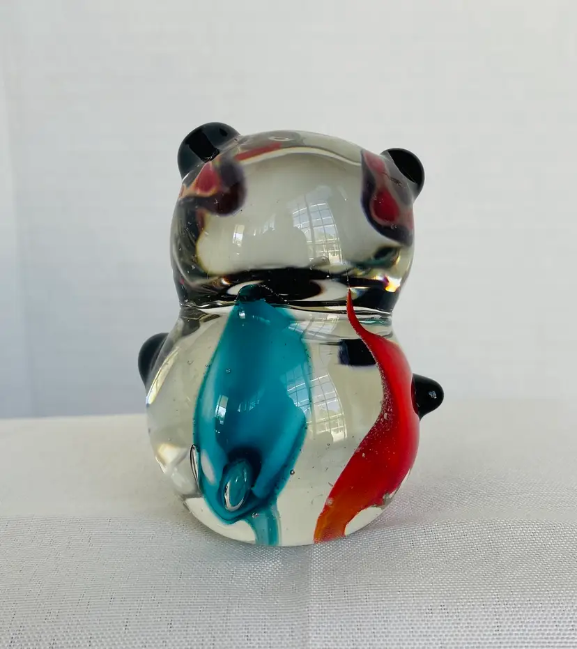 This adorable vintage art glass paperweight features a charming panda design with colorful red, white and aqua swirls inside the belly.
