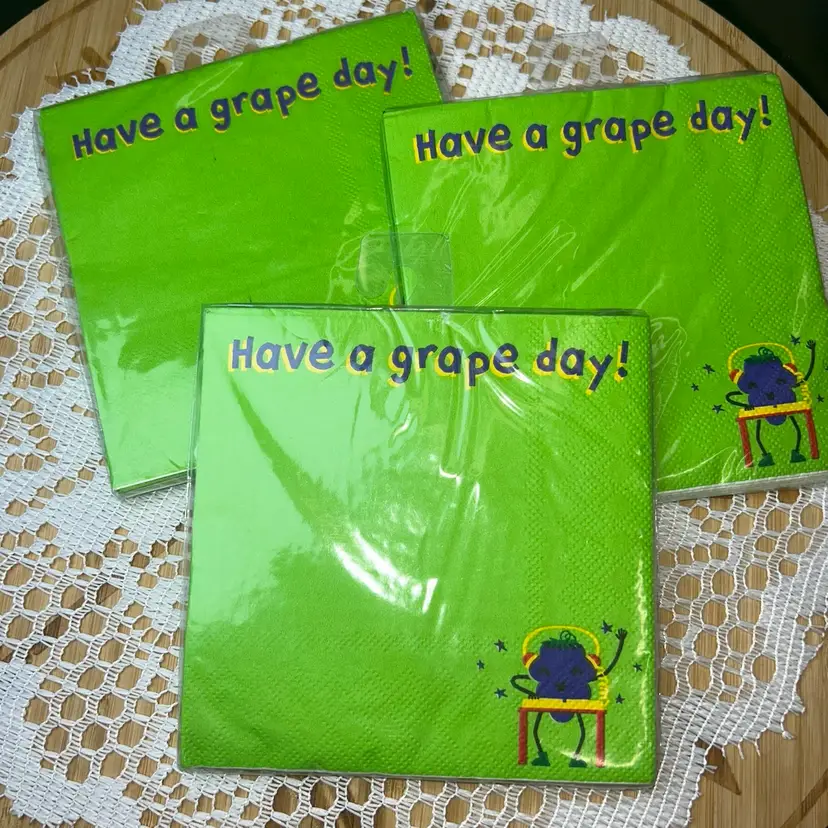 Green napkins that say, “ Have A Grape Day!” Write a note on the napkin and give it to someone. One pack has a pinhole opening.