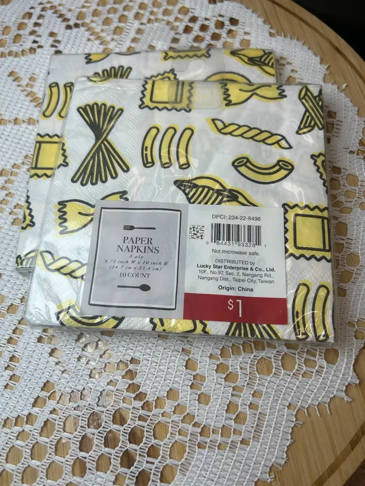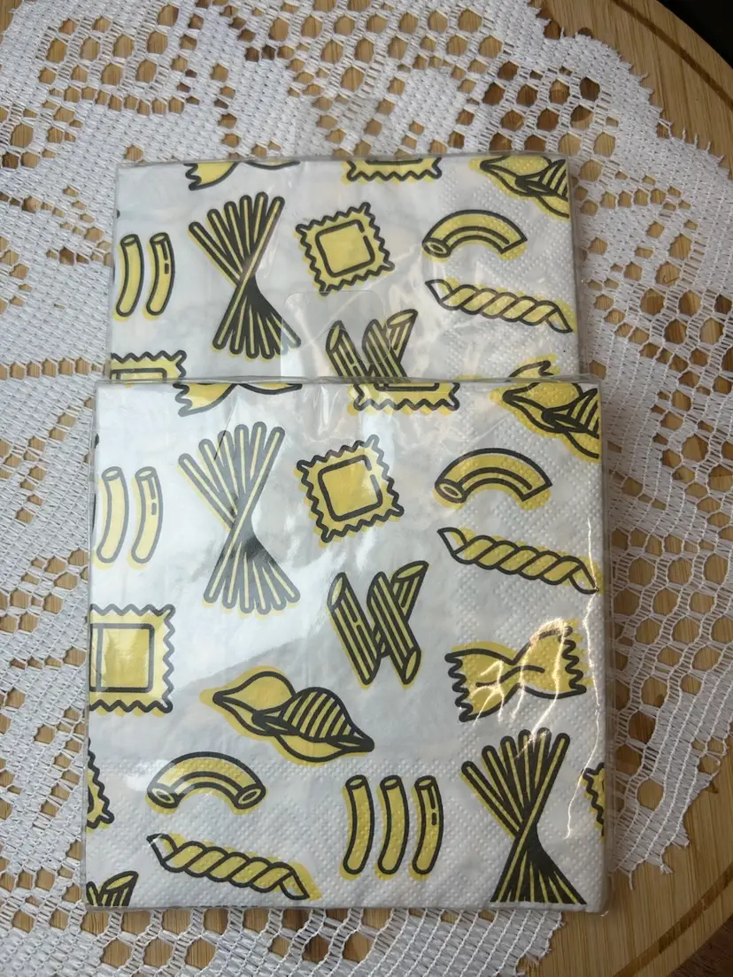 Decorated with yellow assorted pasta shapes. 9.75” x 10” unfolded, 3 ply.
