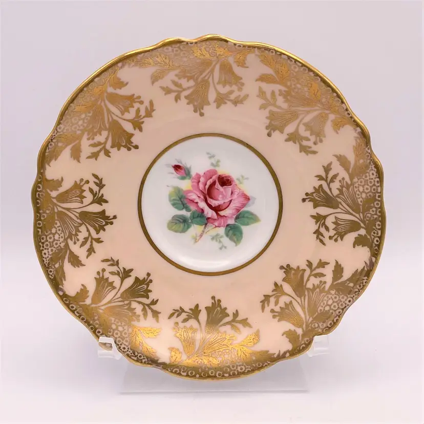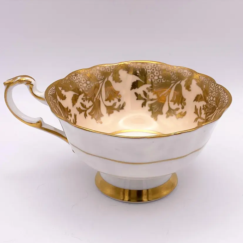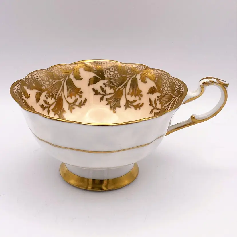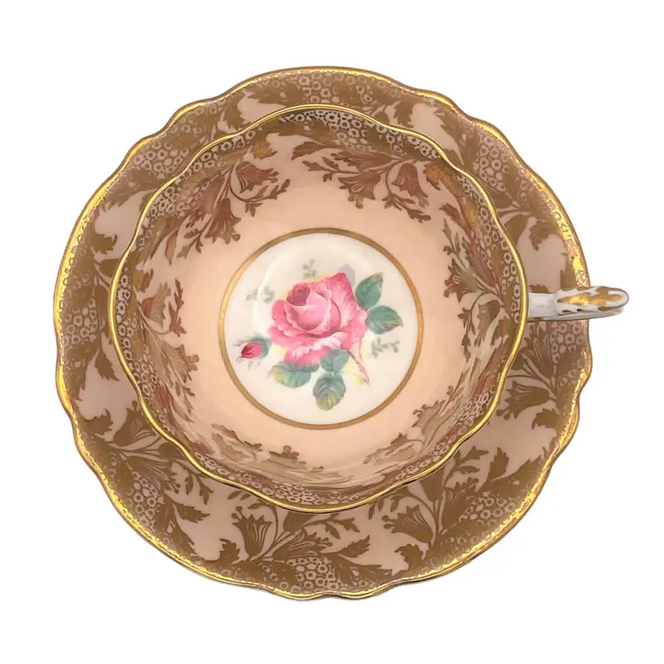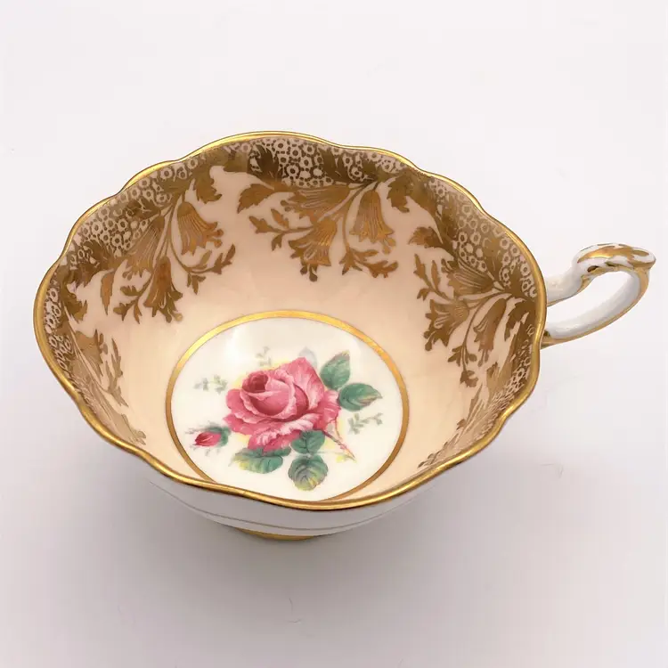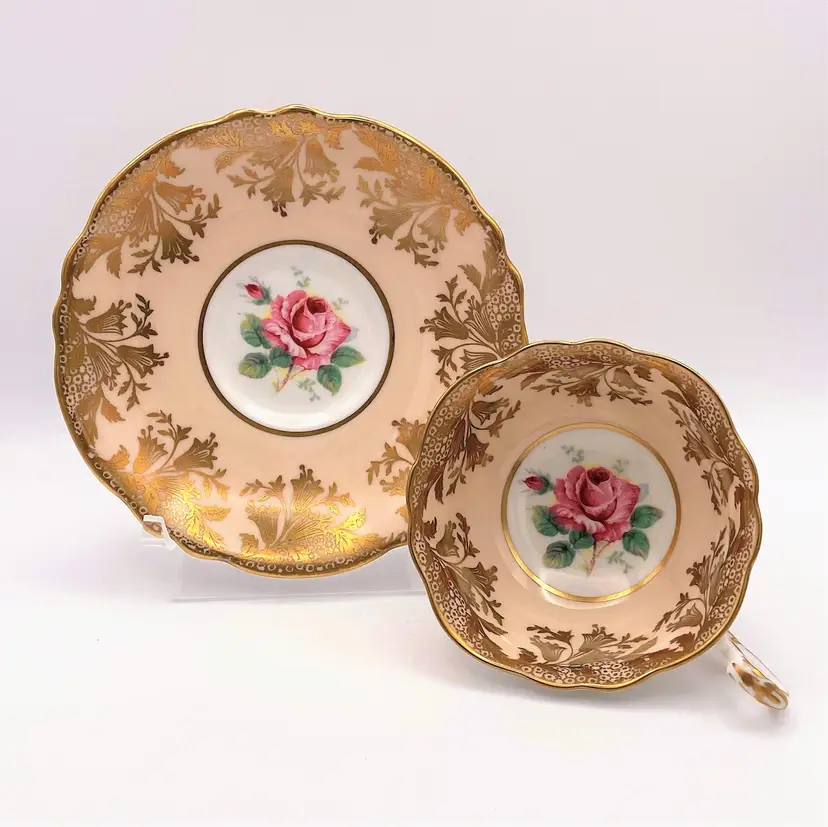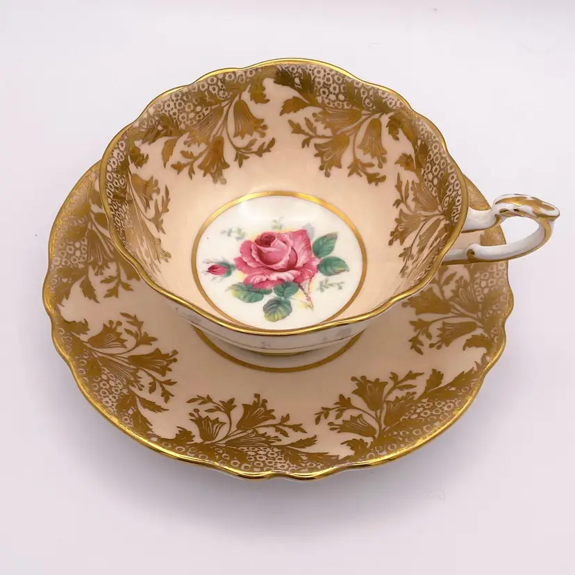 Vintage Paragon double warrant gold and floating rose footed tea cup and saucer. This gorgeous set in the wide mouth shape has an identical pattern inside the tea cup and on the saucer. The background is peach, with lavish gold foliate trim, and a floating rose in the center. The outside of the cup is white with a thin gold stripe around the middle of the cup.