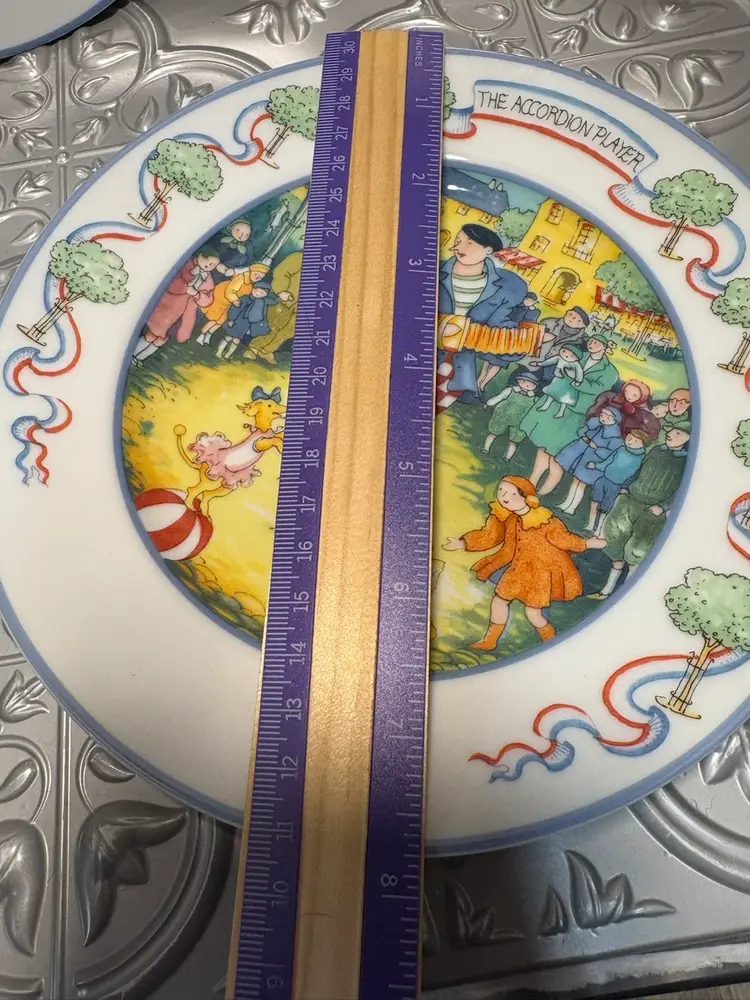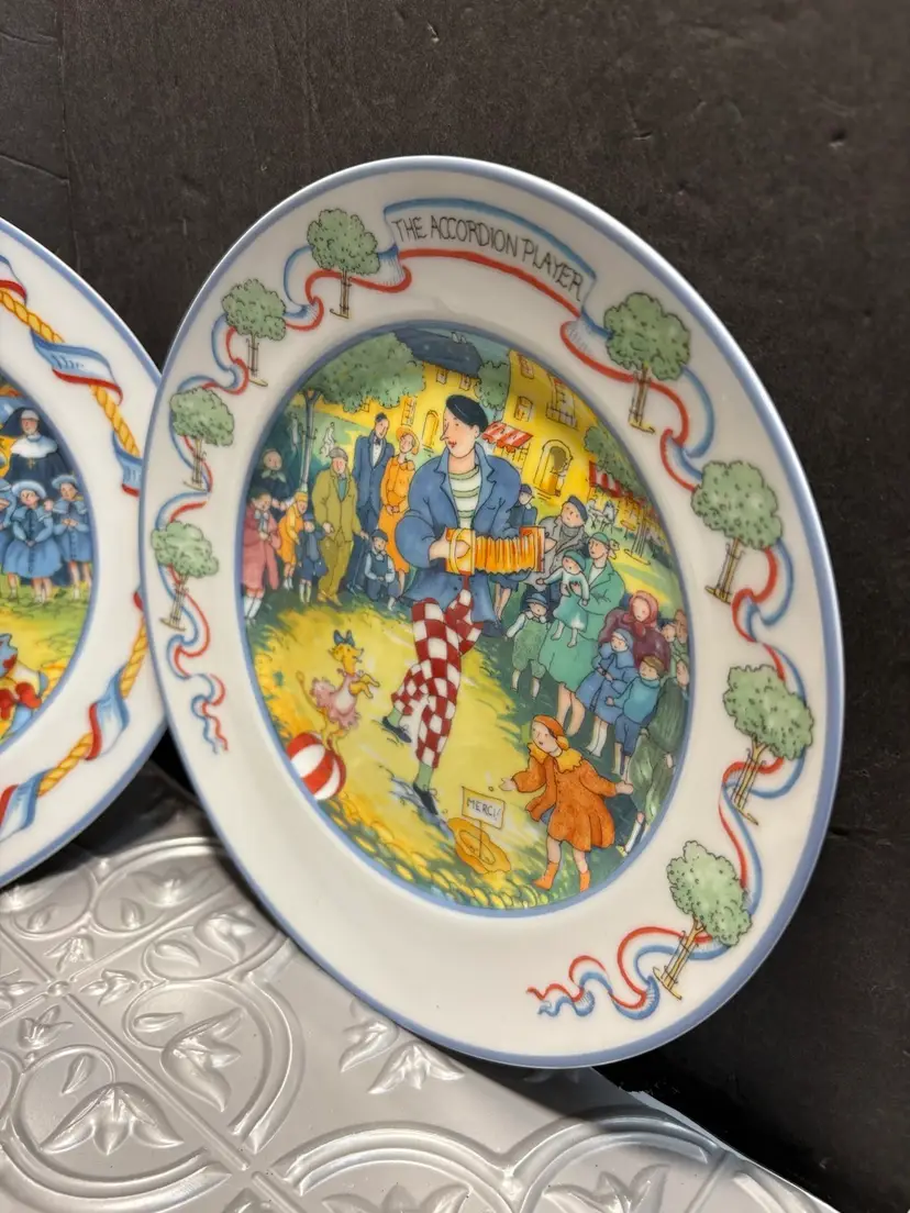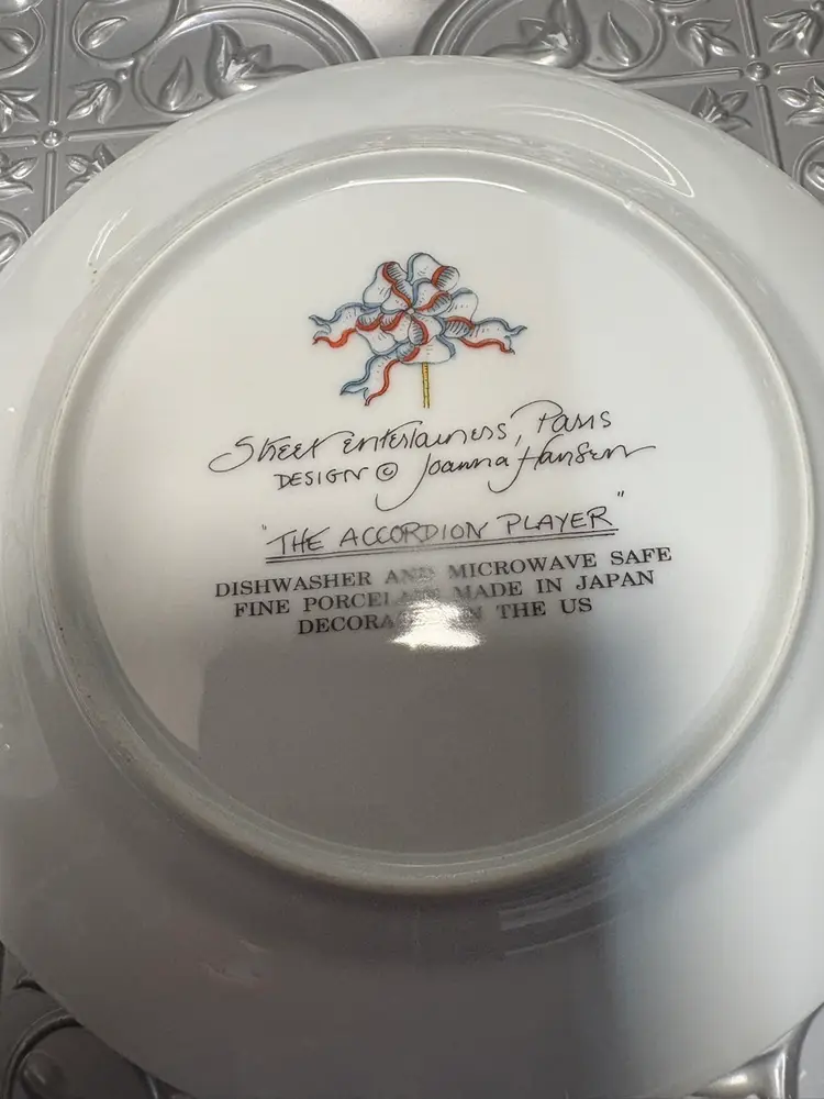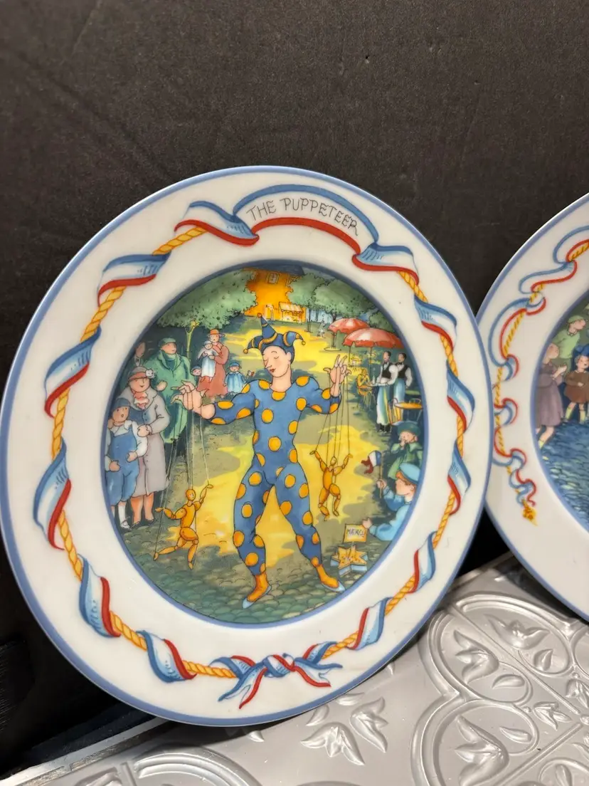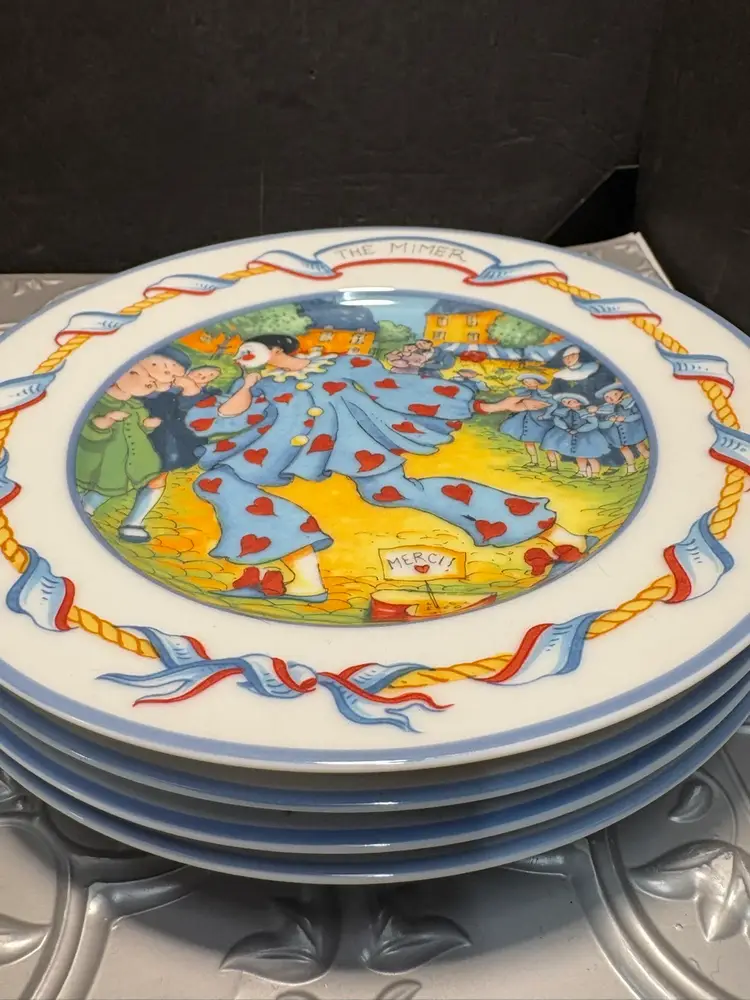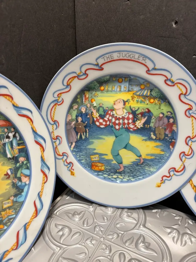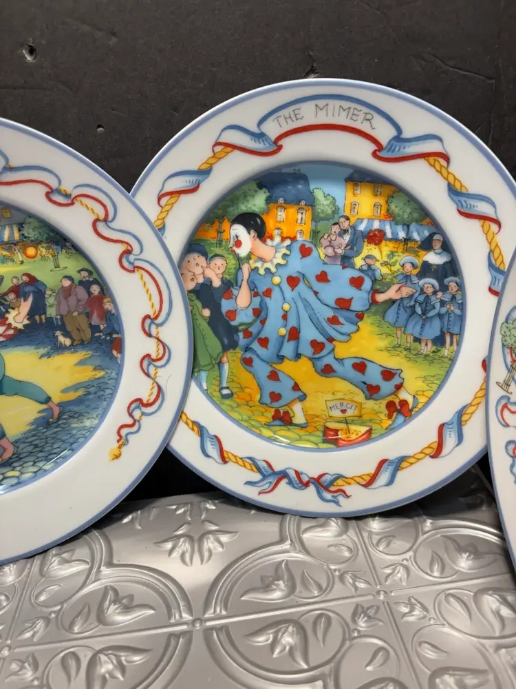 No chips or cracks The product is a set of 7 3/4 inch round collector plates by artist Joan Hansen, inspired by vintage Paris street entertainers and circus entertainment. Made of porcelain with a colorful blue, yellow, green, and red pattern, these plates showcase French culture and art pottery production style. Each plate is adorned with a unique design depicting scenes of circus entertainment, making them a charming addition to any decorative collection