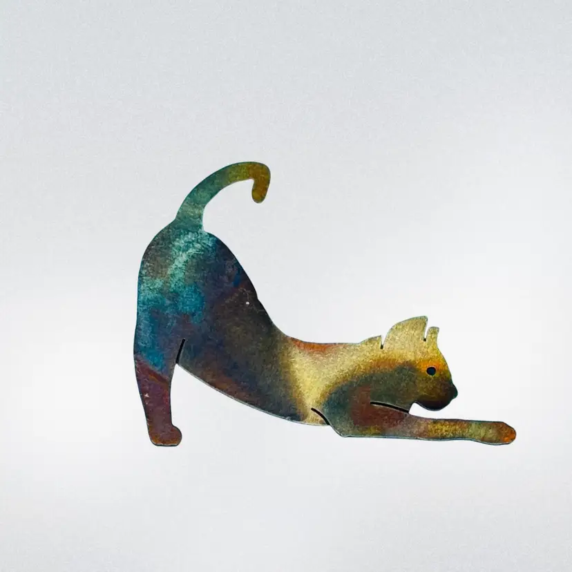 Vintage patina copper cat brooch in a playful stretching pose. Multicolor finish with blue, green, and gold tones.