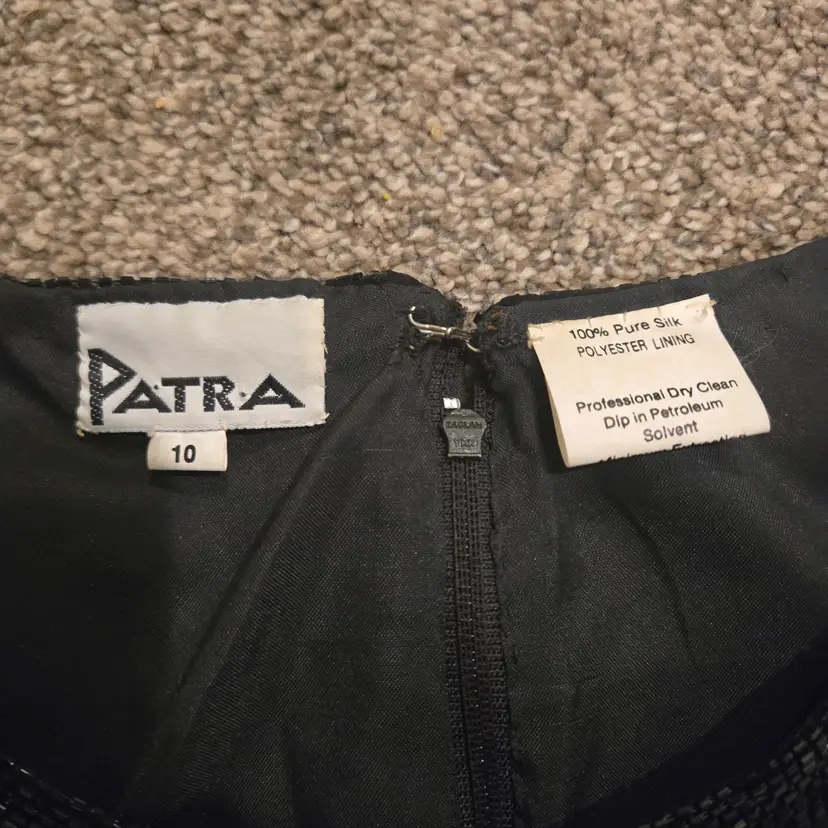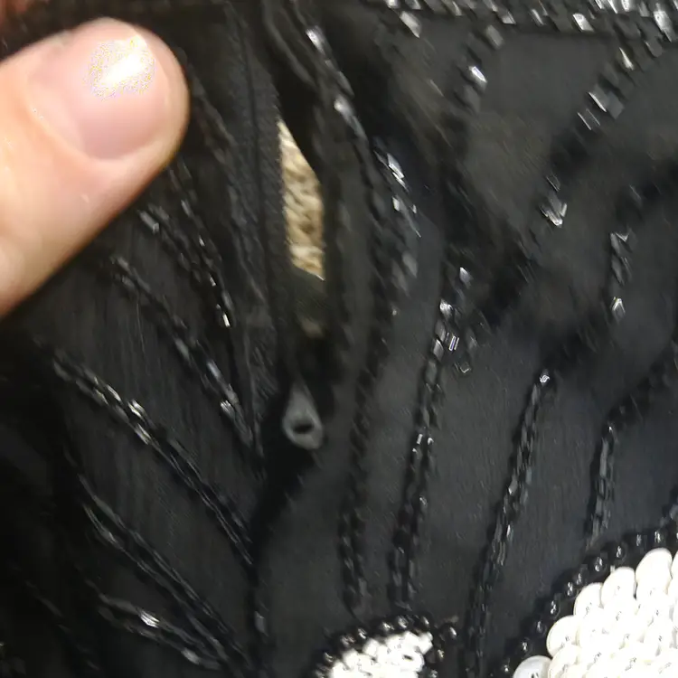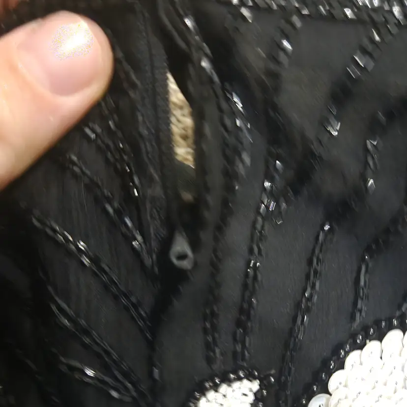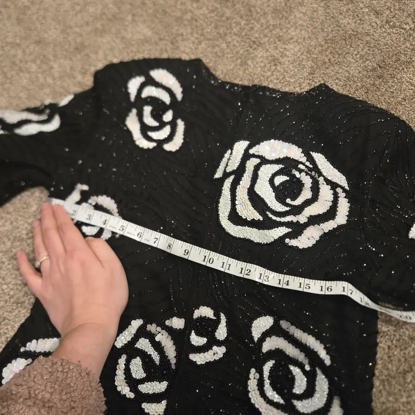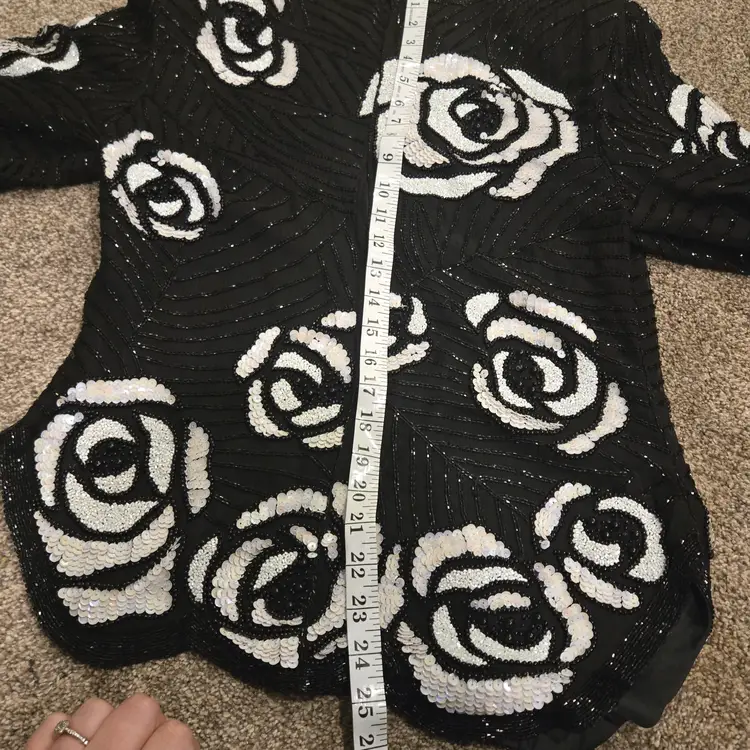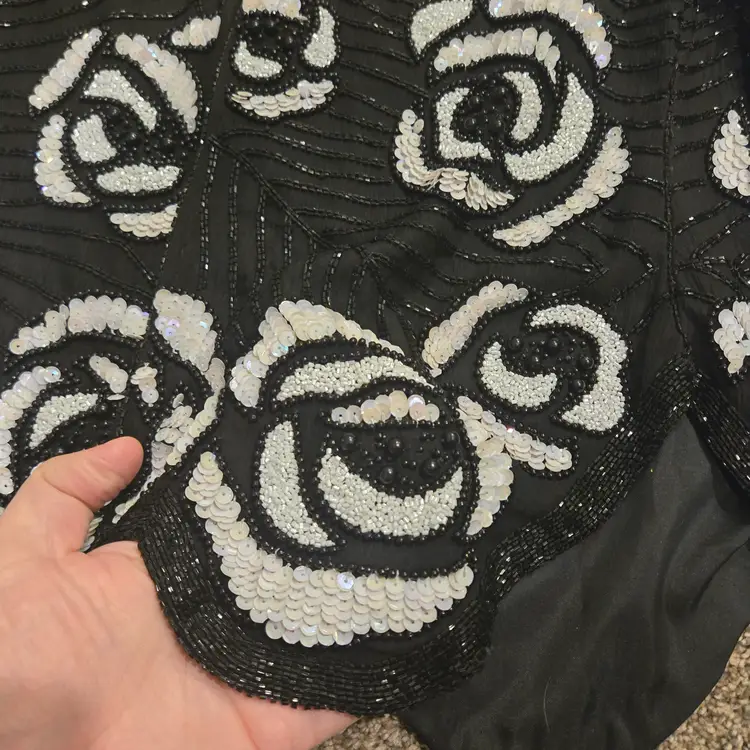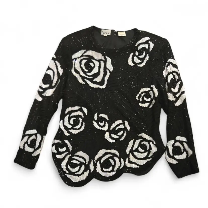Vintage Patra 10 Sequin & Beaded Blouse Top Black & White, Retro Floral Silk Top