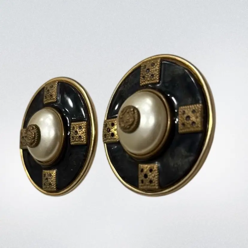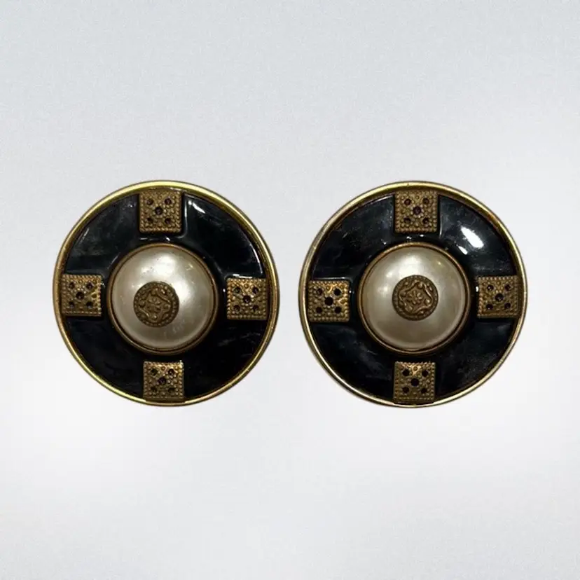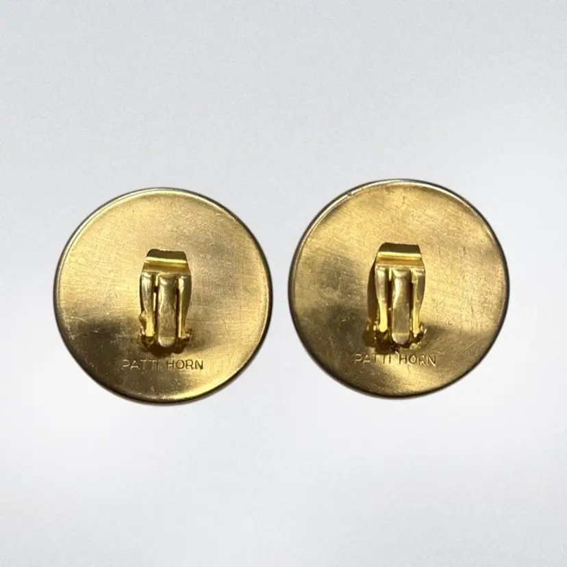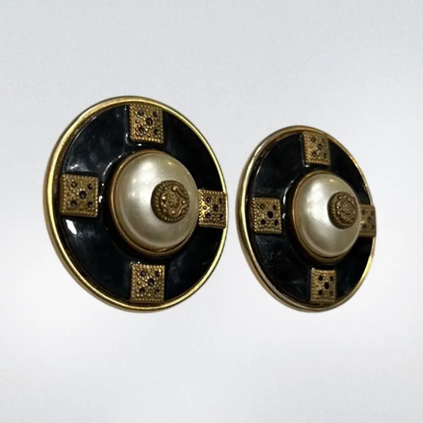 Vintage Patti Horn Signed Clip On Earrings Round Black Faux Pearl Cabochon 1.58”