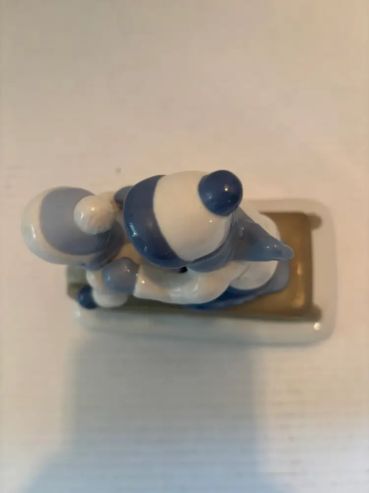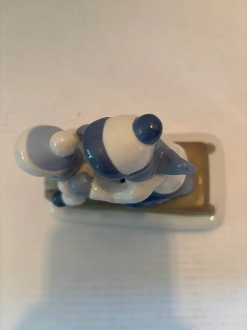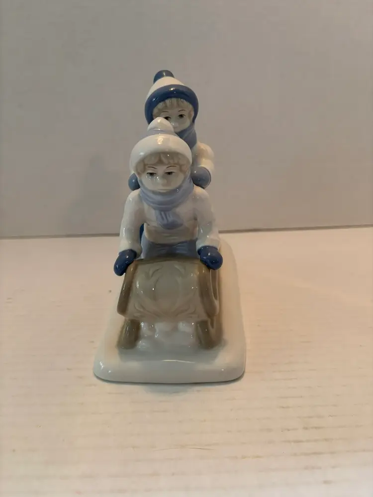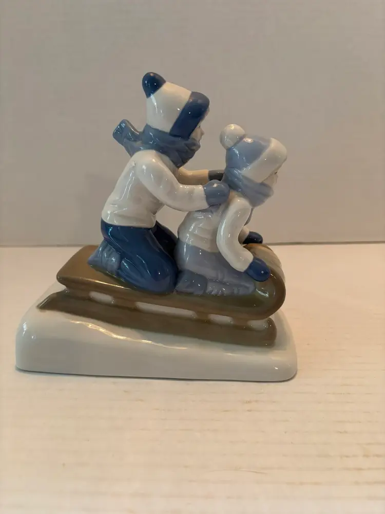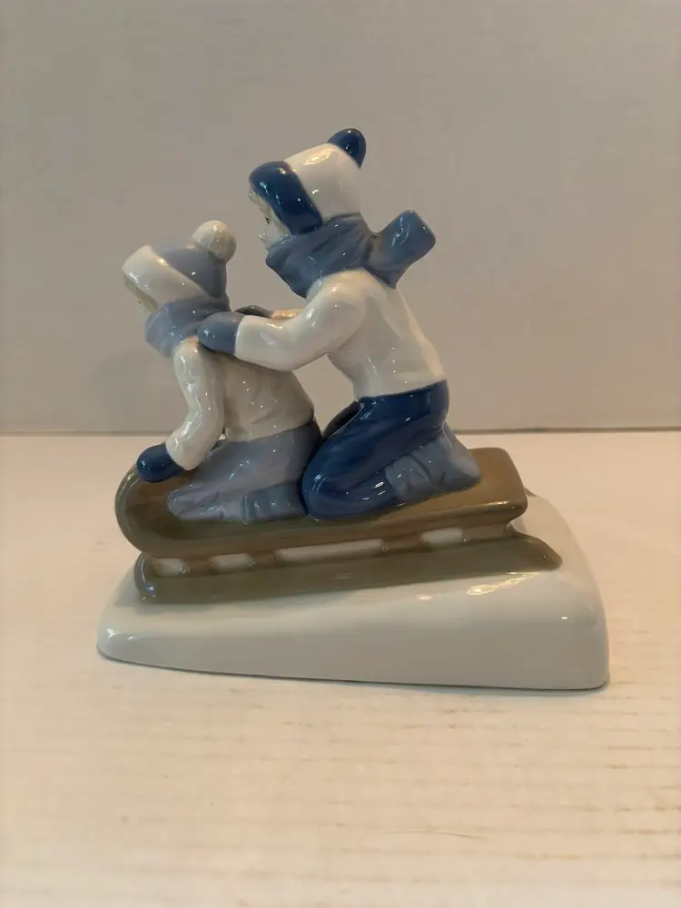 The Vintage Paul Sebastian "Children on Sled" Porcelain Figurine from 1992 is a beautiful collectible piece perfect for Christmas. Made in Mexico, this glossy blue figurine depicts children sledding, adding a nostalgic touch to any holiday decor. Despite not having its original box, this figurine is a charming addition to any collection or as a standalone decorative piece. NO BOX