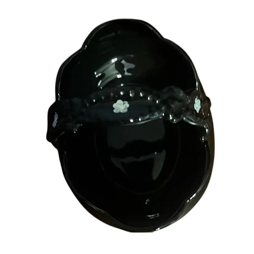 Exude timeless elegance with the Vintage Payot Of Paris Black Porcelain Basket Vase. This chic decorative piece, featuring a classic oval shape and a glossy finish, is a testament to the sophisticated craftsmanship of the 1970s. With a single compartment ready to hold your favorite blooms, this vase brings a touch of Parisian charm to any room. Meticulously hand-painted details adorn the vase, capturing the essence of floral beauty. Its molded ceramic construction ensures durability, while the painted backstamp authenticates its originality. Perfectly sized at 5 inches in height and 5 inches in diameter, this Payot basket is a versatile addition to your home decor collection, ready to showcase your love for vintage aesthetics and delicate design.