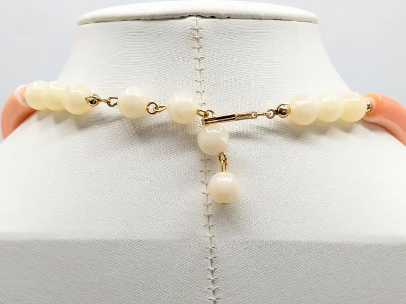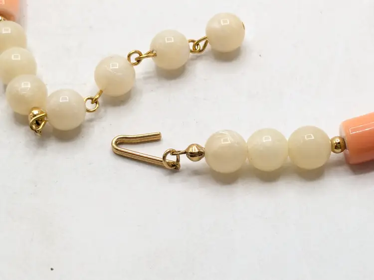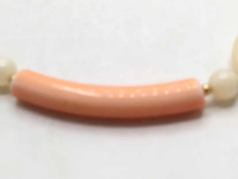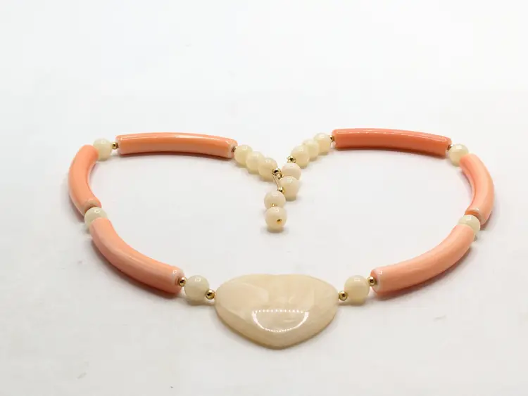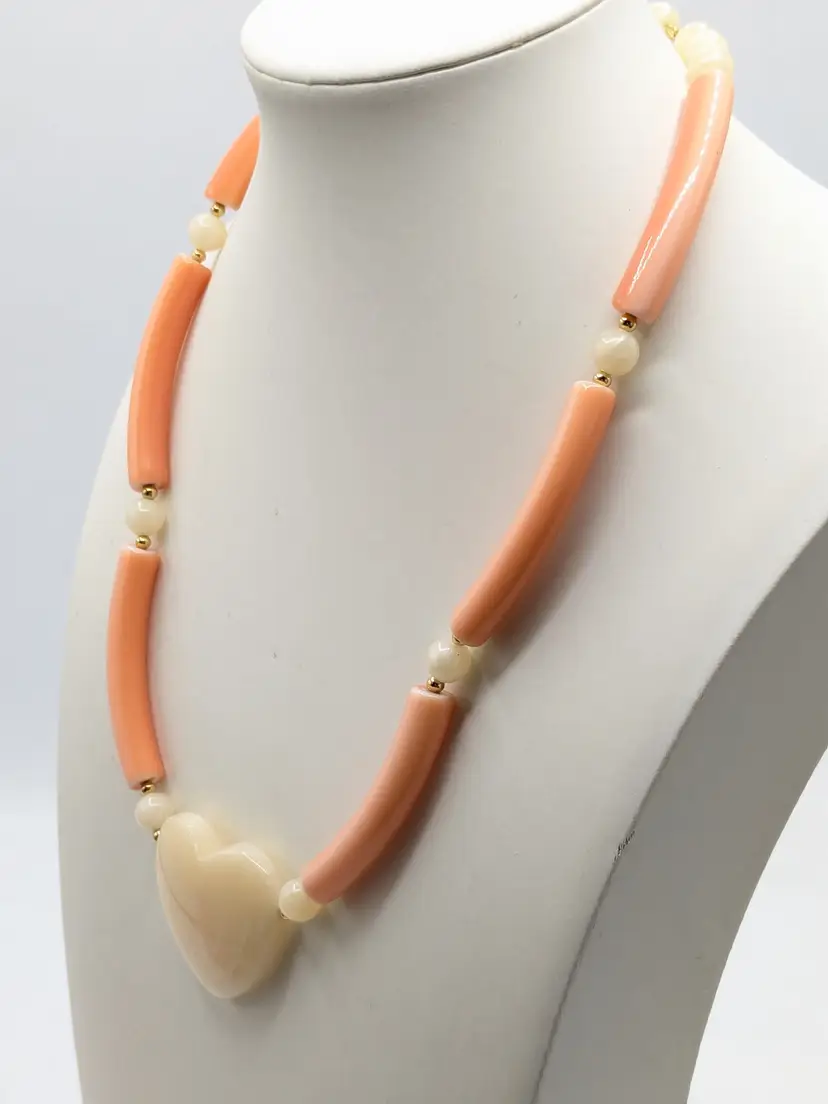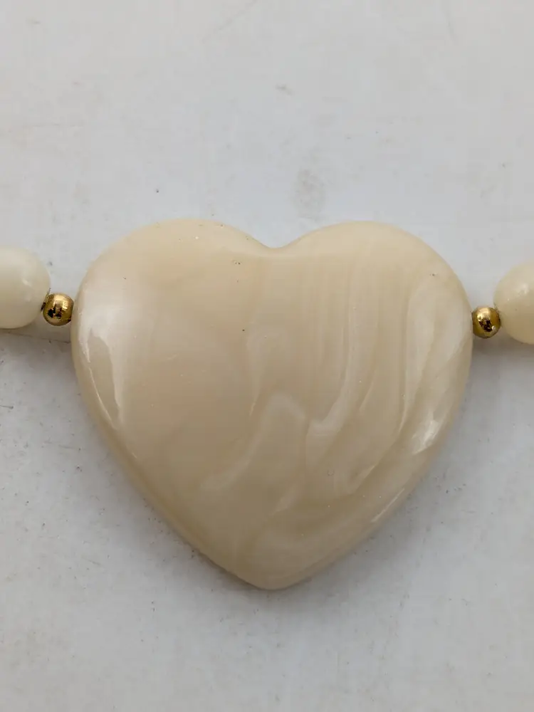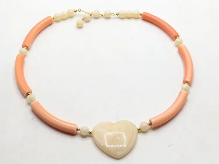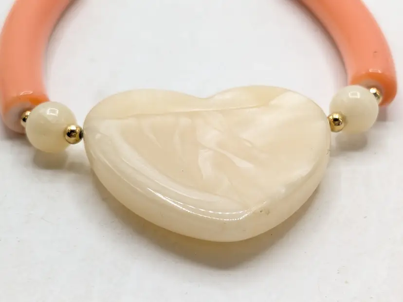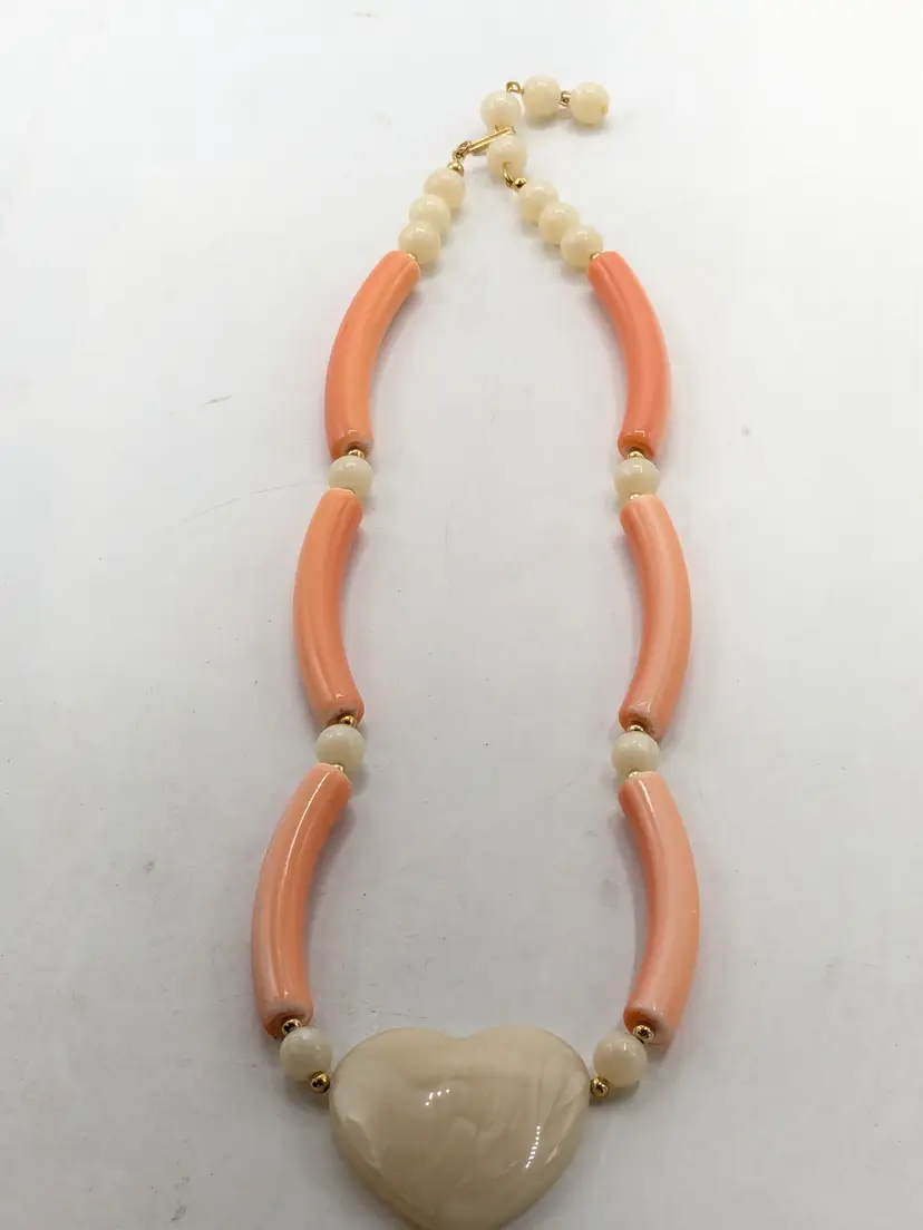 Summer jewelry! Good condition. Features peach and cream acrylic beads with a heart centerpiece. Measures 18" long. Gold tone. Hook closure. Measures 20". wen