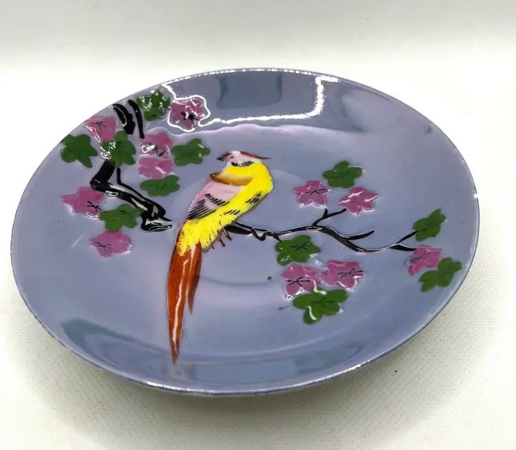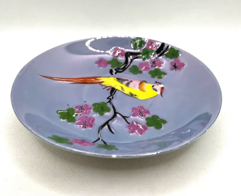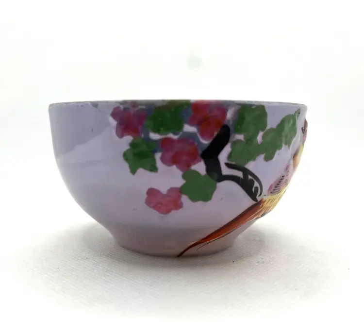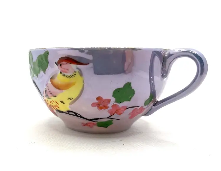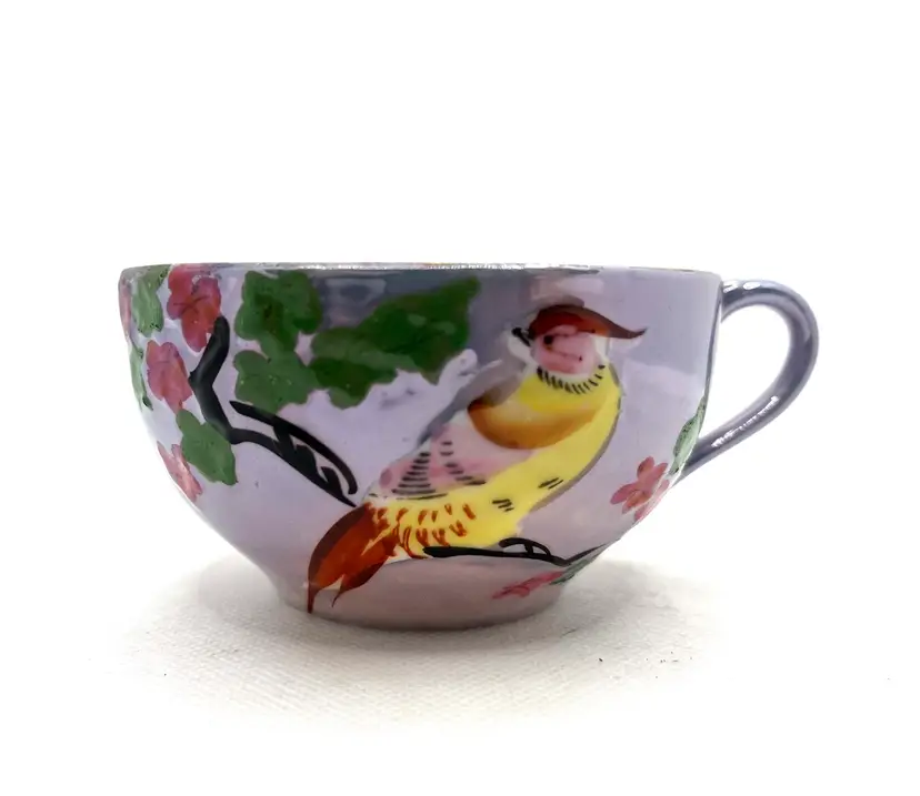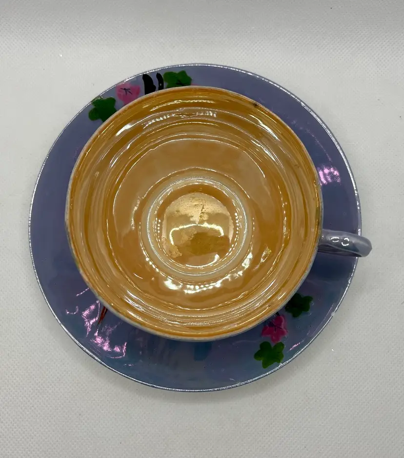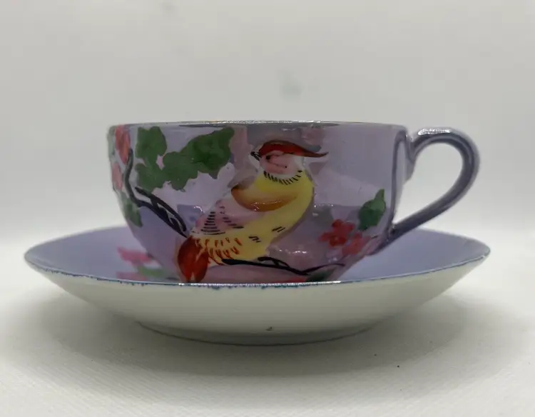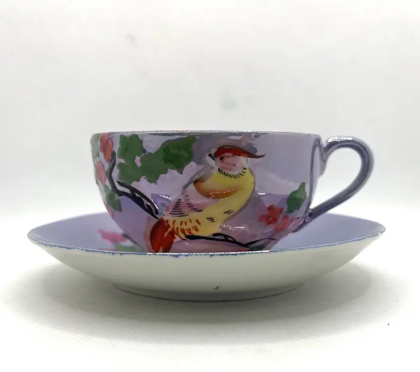 Vintage Peach Lavender Luster Pheasant Bird Pink Floral Japan Tea Cup & Saucer Hand Painted. Minor discoloration on back of plate & rough edges. One tiny chip on plate rim. See photos .
