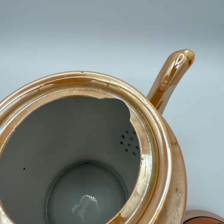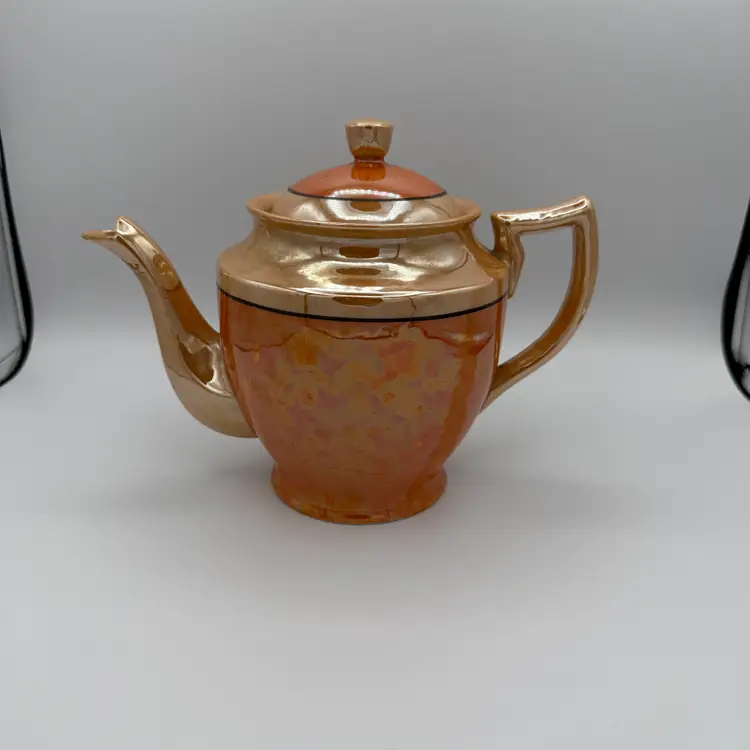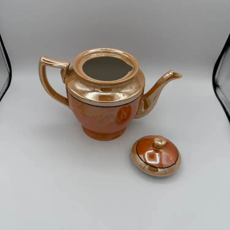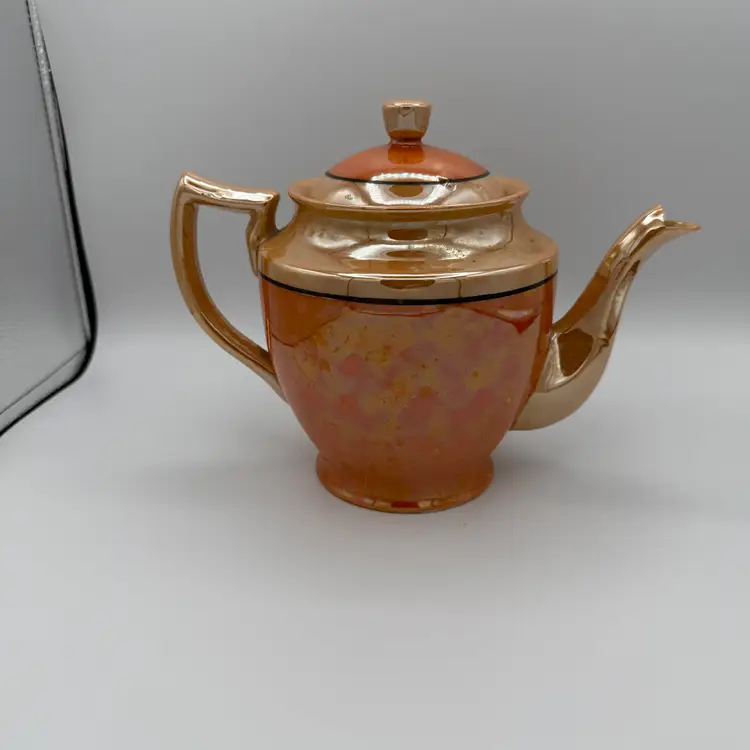 Vintage Peach Lustre Teapot. Iridescent Metallic Glaze. Has Chip On Inside of Lip (Pictured). Chip Is Not Noticeable When Lid Is On. 7" H X 6" Diameter.