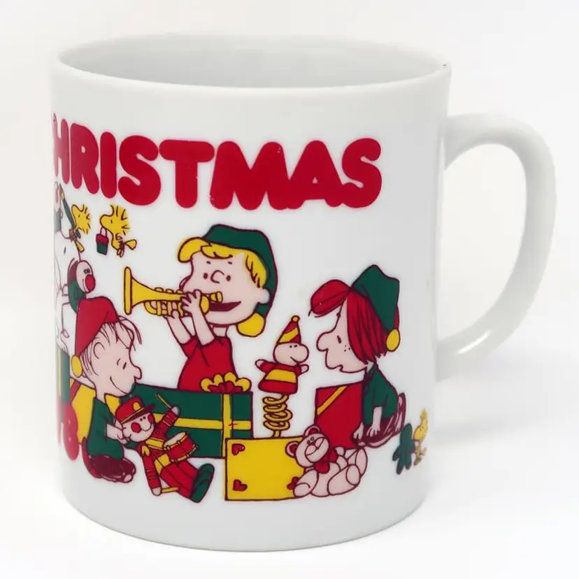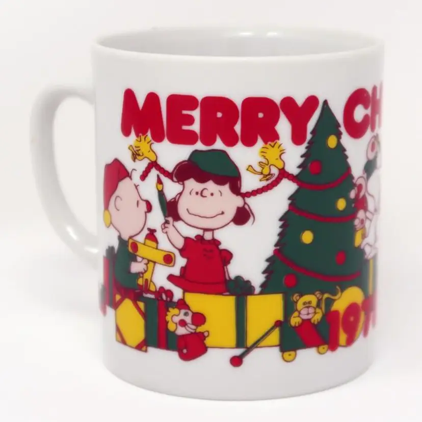 Celebrate the holidays with this charming vintage Peanuts Christmas mug from the 1970s. Featuring Charlie Brown, Lucy, and Snoopy in festive attire, it's perfect for sipping hot cocoa by the fire. A delightful collectible for any Peanuts fan, this mug brings nostalgia and joy to your holiday season.
