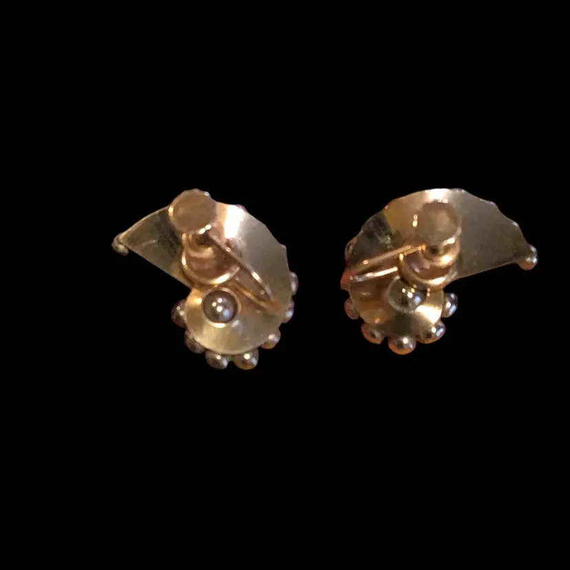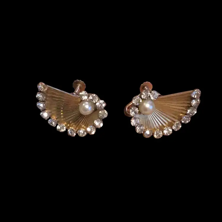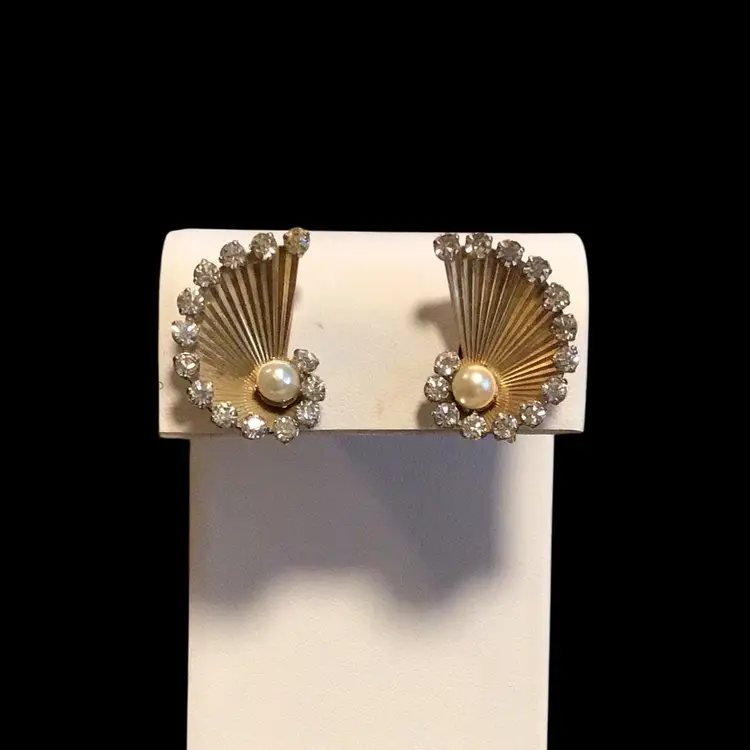 Shell shaped prong set clear rhinestone & pearl screw back, unsigned, 1”x 3/4”. #423
