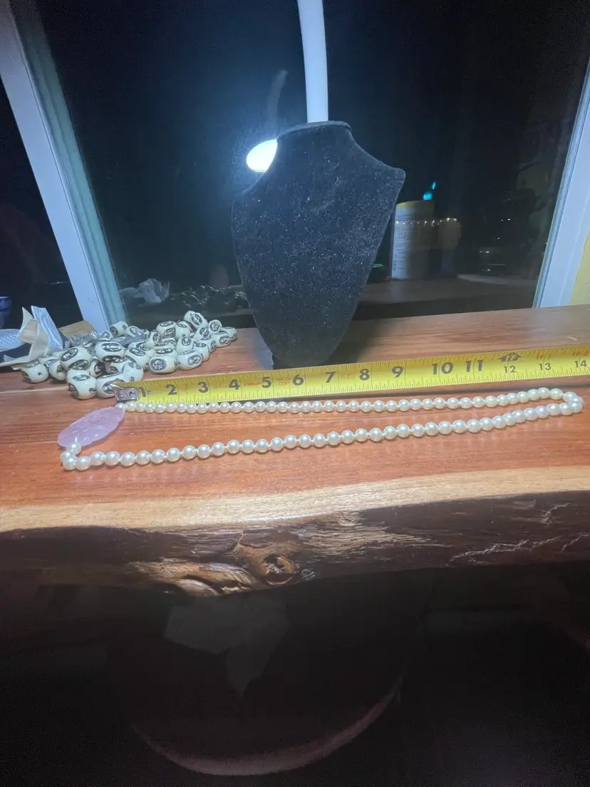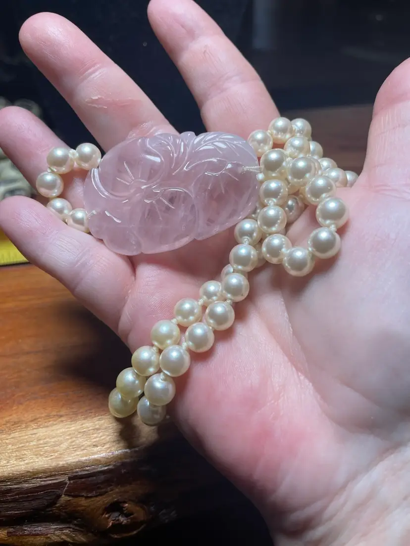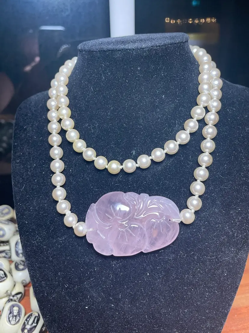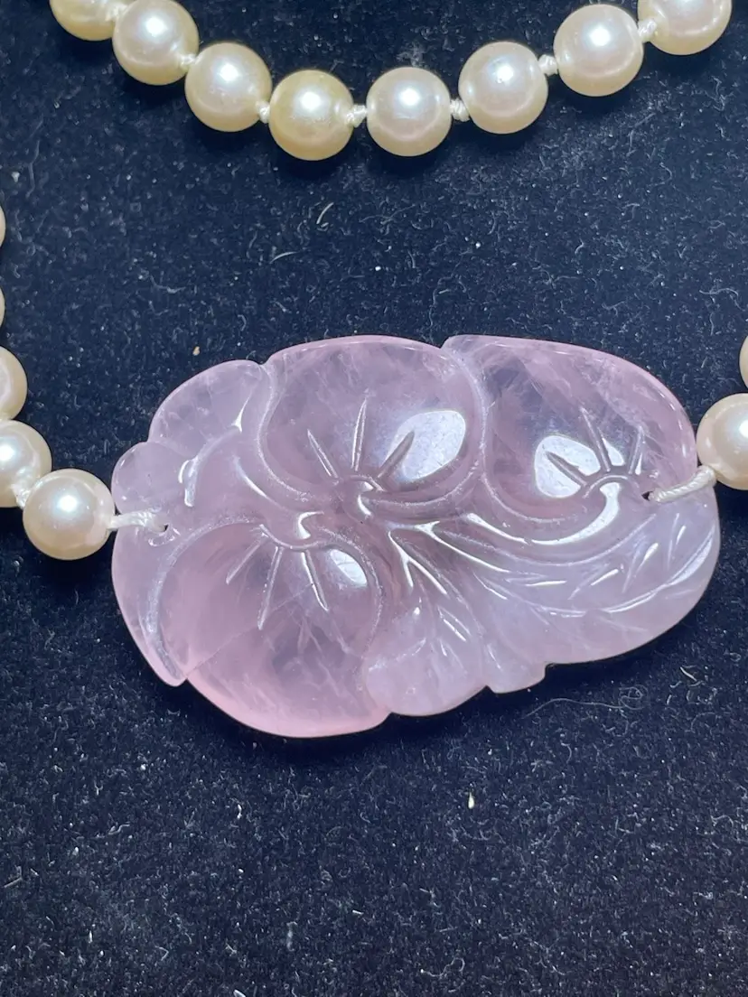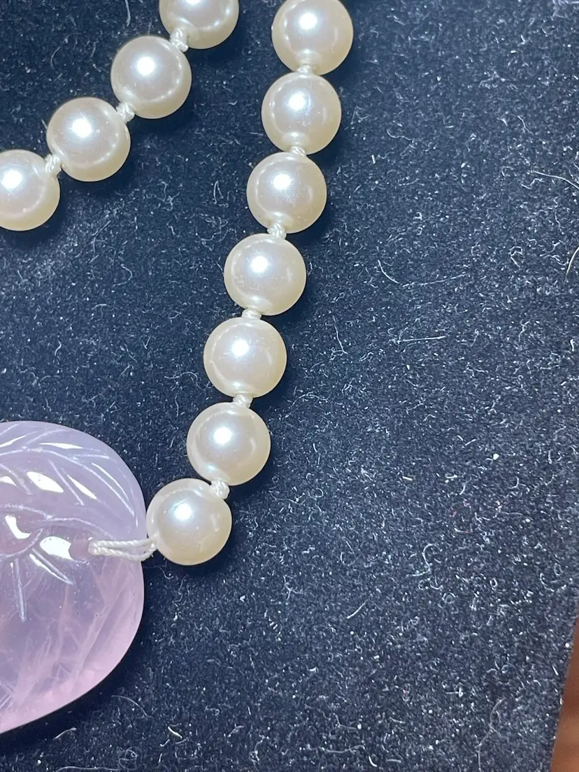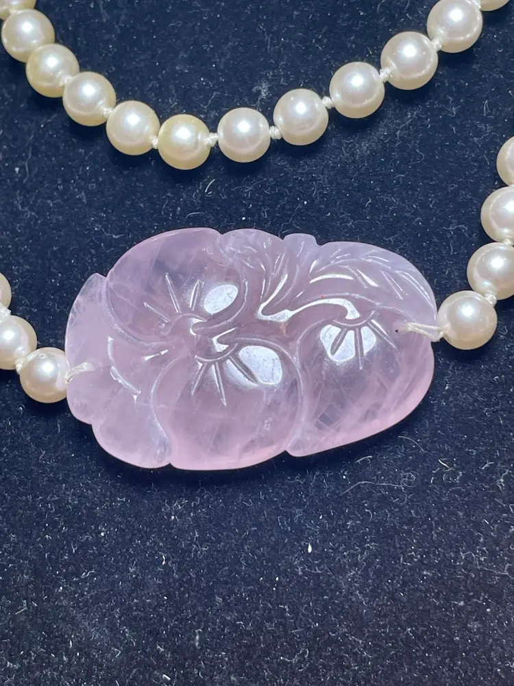 Vintage Pearl Chinese Rose Quartz Beaded Necklace with Carved Rose Quartz Pendant. Excellent condition. I don’t know if they are real Pearls but they are individually knotted
