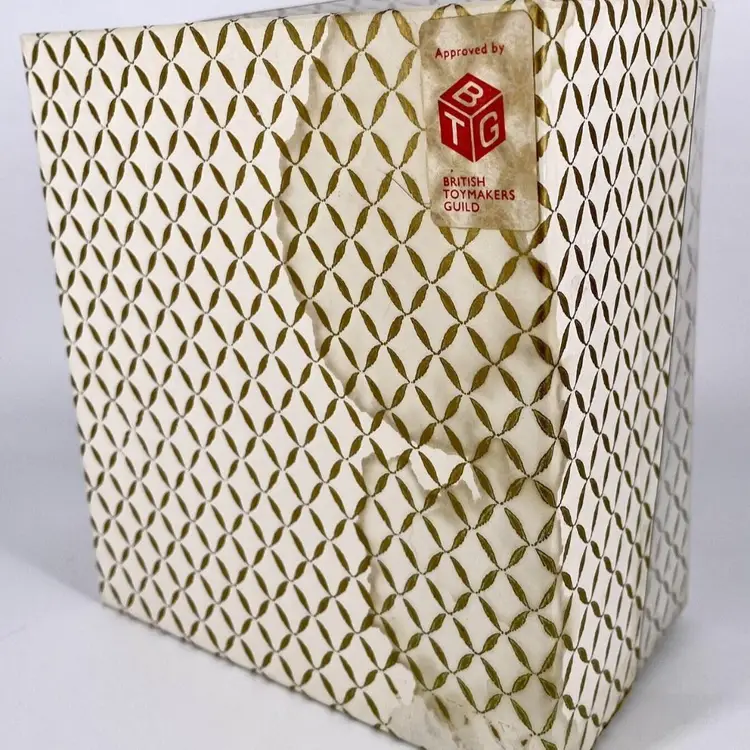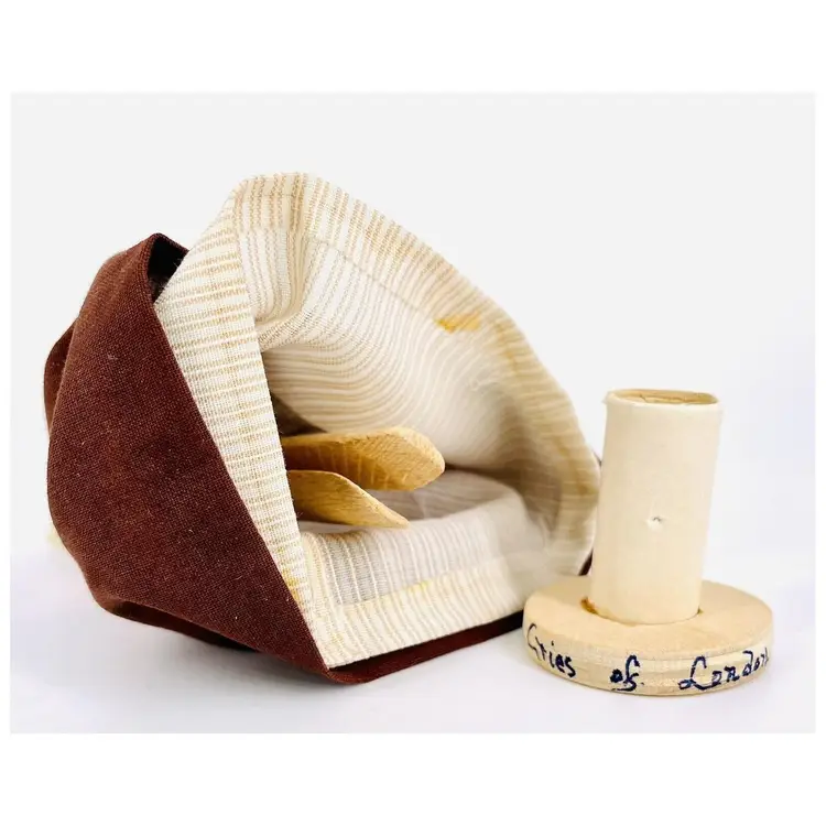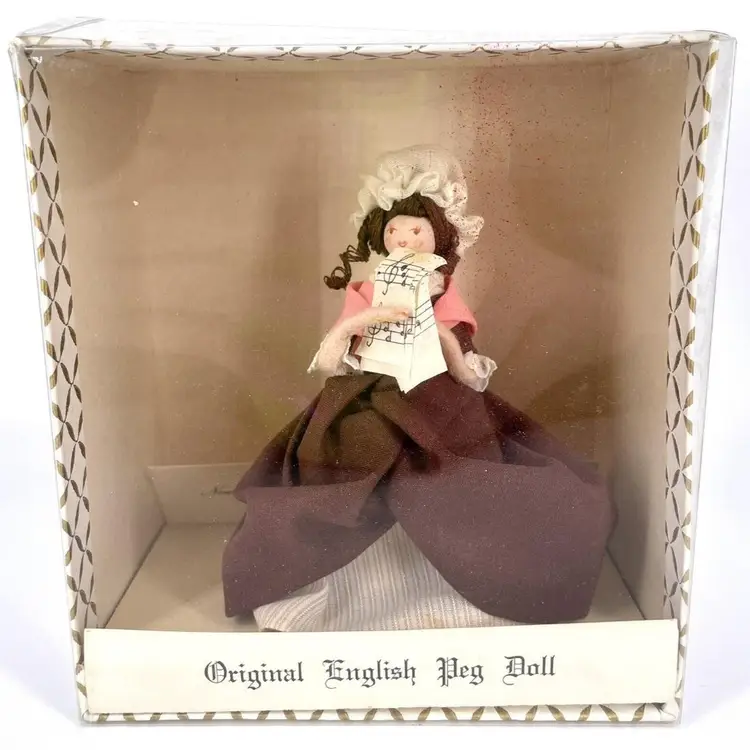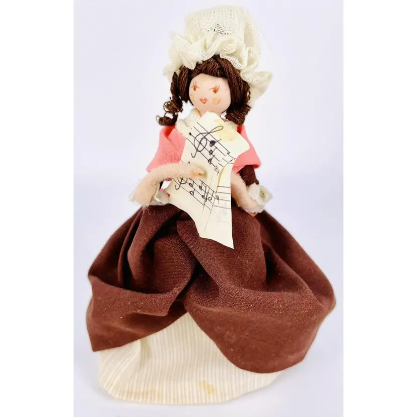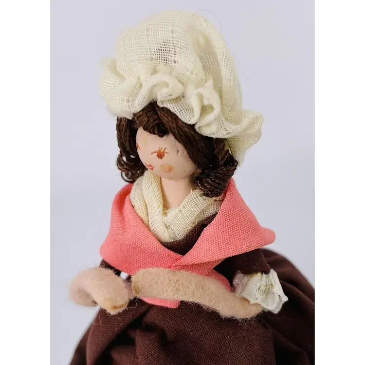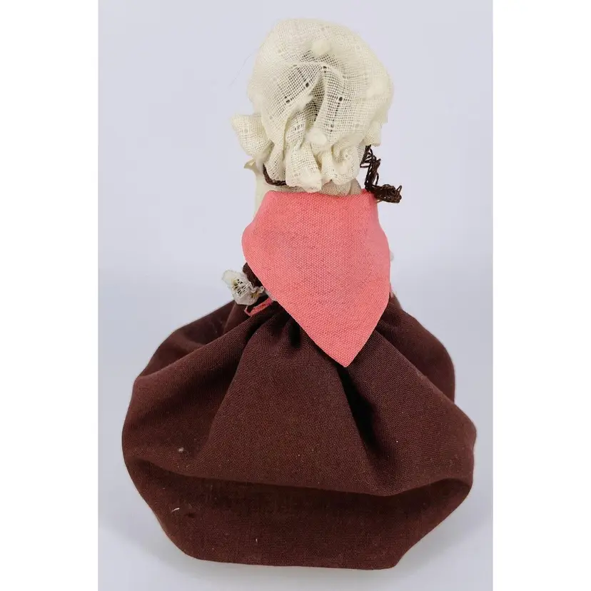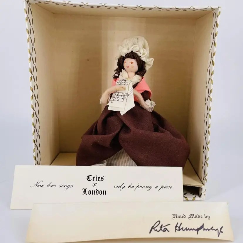This item is in good vintage condition. Some staining on clothing from age. Handmade by Rita Humphreys. Comes with stand and box. The box is warped slightly with some water damage. See images for details. The box measures 5"x6"x3 1/8". The doll measures approximately 5 1/4" tall when in her stand. Weighs 4oz.
