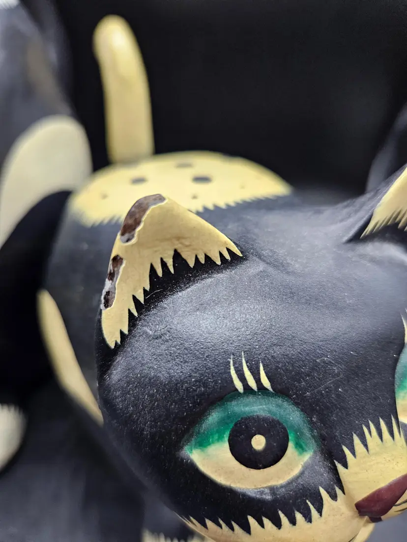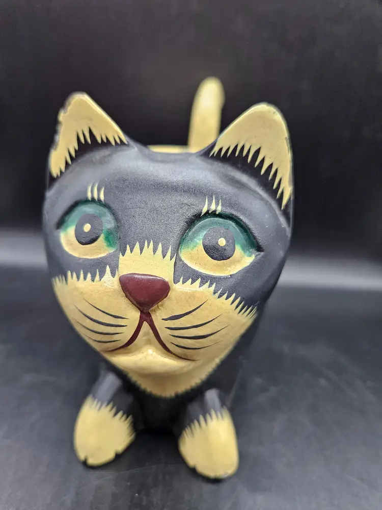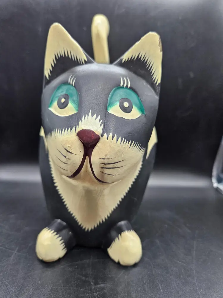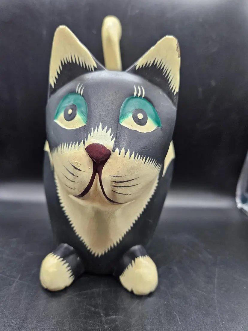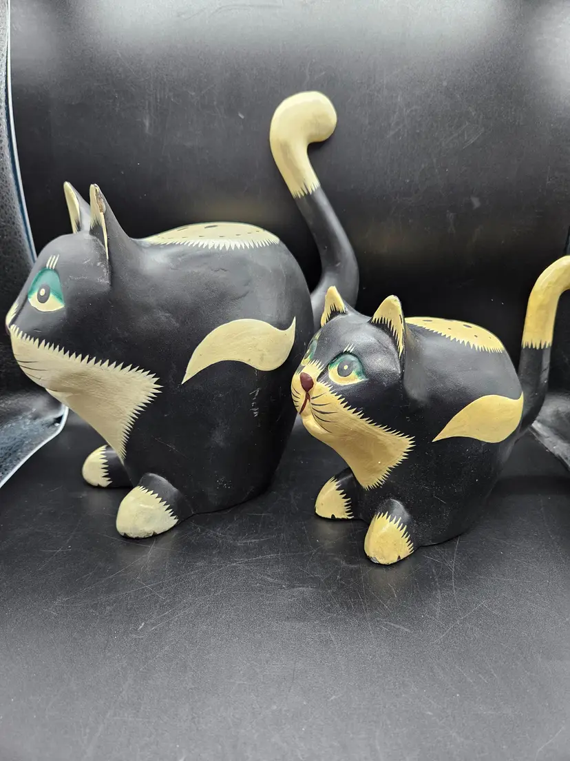 These vintage Pier 1 wooden cat figurines are a must-have for any collector of primitive folk art. The set includes two pieces, one measuring 6 inches and the other 10 inches in height. The cats are beautifully painted in black and cream, showcasing the attention to detail that Pier 1 is known for. Made from high-quality wood, these figurines are sure to stand the test of time and make a great addition to any decor. The cats are perfect for enthusiasts of feline-themed collectibles, and are sure to add character to any room. Don't miss out on this unique opportunity to own a piece of Pier 1 history. Height is including the tail. Cute distressed look, a few chips and distressed paint around the ears and feet. See photos. Items are as is.
