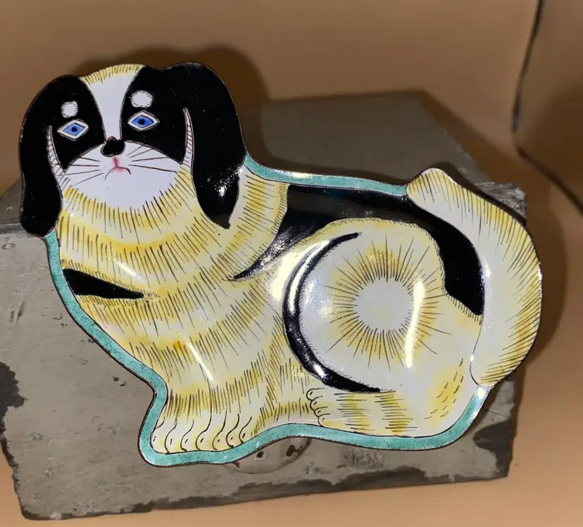 This trinket dish was made in the style of Seymour Mann. No makers mark. The dog pieces are harder to find since he was known more for his cat and floral pieces. Excellent vintage condition.