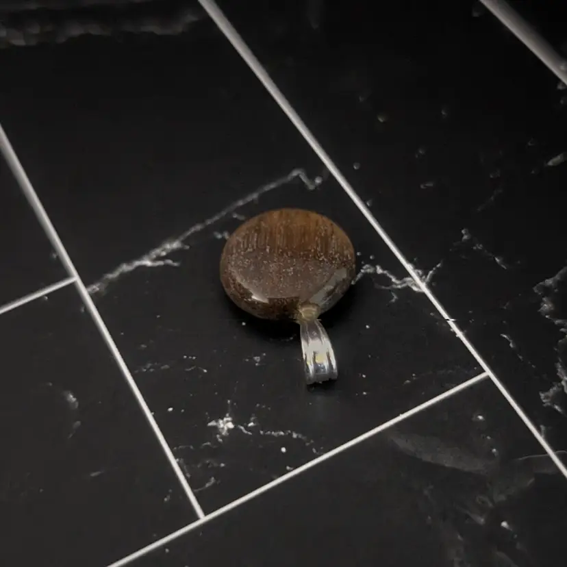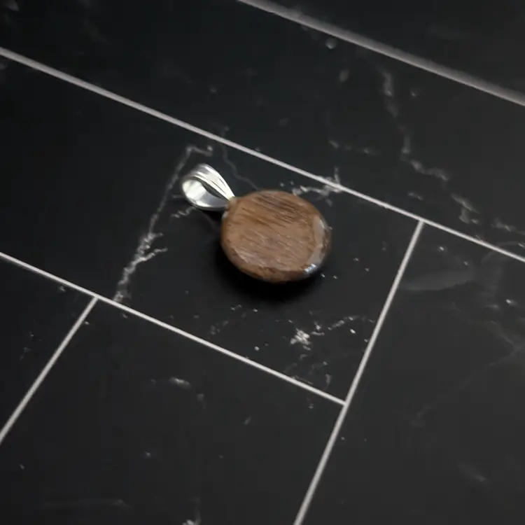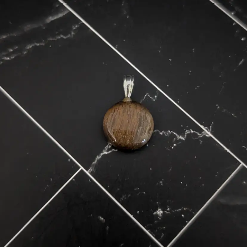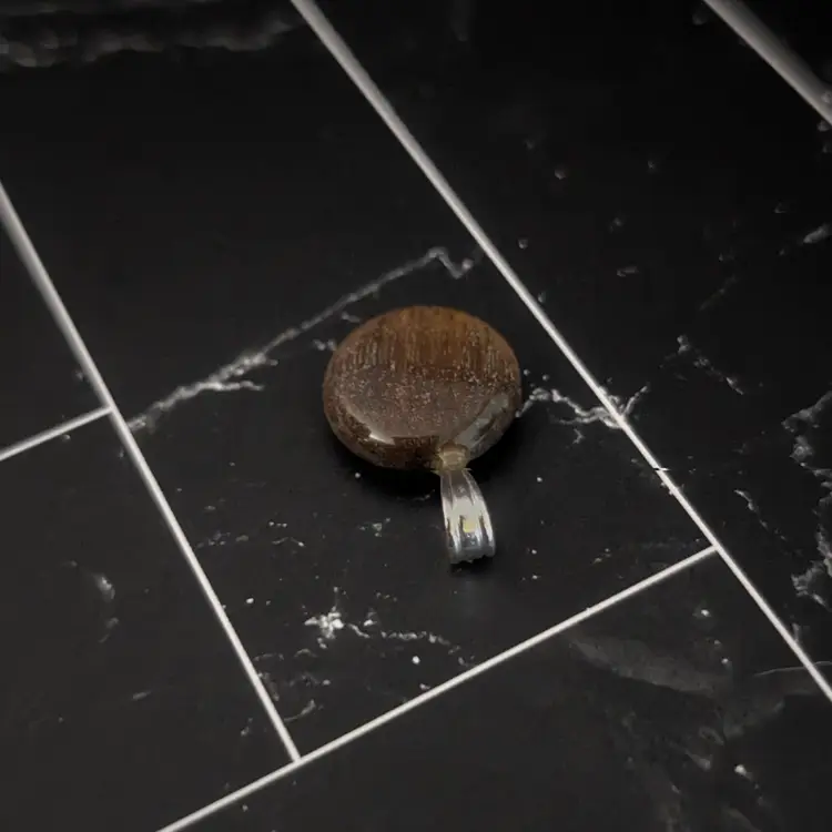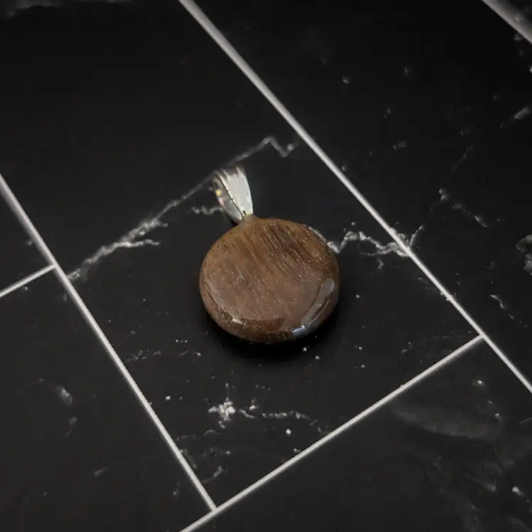 This pendant measures about 0.5" not including bail. Some surface marks and imperfections. Small amount of glue visible where bail meets pendant.