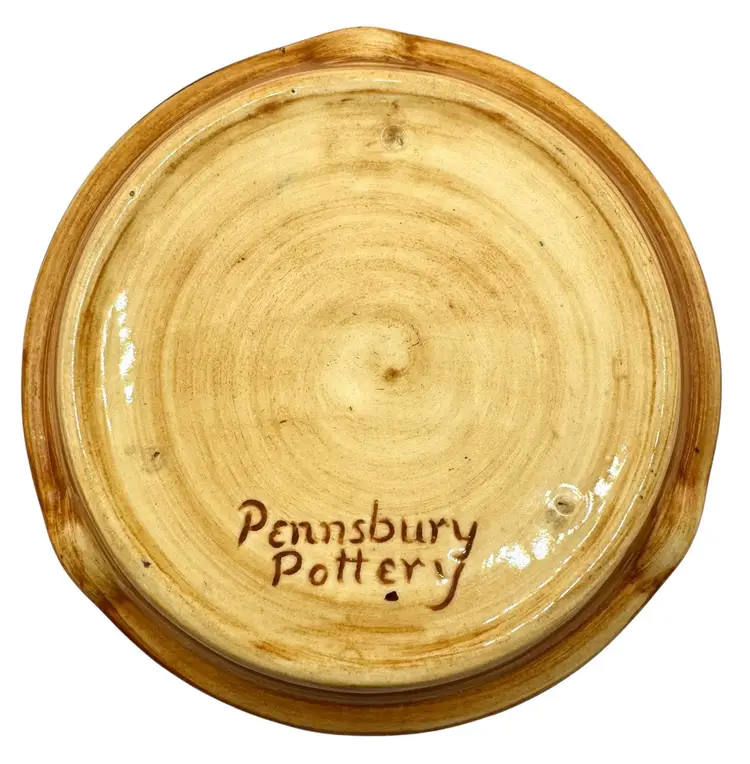 Small pottery ashtray made by Pennsbury Pottery in Morrisville, Pennsylvania. It depicts an Amish couple holding beer and pretzels.