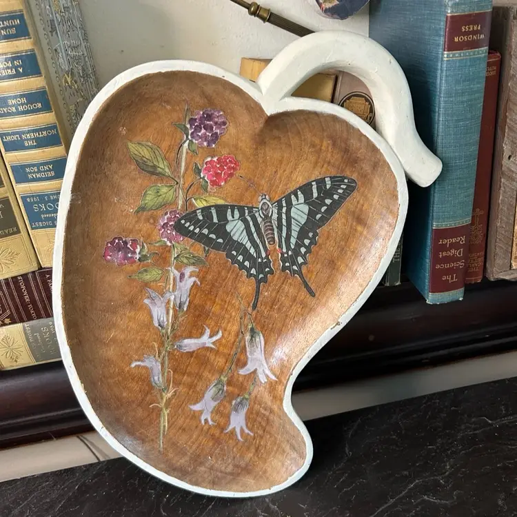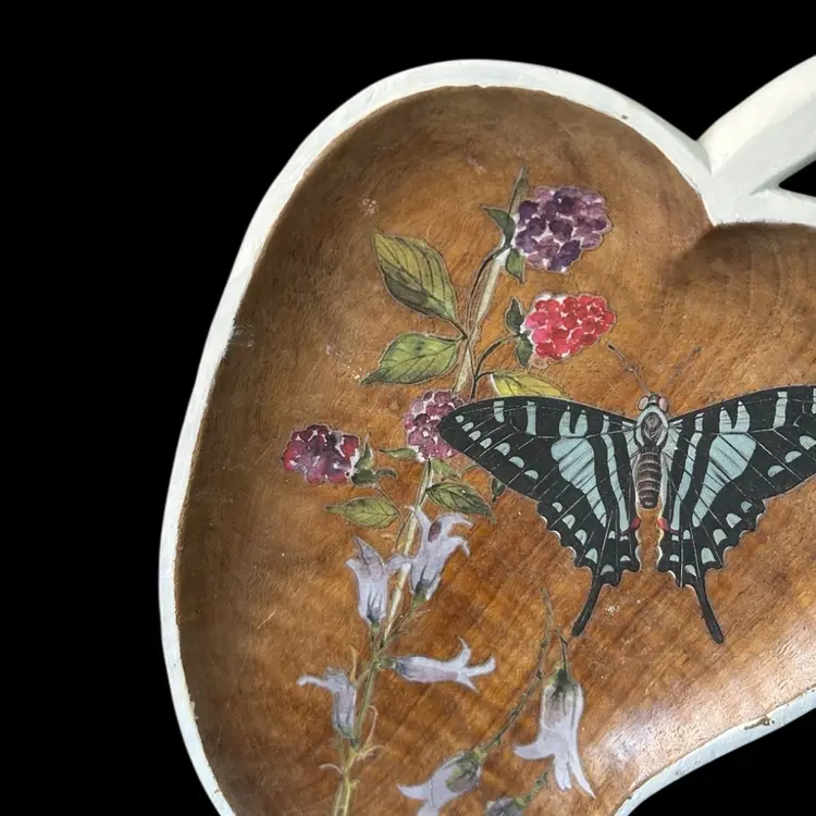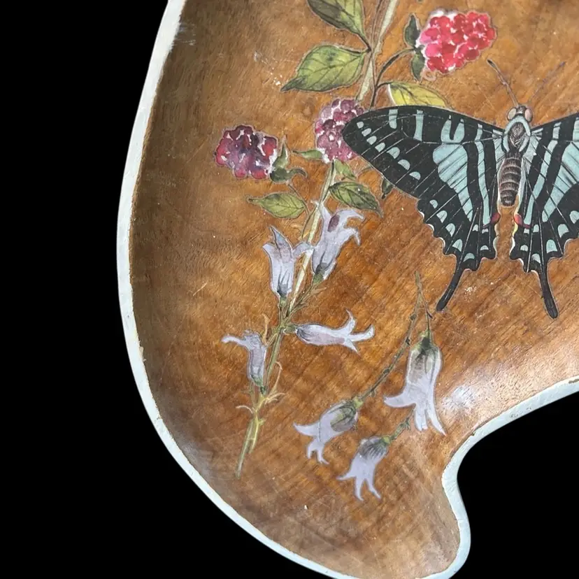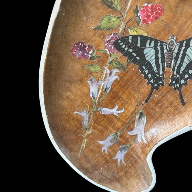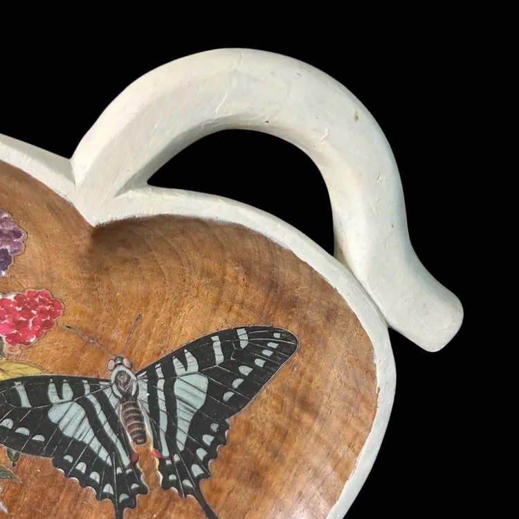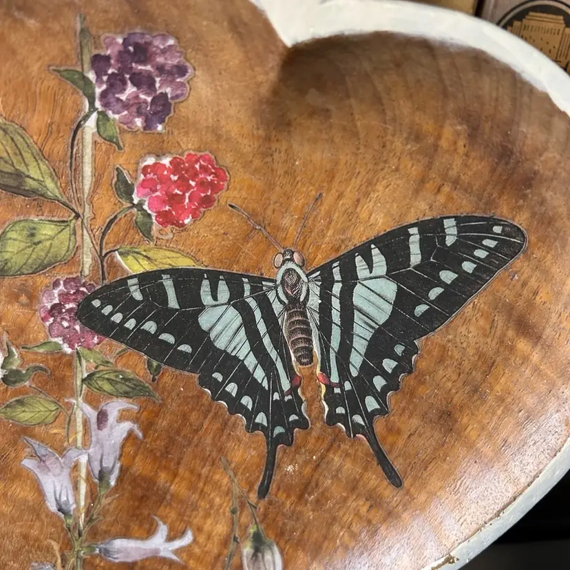 13.5x9.5". Beautiful wood. Stained in Walnut, added transfers of butterfly and florals. D-ring to hang.