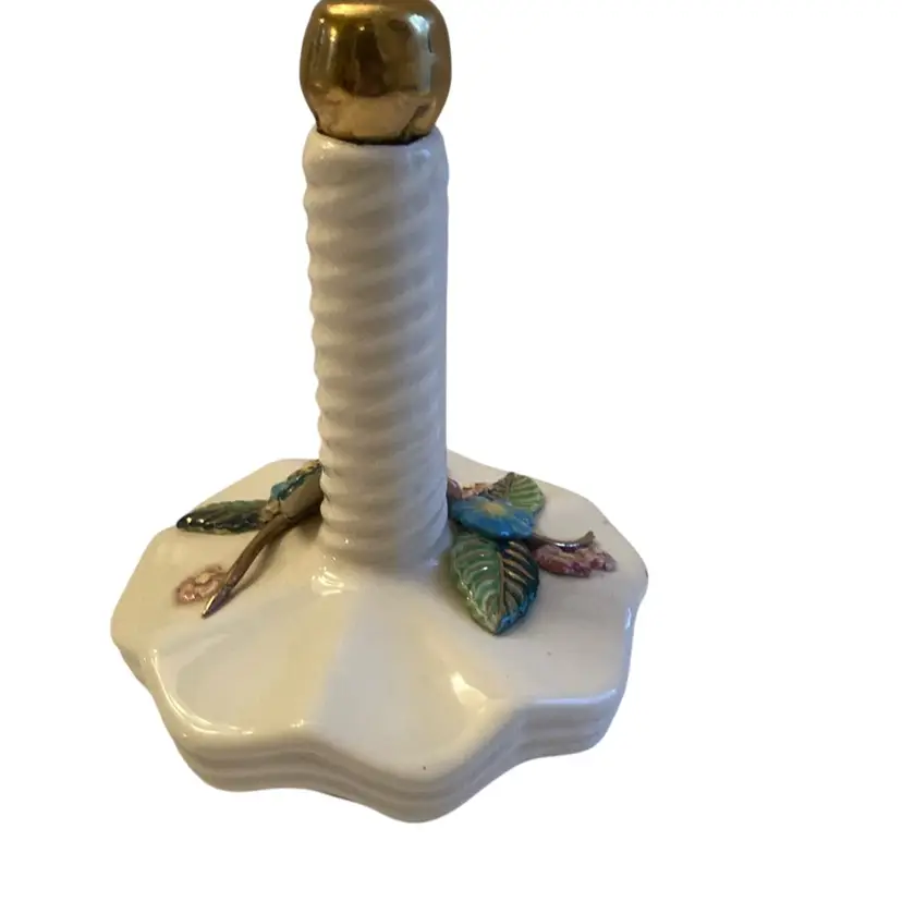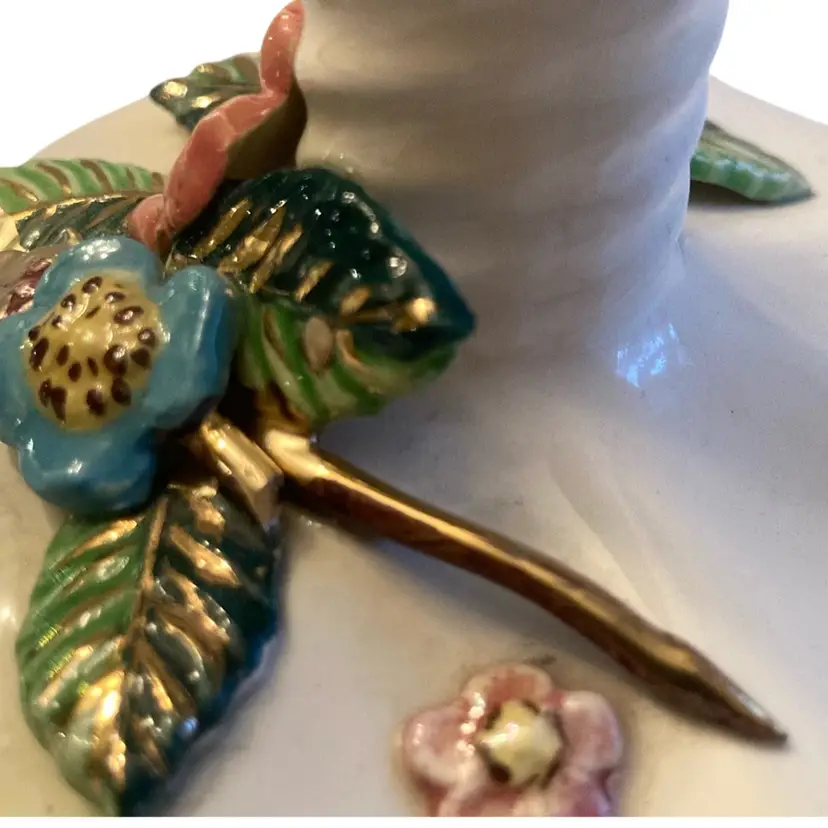 5” tall bone China perfume bottle with porcelain flowers pink, blue with green leaves and gold embellishments. One of the gold embellishments has broken off but is not very noticeable- shown in last picture.