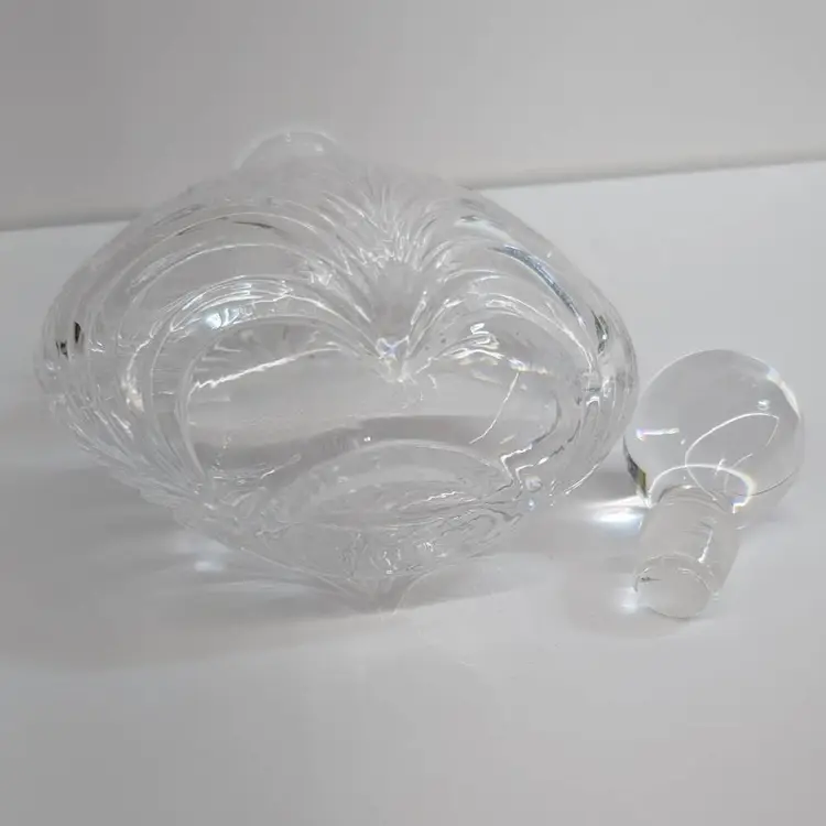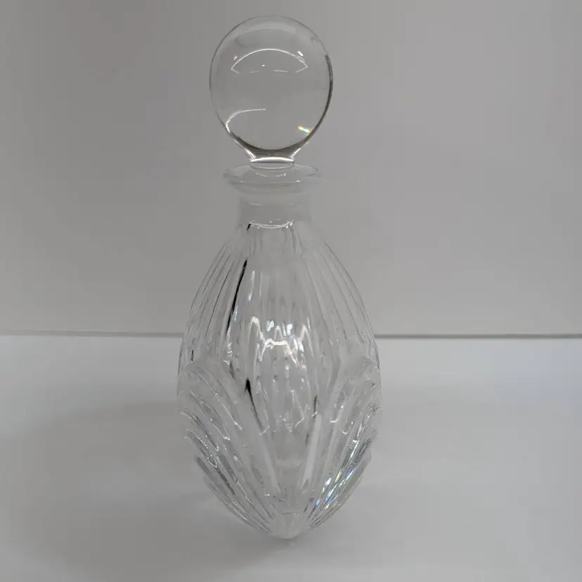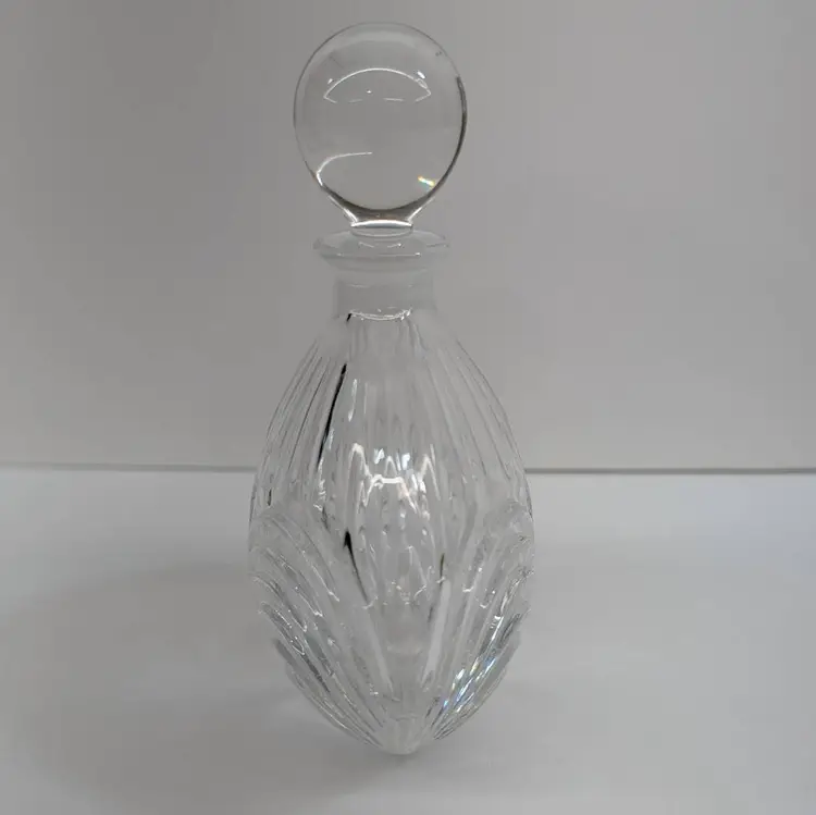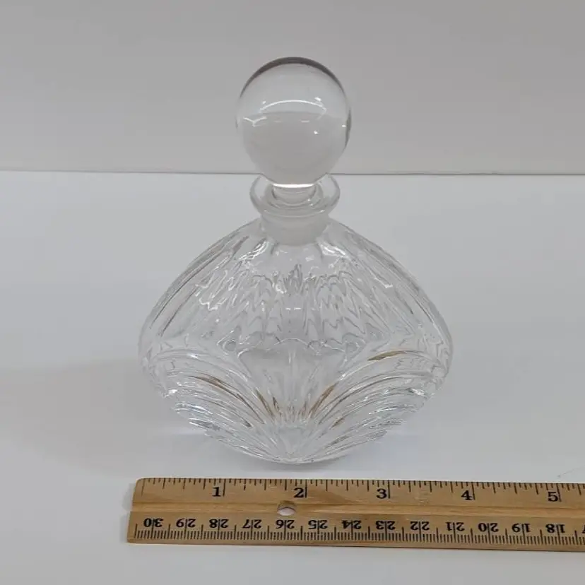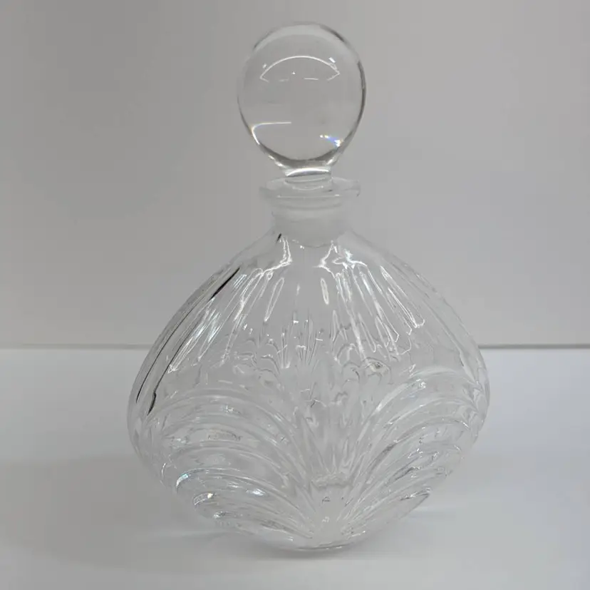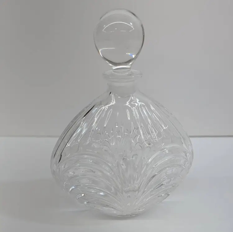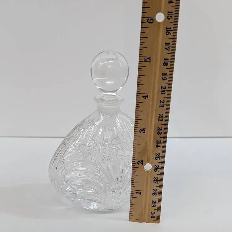 Clear, crystal perfume bottle from Royal Crystal Rock. If has a nice drape pattern and ball stopper. In nice, used condition but there is a line around the stopper and a small flea bite on the base of the stopper (see pictures). Measurements ~ 4 x 2 x 5"