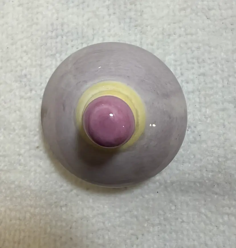Charming ceramic teapot featuring a floral design. Accented with yellow and purple colors. Small artistic, teapot. beautiful hand painted. There are no chips, cracks or stains beautiful condition. Measurements top of the tea cup is 21/4 inches in diameter. The opening itself is one and 1/4 inches the width of the teapot from the spout to the handle is 6 1/4 inches the small pedestal bottom is 3 1/2 inches in diameter. The height of the teapot with lid is 4 1/4 inches beautiful enough for an art deco piece to decorate with.