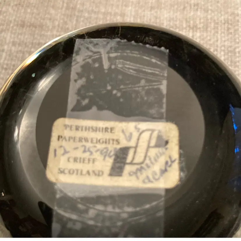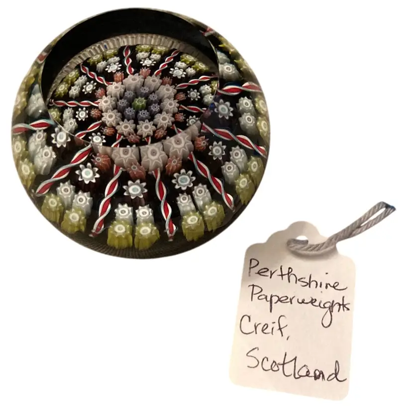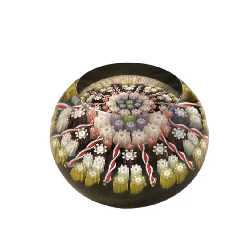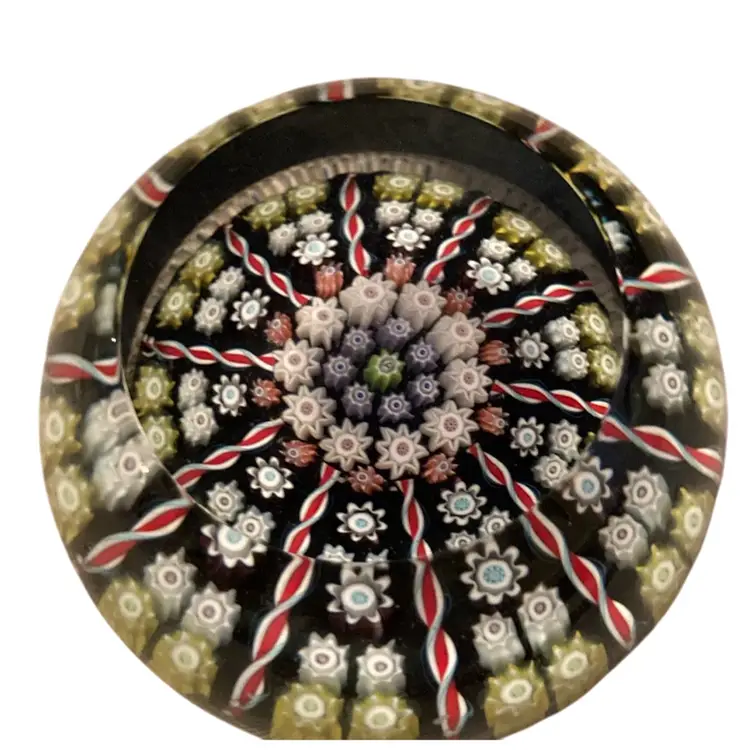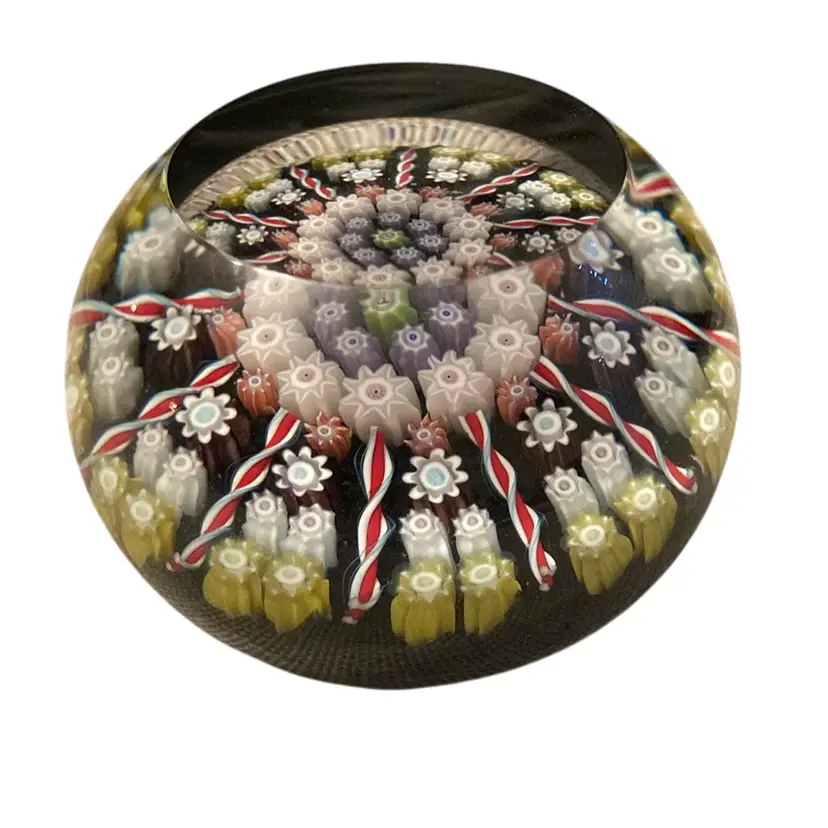 Beautiful black with white millefiori and red twisted lines. Clear and flat on top. Sticker on bottom. Made in Scotland 1.5” x2.5”