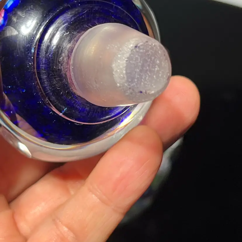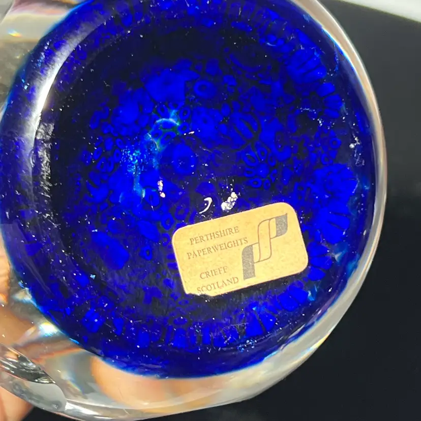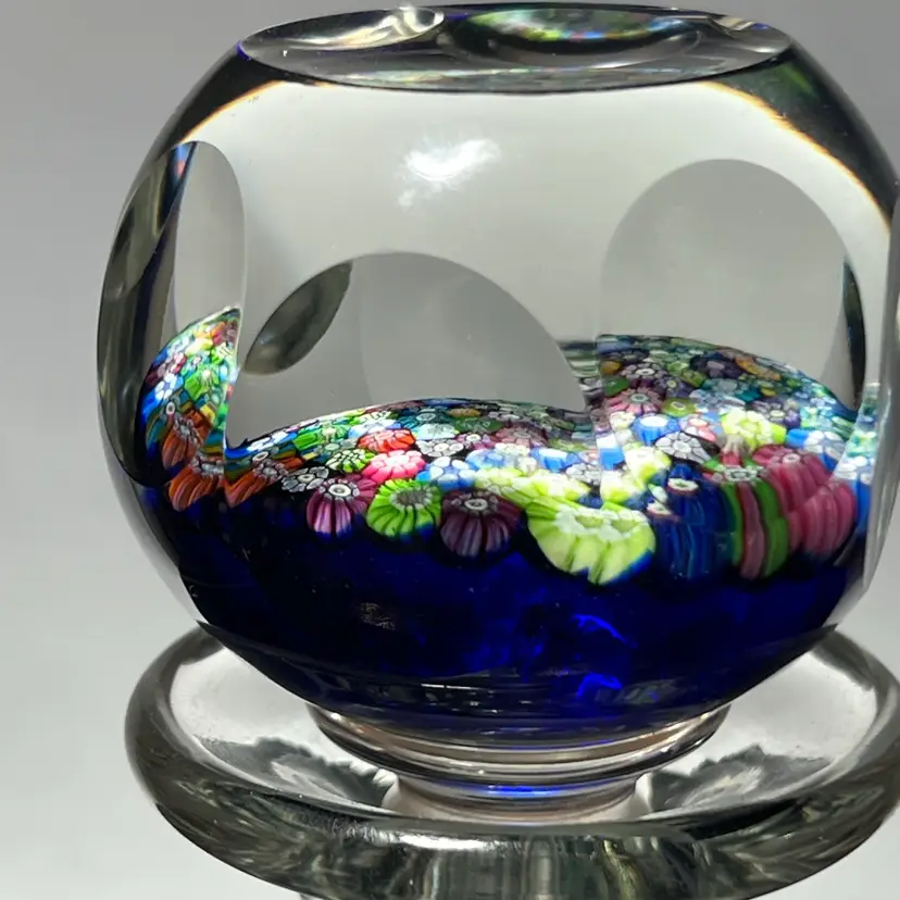 A beautiful 6.5” bottle and matching stopper both with closepack millefiori. Original paper tag on bottom. In Excellent condition.