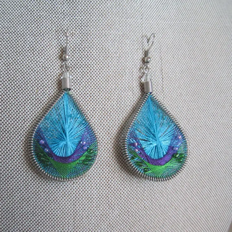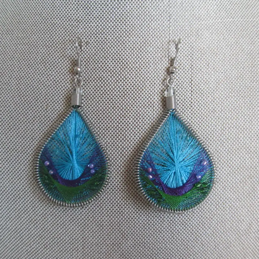 Vintage Peruvian blue silk thread earrings with beaded accents. The earrings measure 1 1/4" and drop down 2 3/4" down.