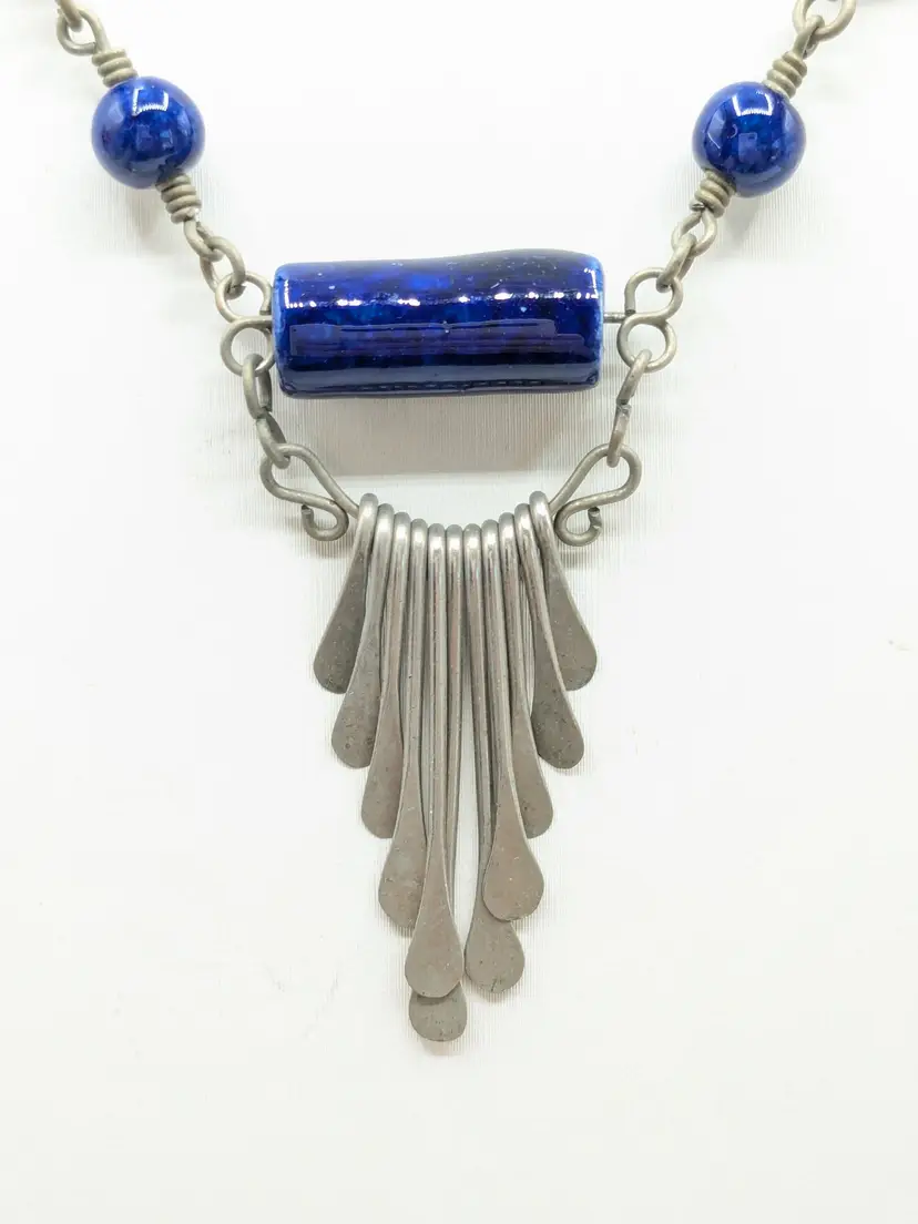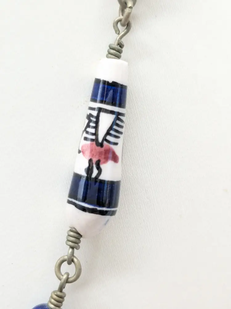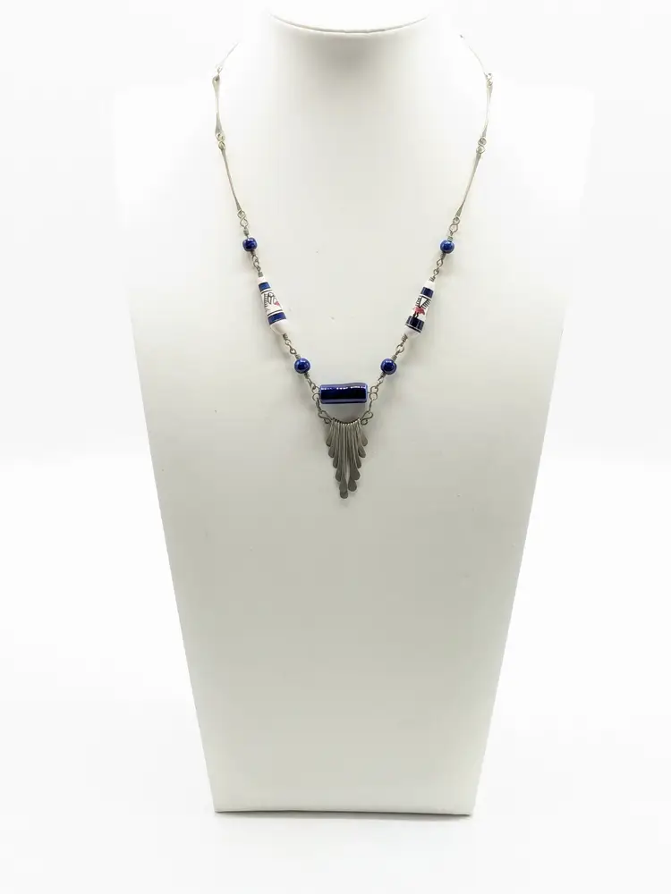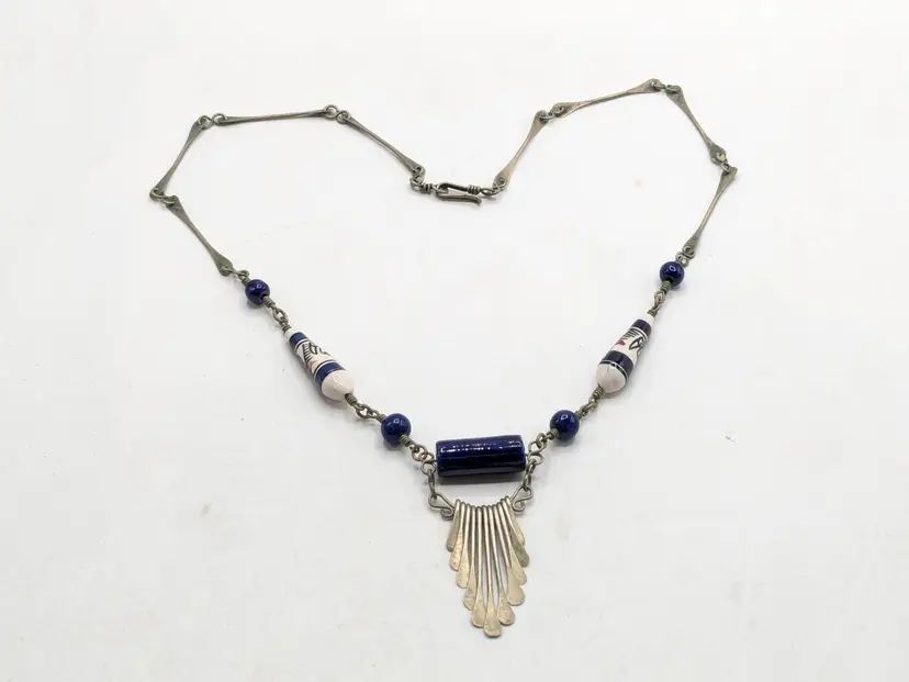 Good condition. Features ceramic Peruvian blue and white beads. Flat brushed silver tone. Measures 17" and drop is 2". wen