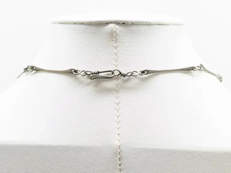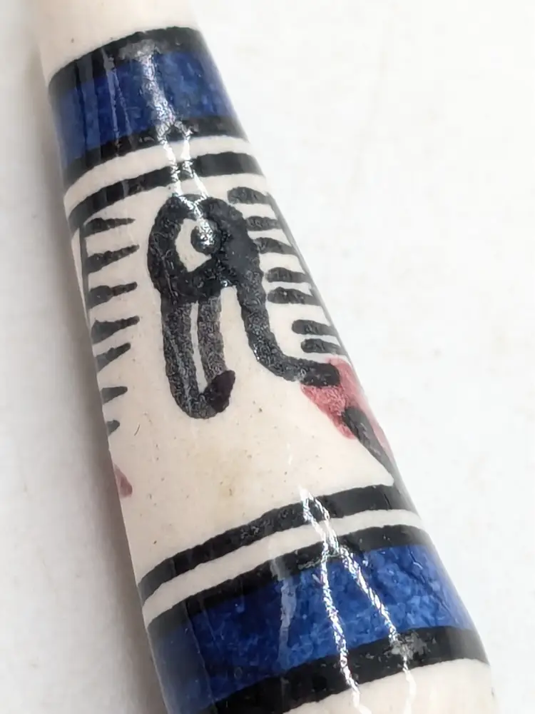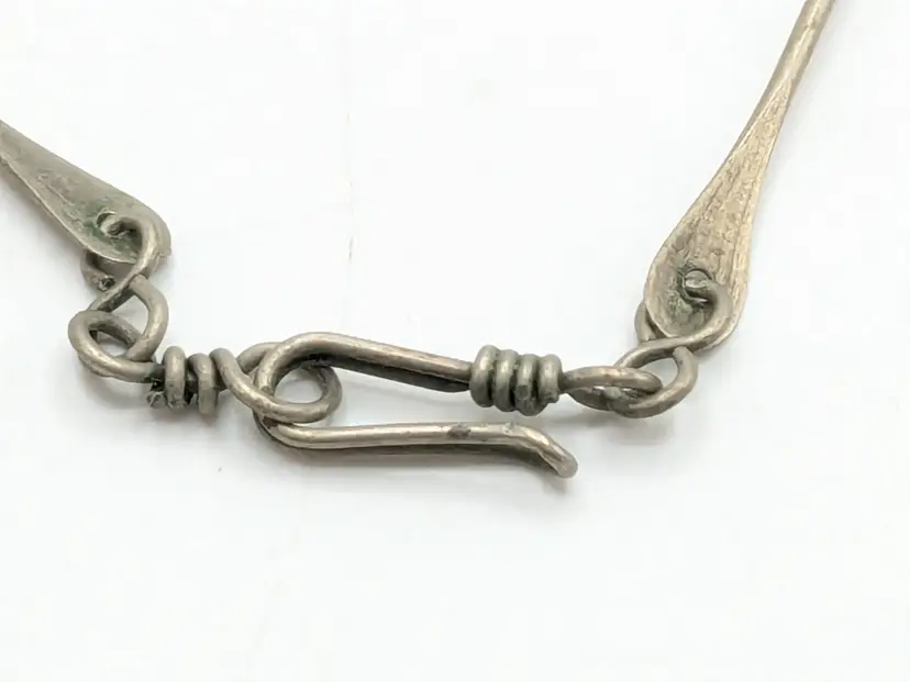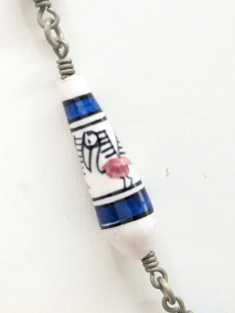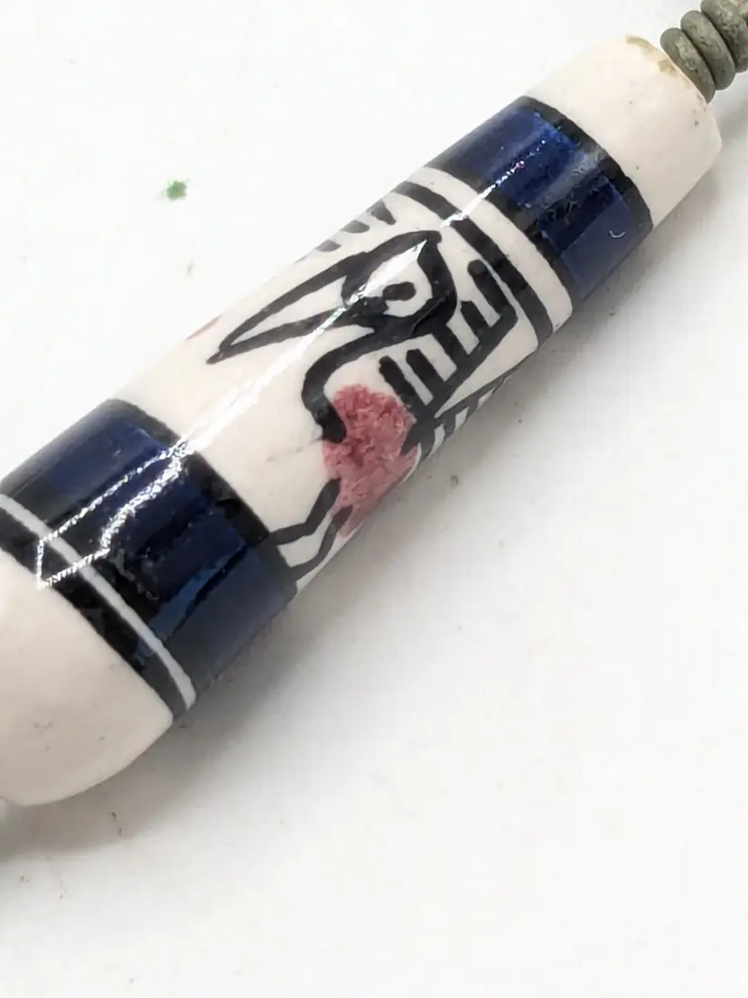 Good condition. Features ceramic Peruvian blue and white beads. Flat brushed silver tone. Measures 17" and drop is 2". wen