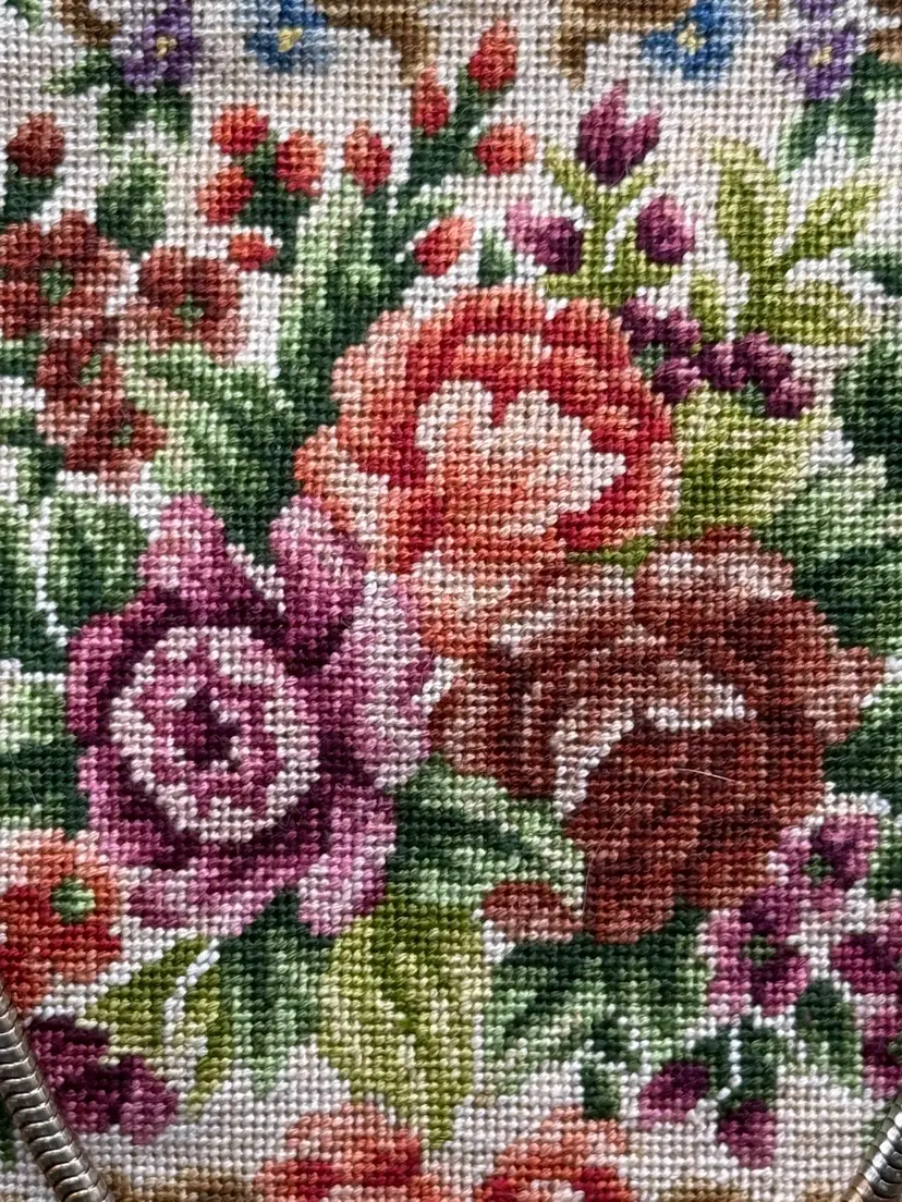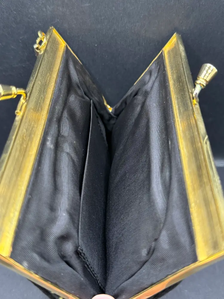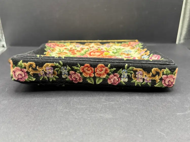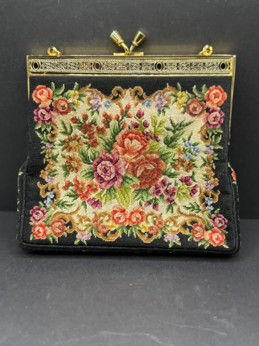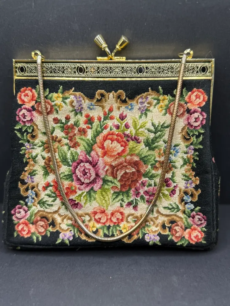 A vintage 1950s petite point handbag with an embroidered floral tapestry design, often referred to as a clutch or evening bag. Here are some key details about this style of handbag: Material and Design: The bag is typically made with a fine petit point embroidery, creating a detailed and textured floral pattern. The base material is often a dark color, such as black, which allows the colorful floral design to stand out. Frame and Closure: The handbag features a metal frame, often gold-toned, with a kiss-lock closure. The frame may have decorative elements and a chain strap for carrying. Style and Era: This style of bag was popular in the 1950s and is often associated with vintage fashion. It is considered a classic and elegant accessory suitable for special occasions or evening events.