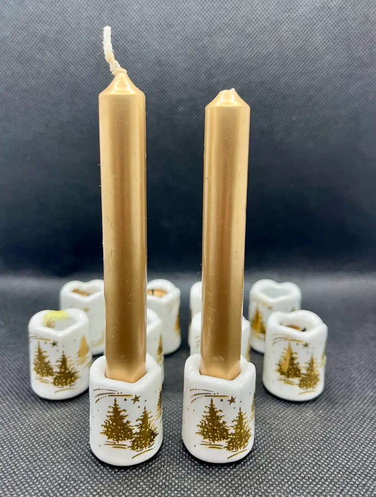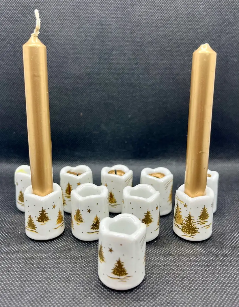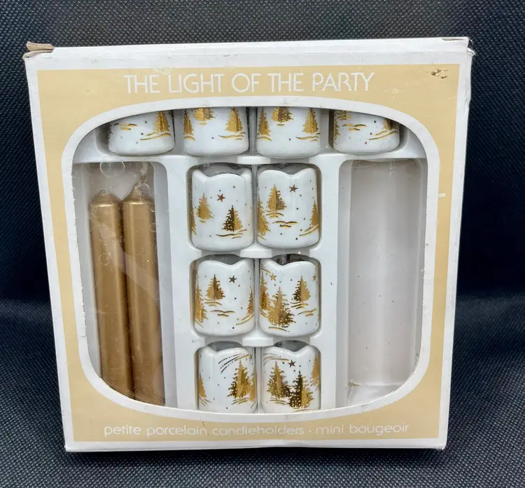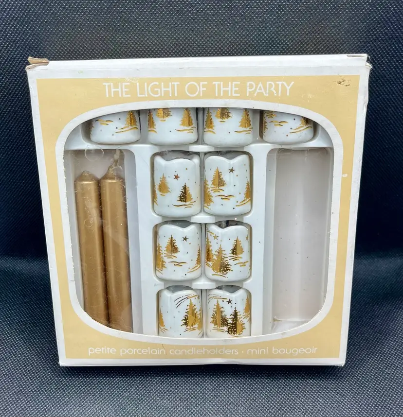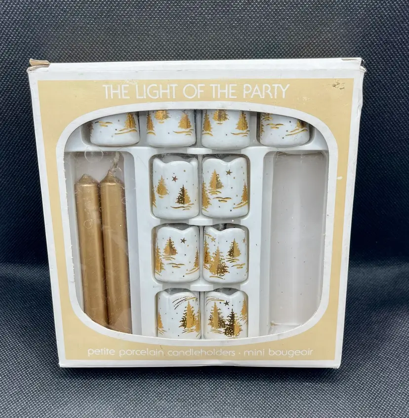 Vintage set of "The Light of the Party" vintage petite porcelain candle holders with gold Christmas tree designs and matching gold candles.