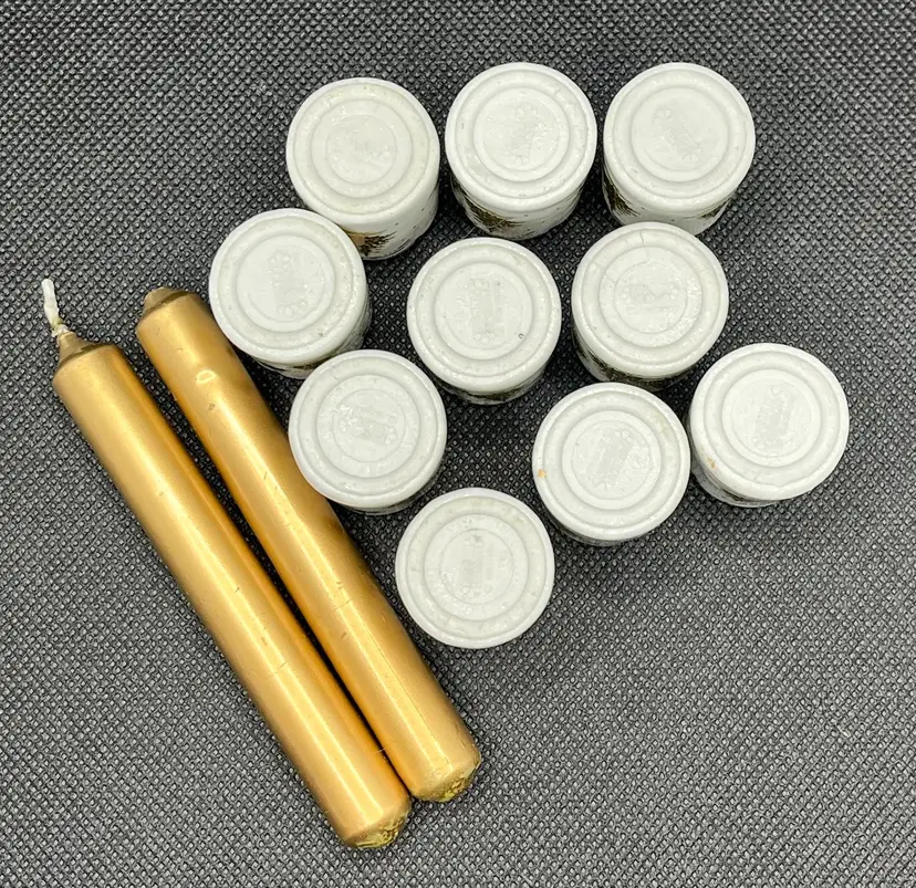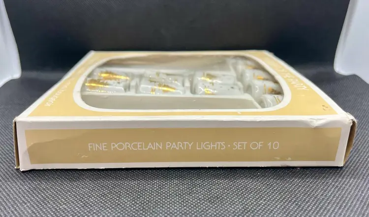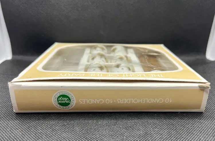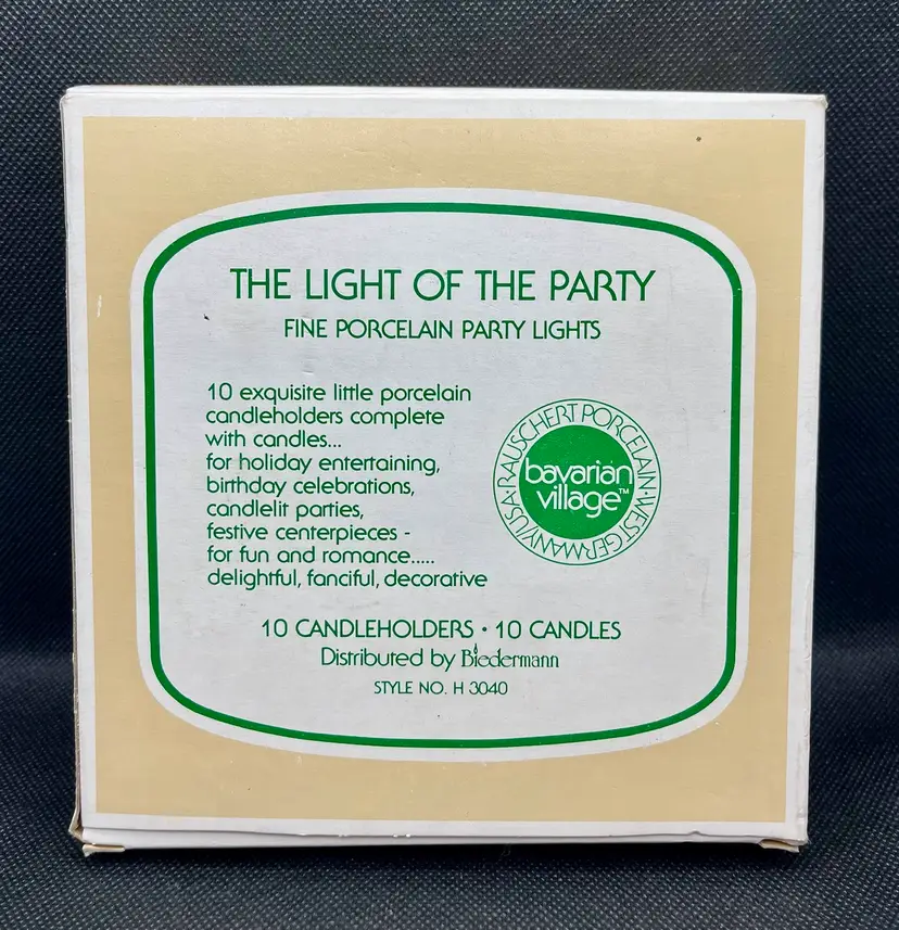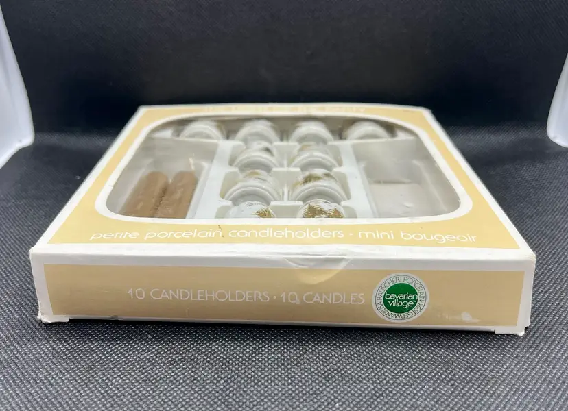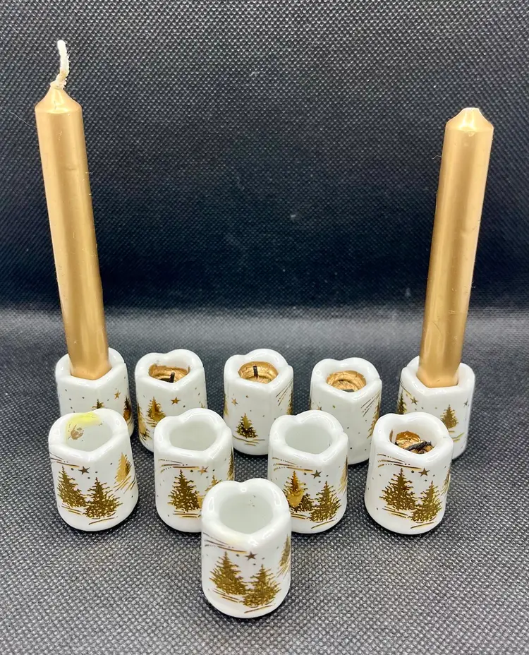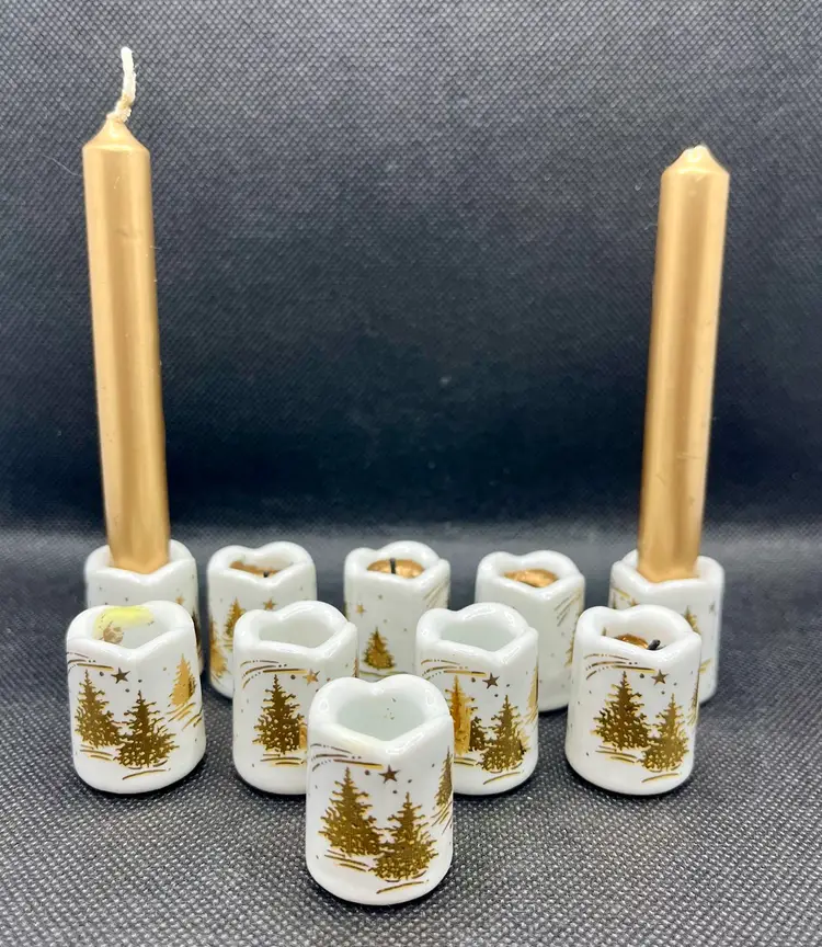 Vintage set of "The Light of the Party" vintage petite porcelain candle holders with gold Christmas tree designs and matching gold candles.