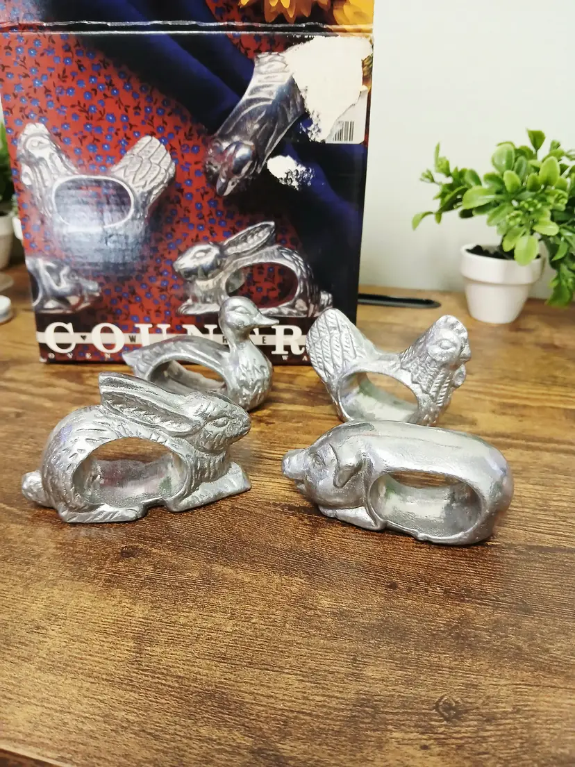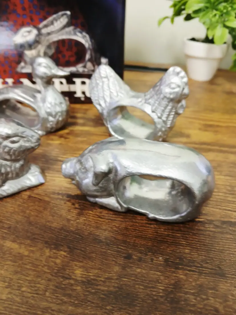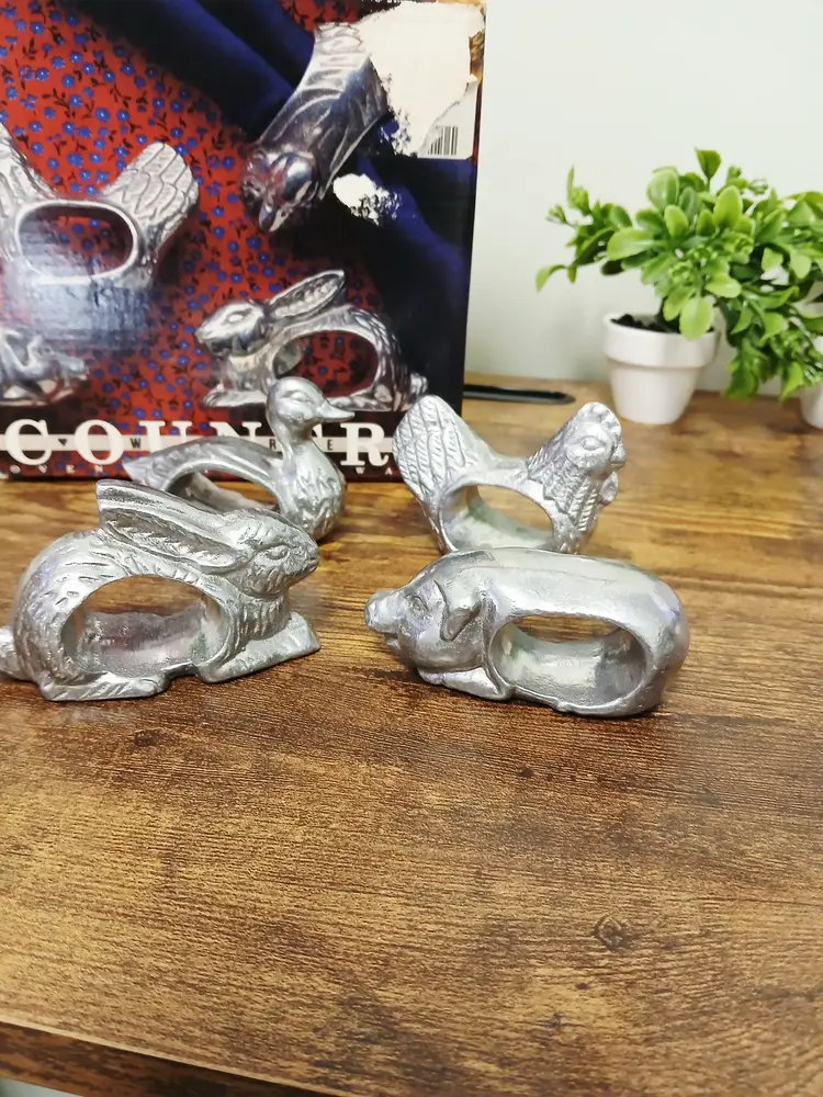 Bring a touch of whimsy to your dining table with this vintage pewter napkin ring set featuring charming animal designs. Perfect for collectors or as a unique tabletop decor piece, these rings add character to any meal setting. Includes four distinct animal shapes.
