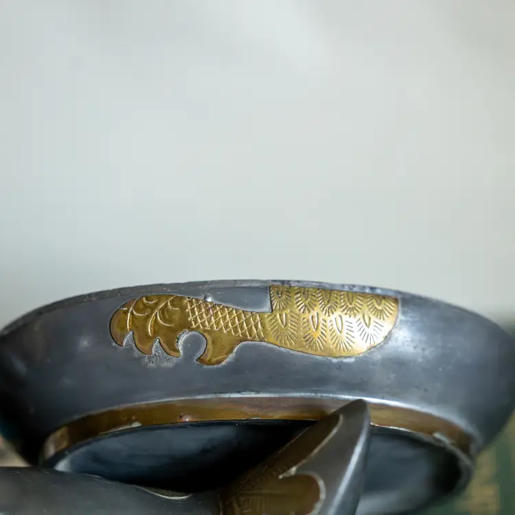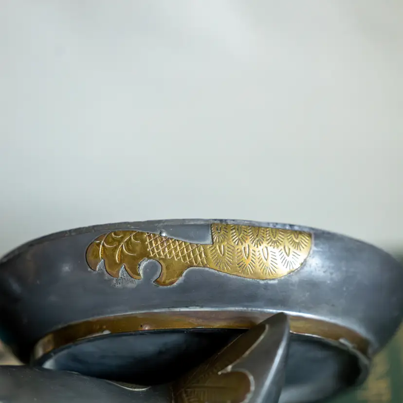 Brass inlays are intact and add a warm contrast to the pewter finish