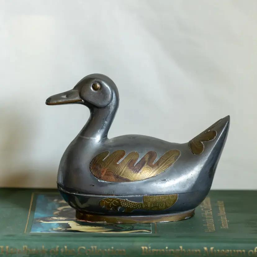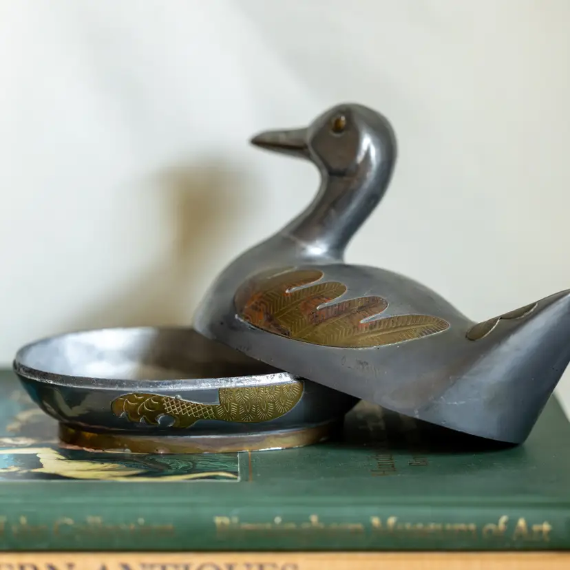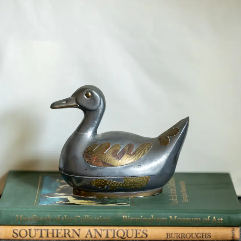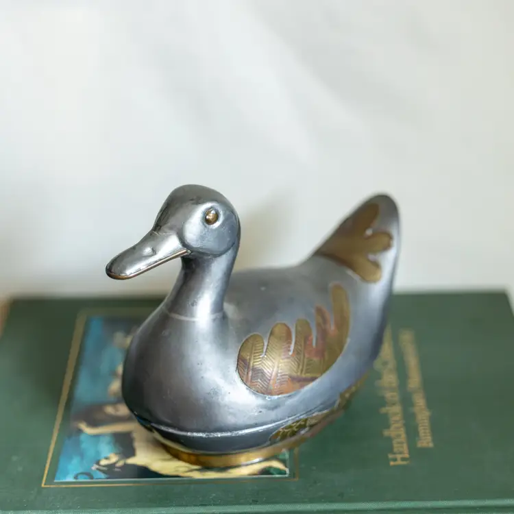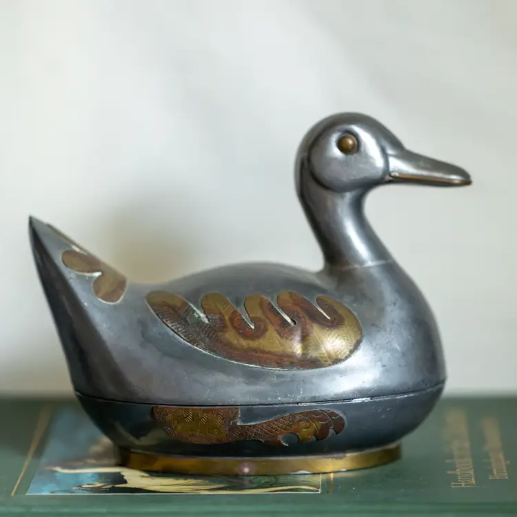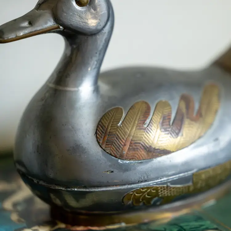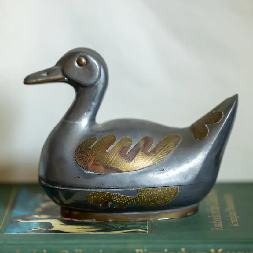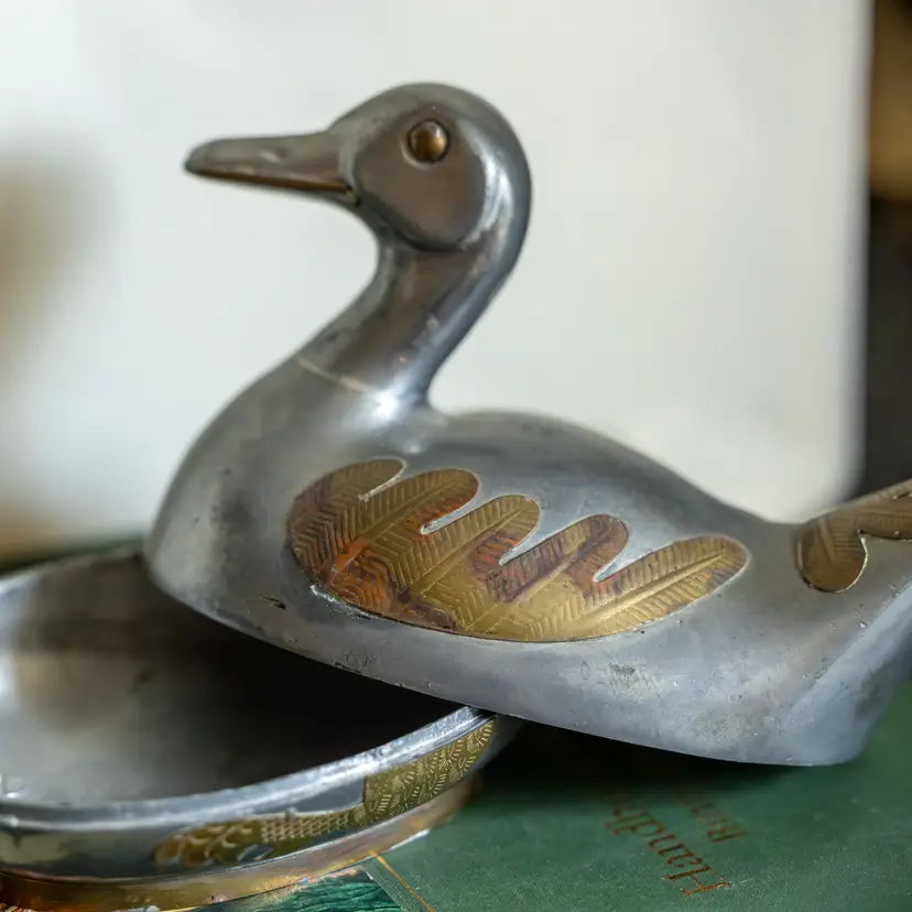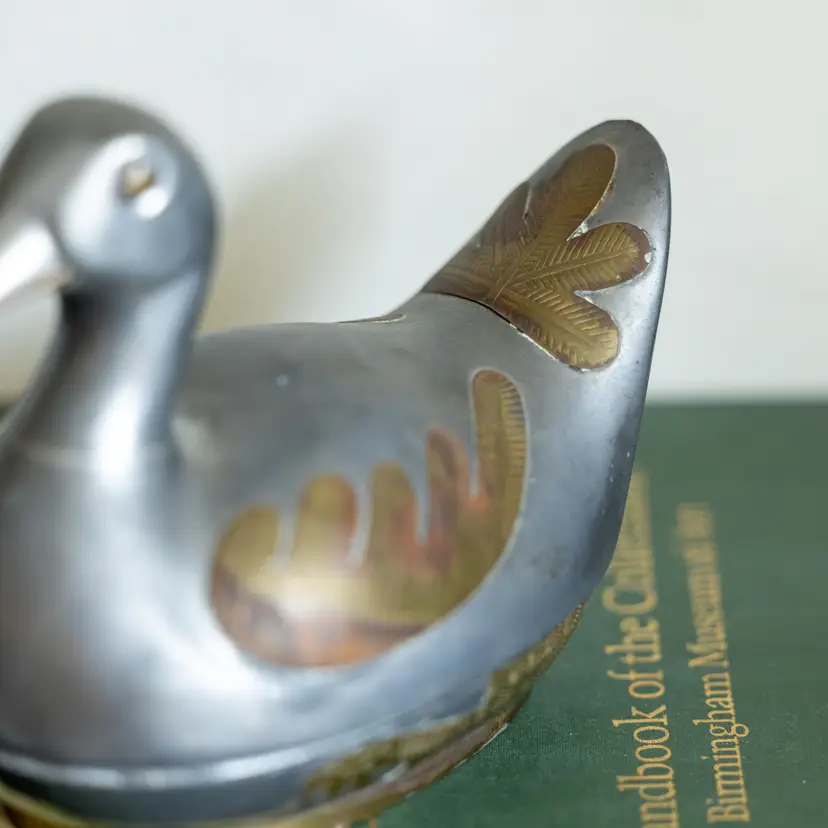 Add a touch of whimsy and charm to your space with this vintage pewter and brass duck trinket box. Beautifully crafted with intricate brass inlays on the wings and tail, this decorative duck opens at the center to reveal a small compartment perfect for storing jewelry, keepsakes, coins, or other tiny treasures.