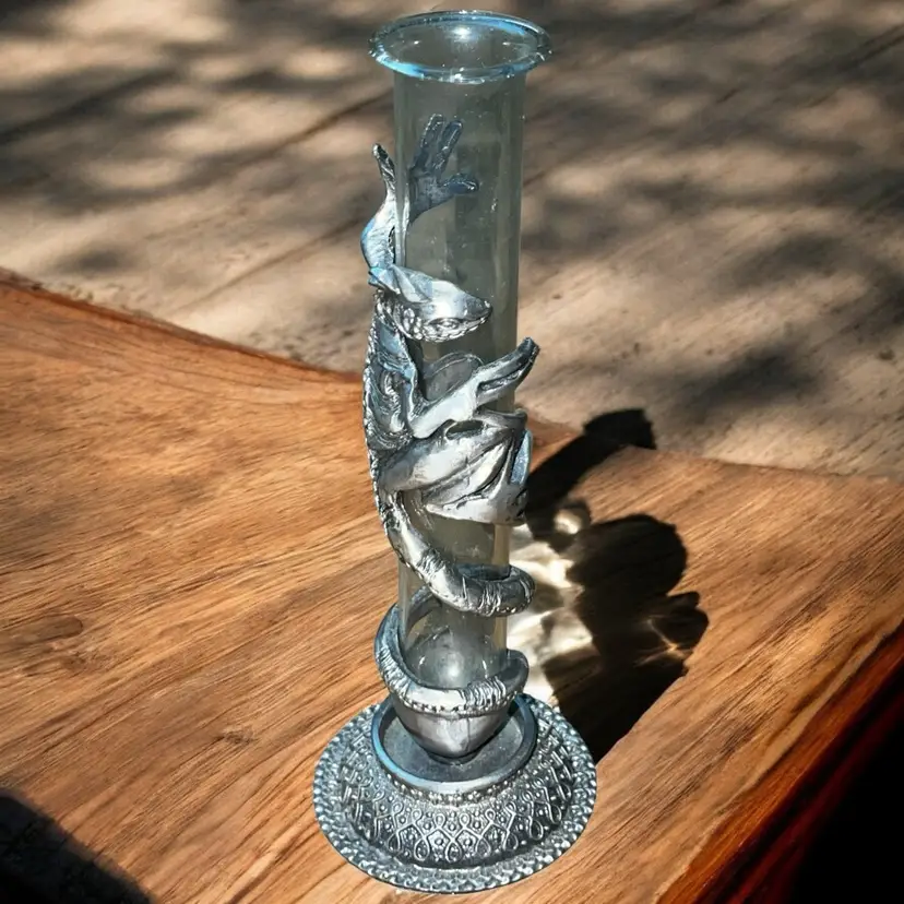 This one-of-a-kind vintage pewter lizard vase features a sculpted reptile realistically clinging to a removable glass vial. The detail is incredible—from the coiled tail and textured spine to the gripping fingers and alert head, this piece is equal parts art and function.