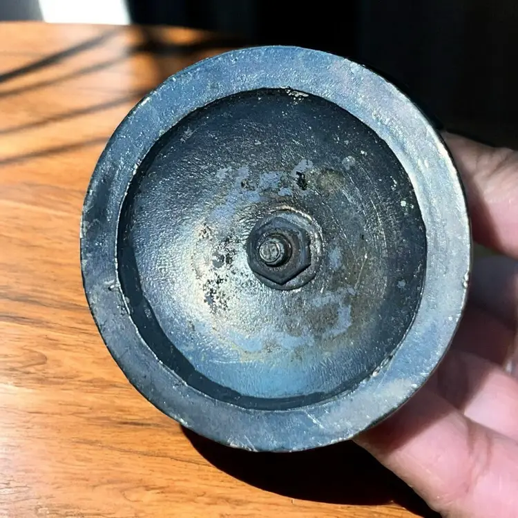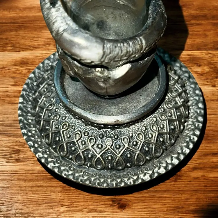 The textured metal base is richly detailed with an ornate pattern and measures approx. 2” across. There is minor patina and some age-related discoloration on the pewter, which only adds to the vintage charm.